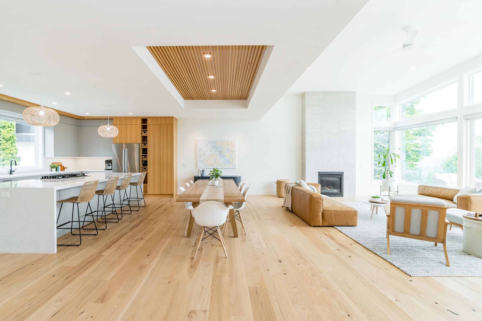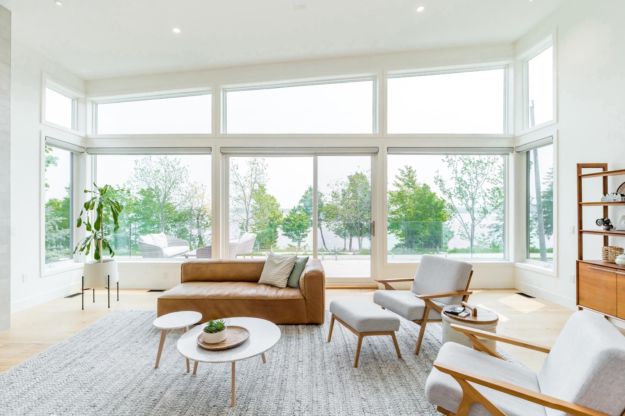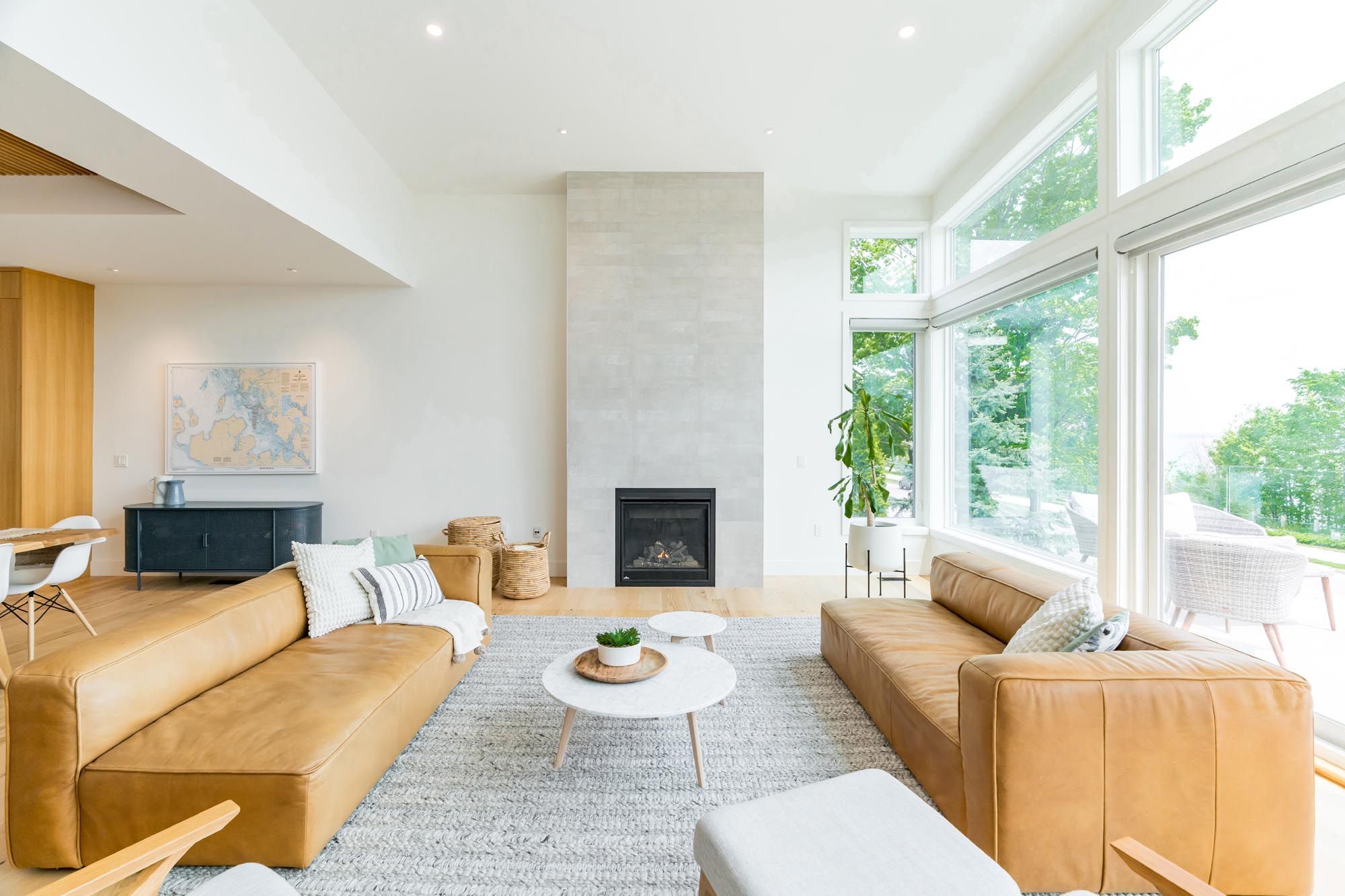 • Grand living room with gas fireplace and stunning lake views.