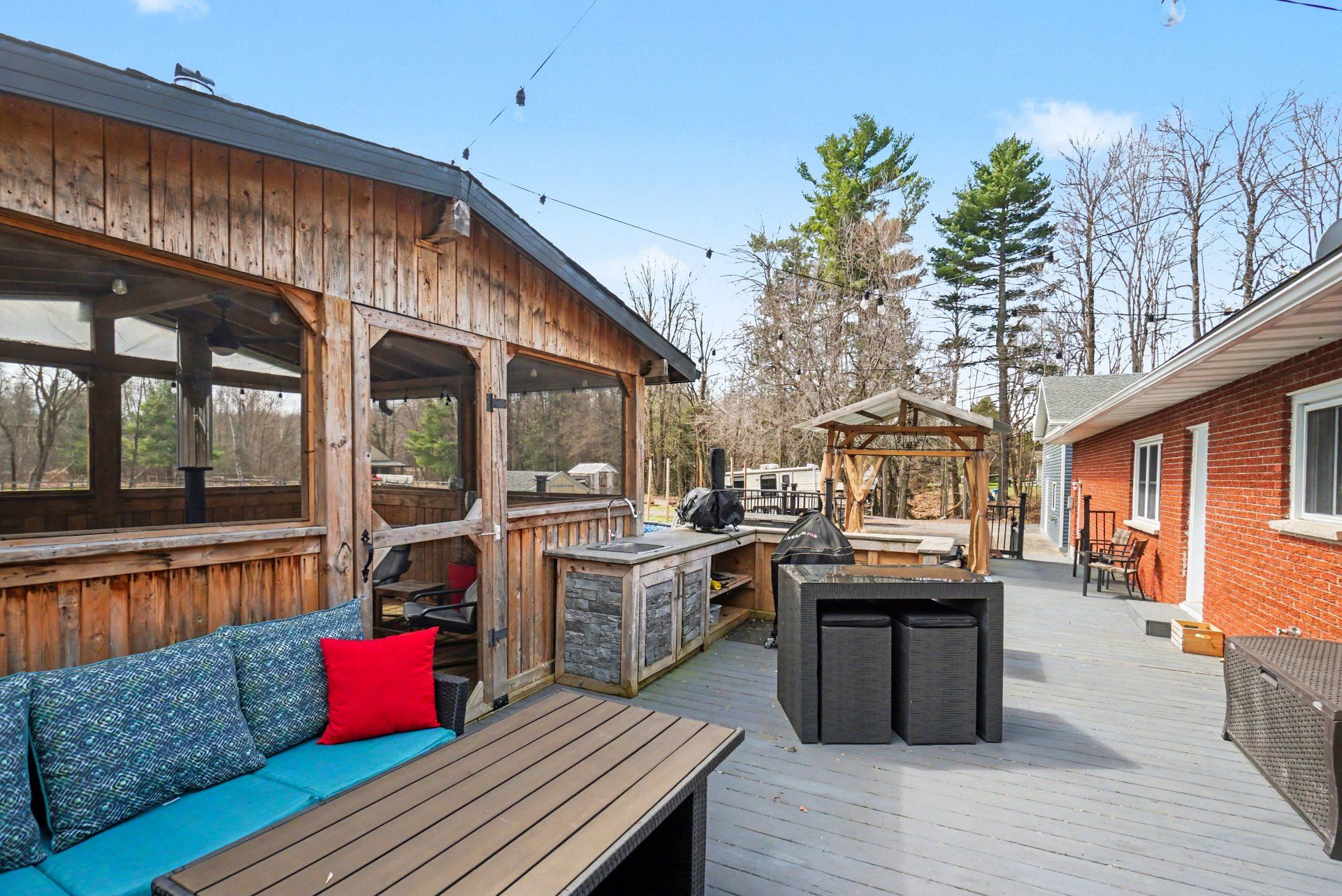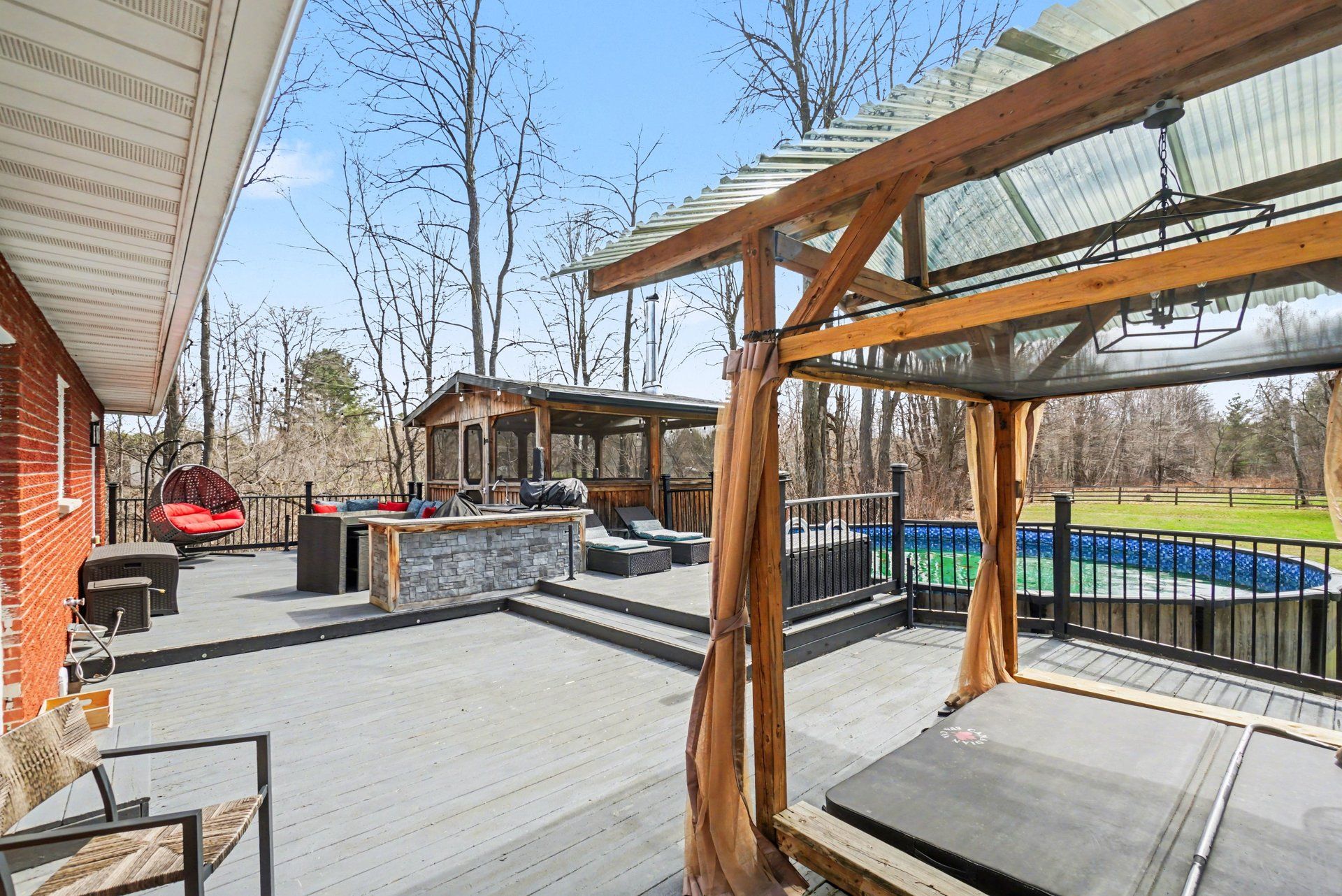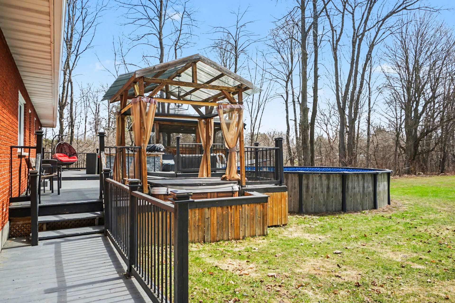 • Outdoor space features a pool, hot tub, gazebo, and spacious deck.