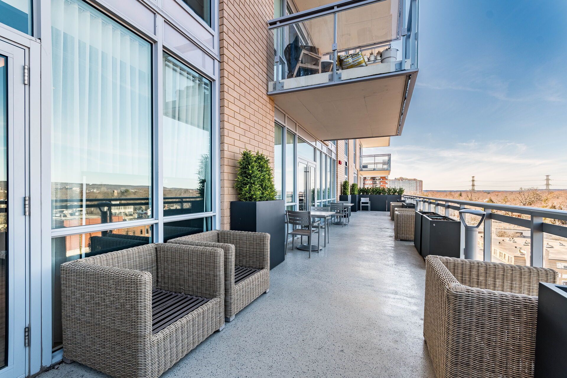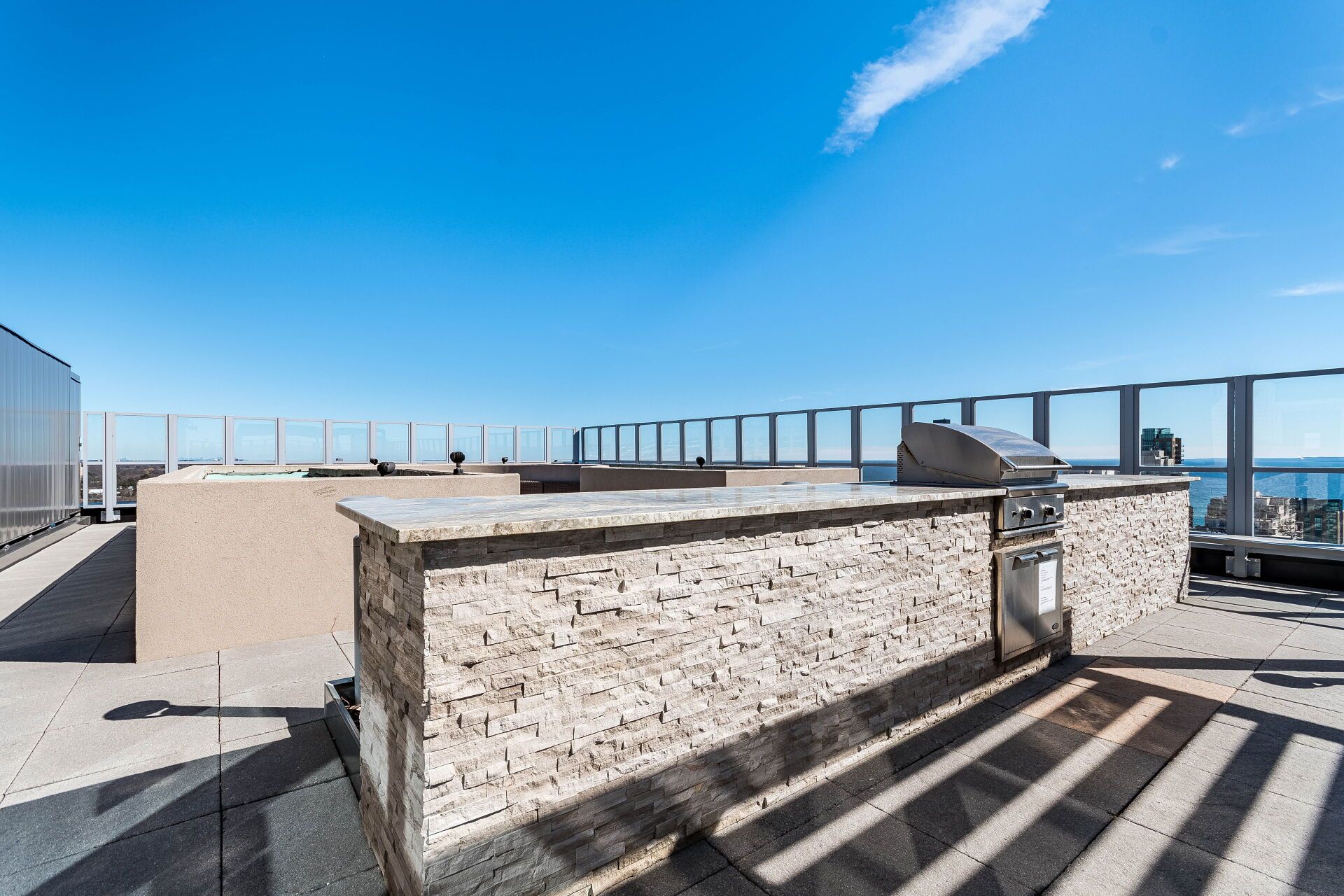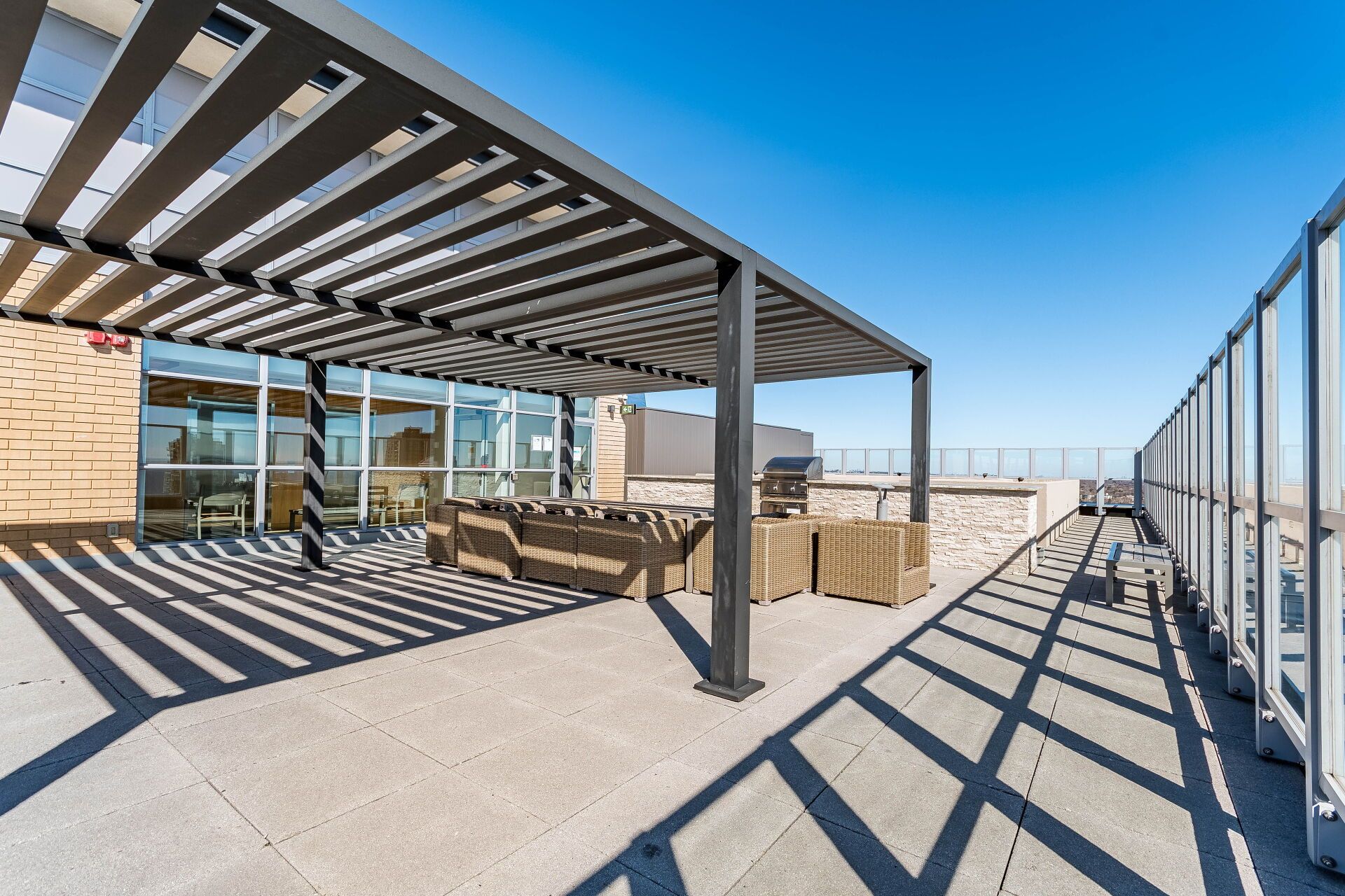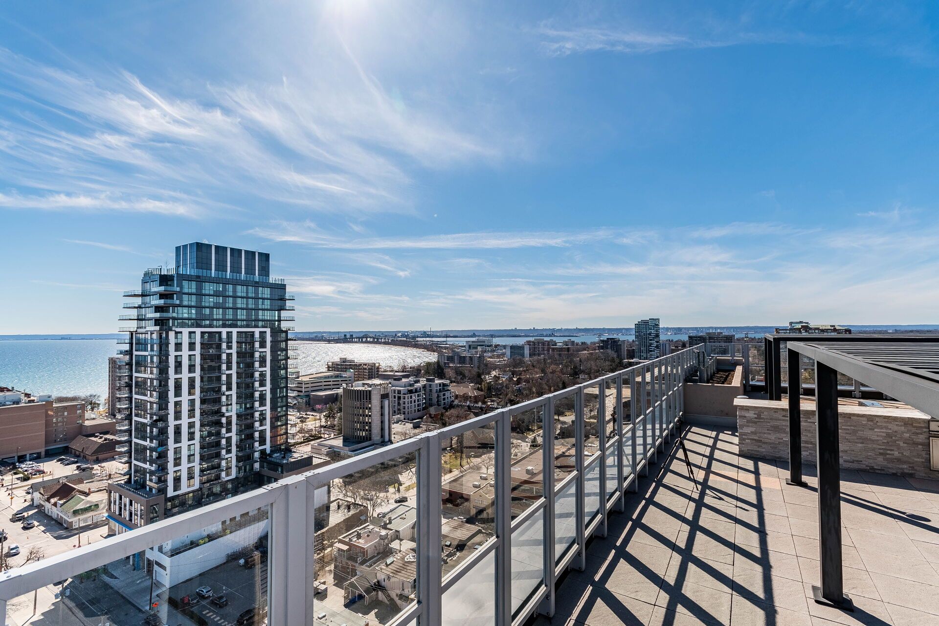 • Amenities include fitness center, party room, and rooftop terrace with views.