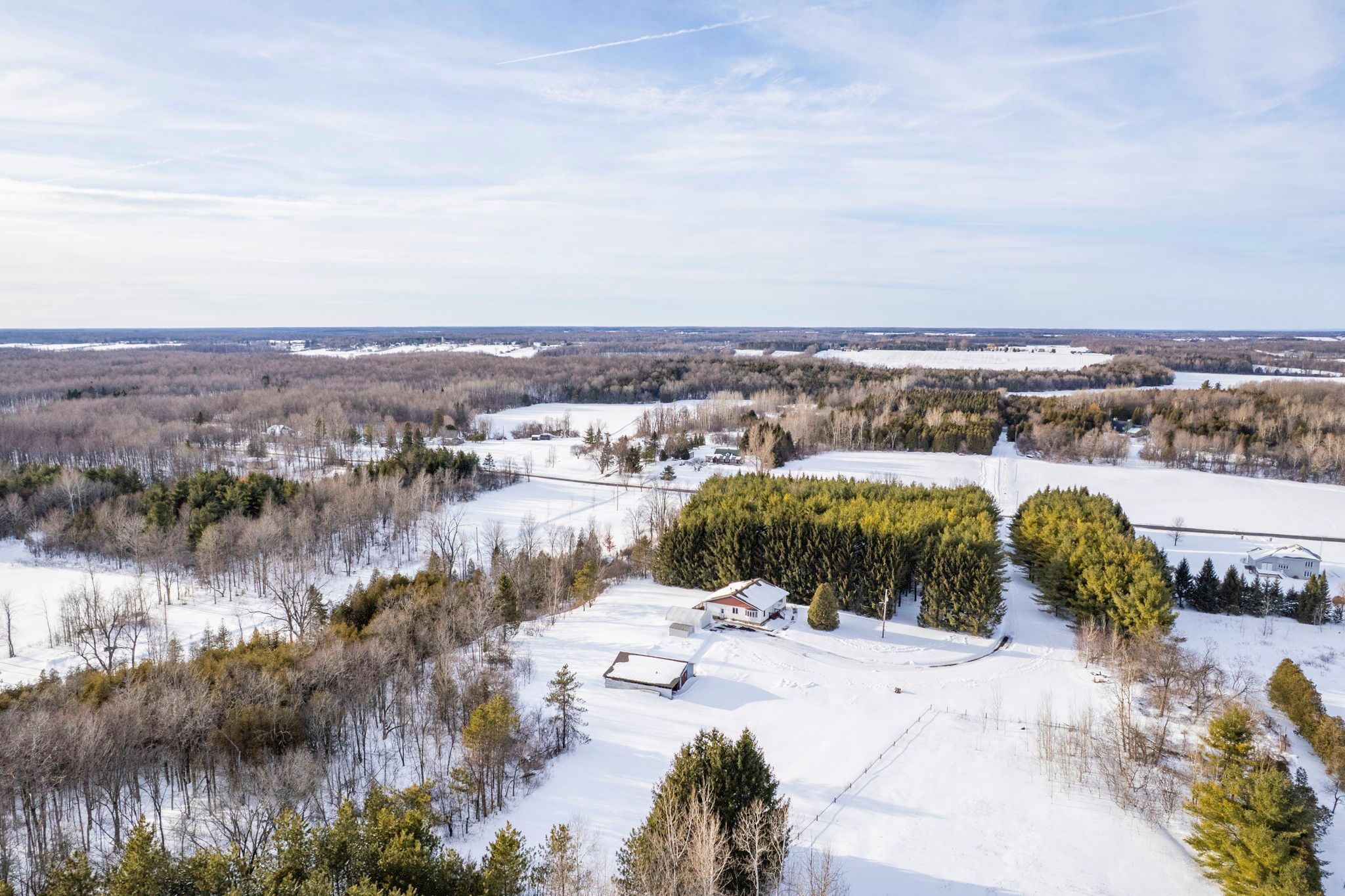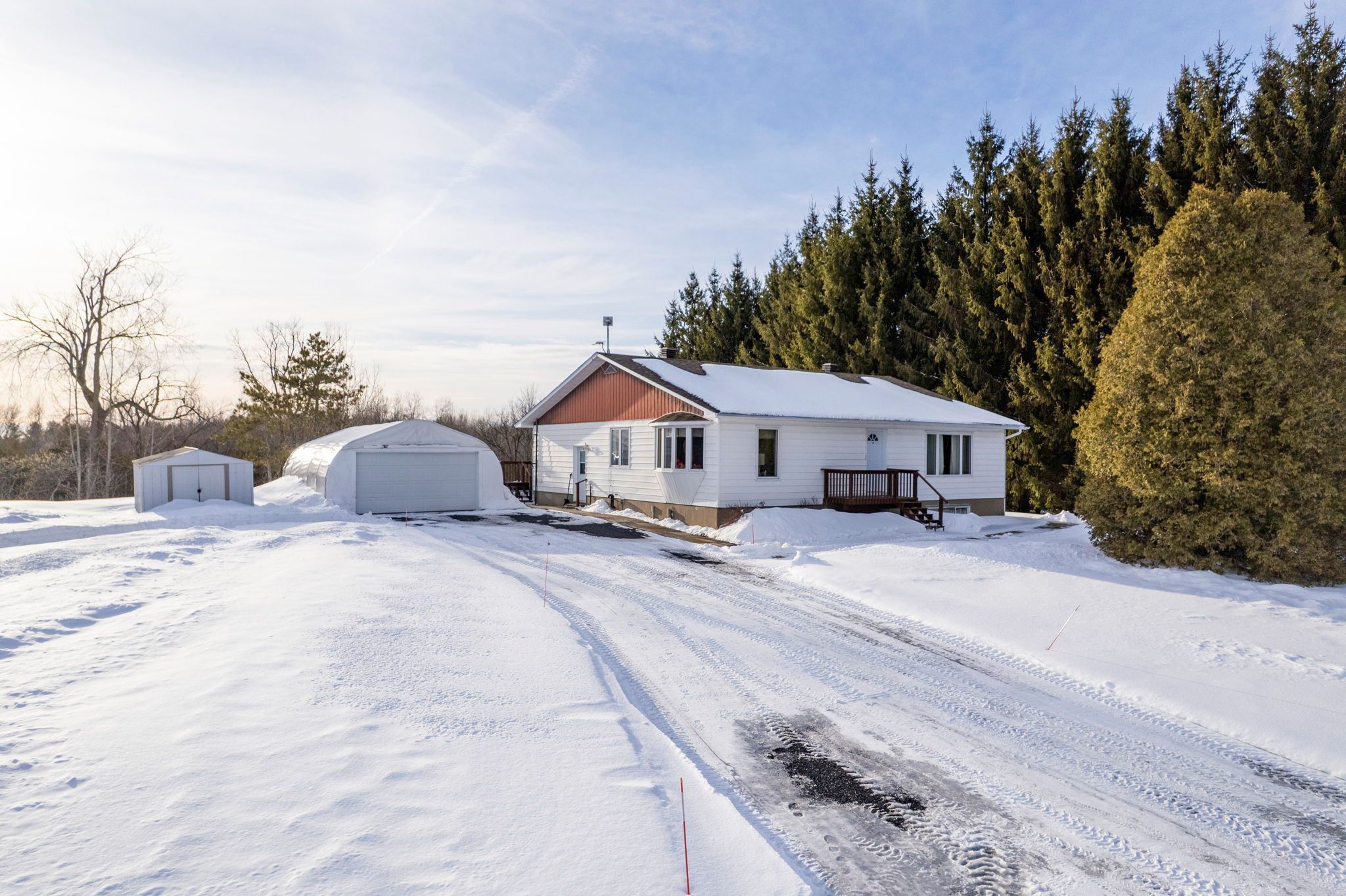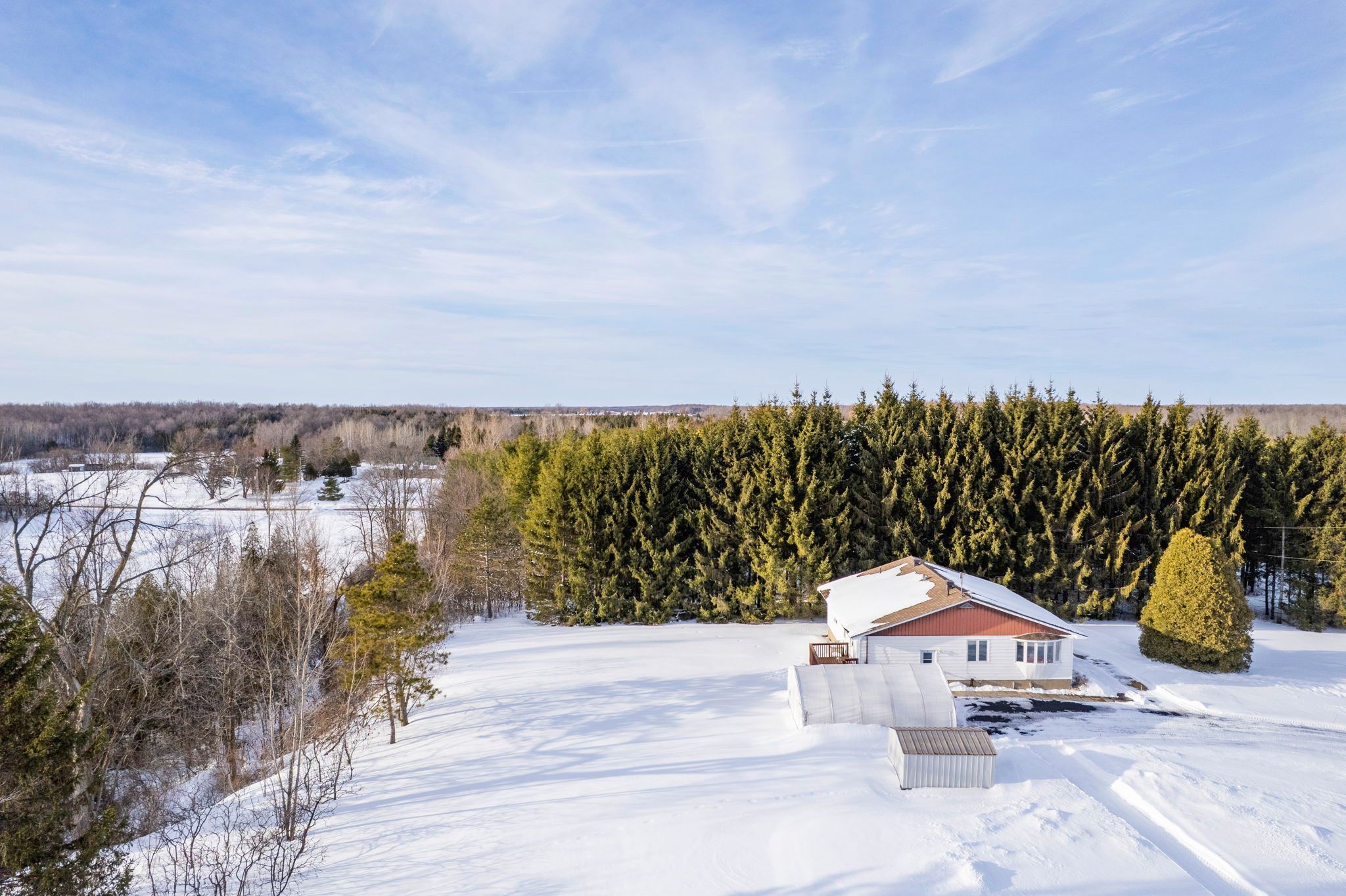 Private country bungalow on 8 acres! Set well back from the road on a peaceful 8-acre parcel, this versatile 3+2 bedroom bungalow offers privacy, space, and the kind of natural setting that feels increasingly rare. The partially treed lot is a beautiful mix of white spruce, red pine, and white pine, creating a quiet, secluded backdrop ideal for country living, recreation, or simply enjoying the calm. Inside, the home features a functional oak kitchen with an abundance of cabinetry, flowing seamlessly into the dining area for easy everyday living. Multiple living spaces include both a living room and a family room, offering flexibility for entertaining, relaxing, or multigenerational use. Primary bedroom with a 3pc en-suite bathroom. 4pc guest bathroom with tub/shower. Main floor laundry adds everyday convenience. The lower level expands the living space featuring two additional bedrooms, rec room with bar, 2pc bathroom (potential 3pc), and home office/den. Outdoors, the property is equally well-equipped with a back deck, a detached enclosed temporary garage plus an impressive 20 ft x 40 ft detached garage/workshop, ideal for vehicles, storage, or projects. A private and picturesque parcel with room to grow, work, and unwind-this property delivers the space and freedom of rural living while offering practical features for everyday life. As per seller direction allow 24 hour irrevocable on offers.