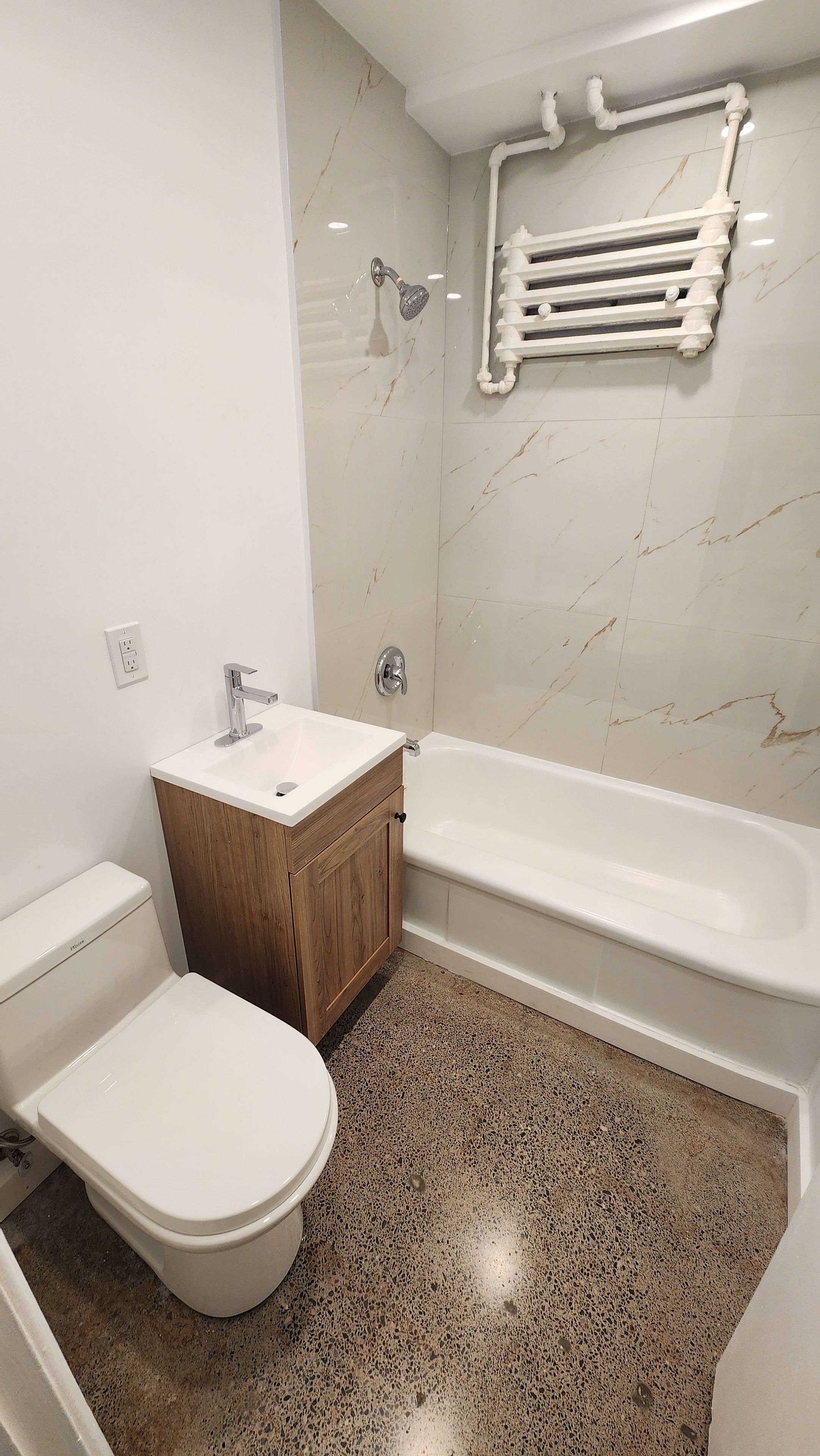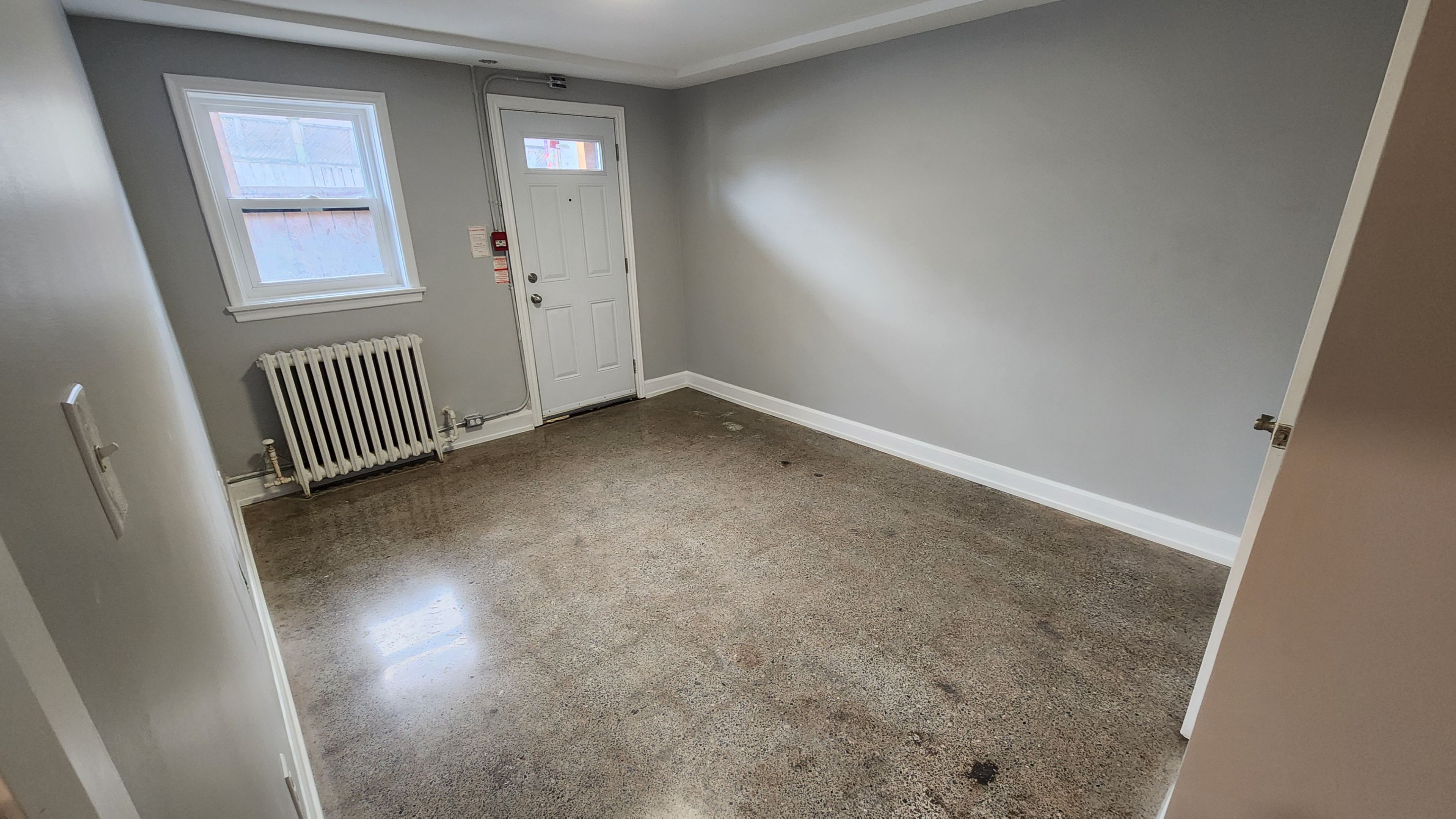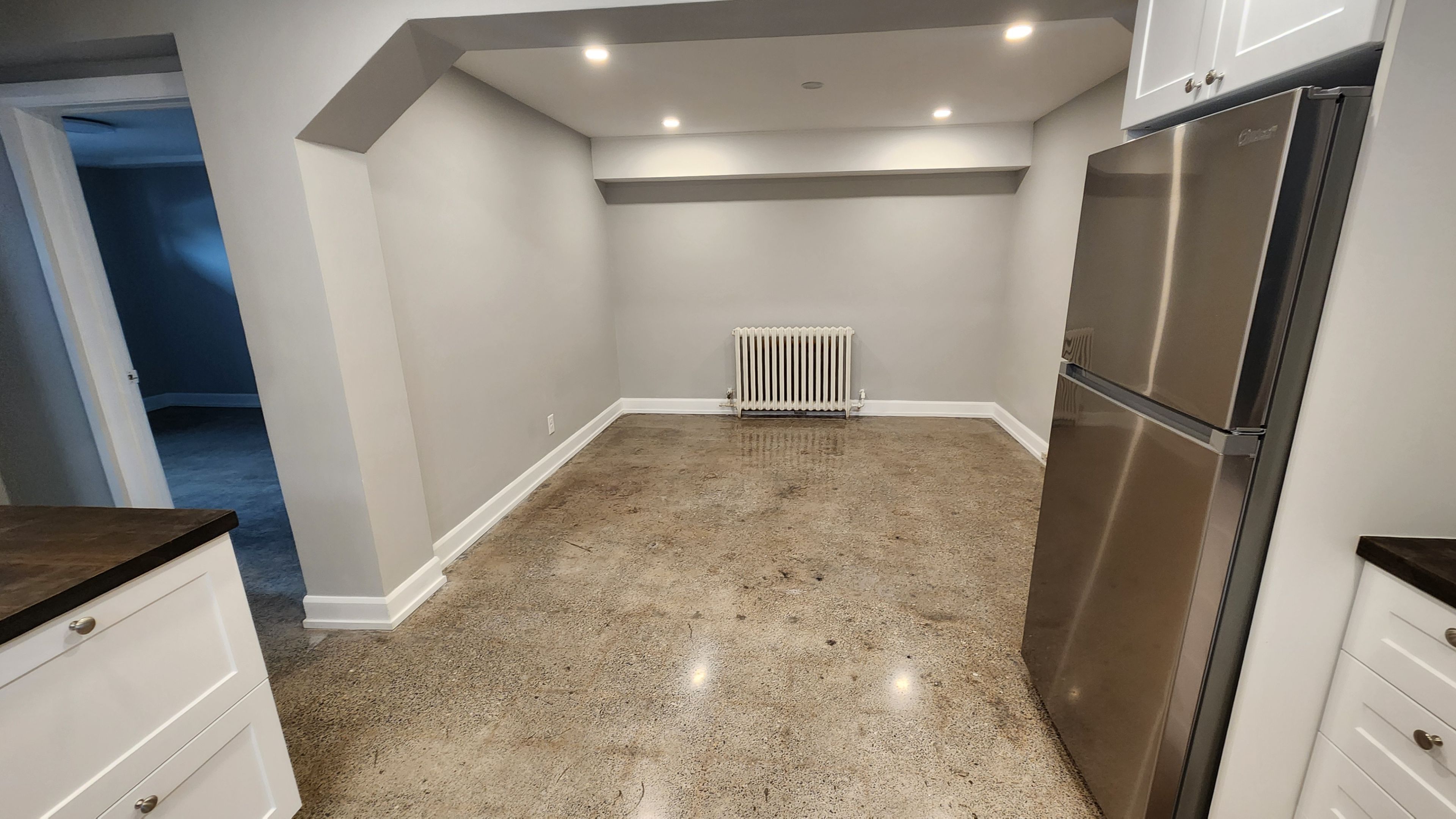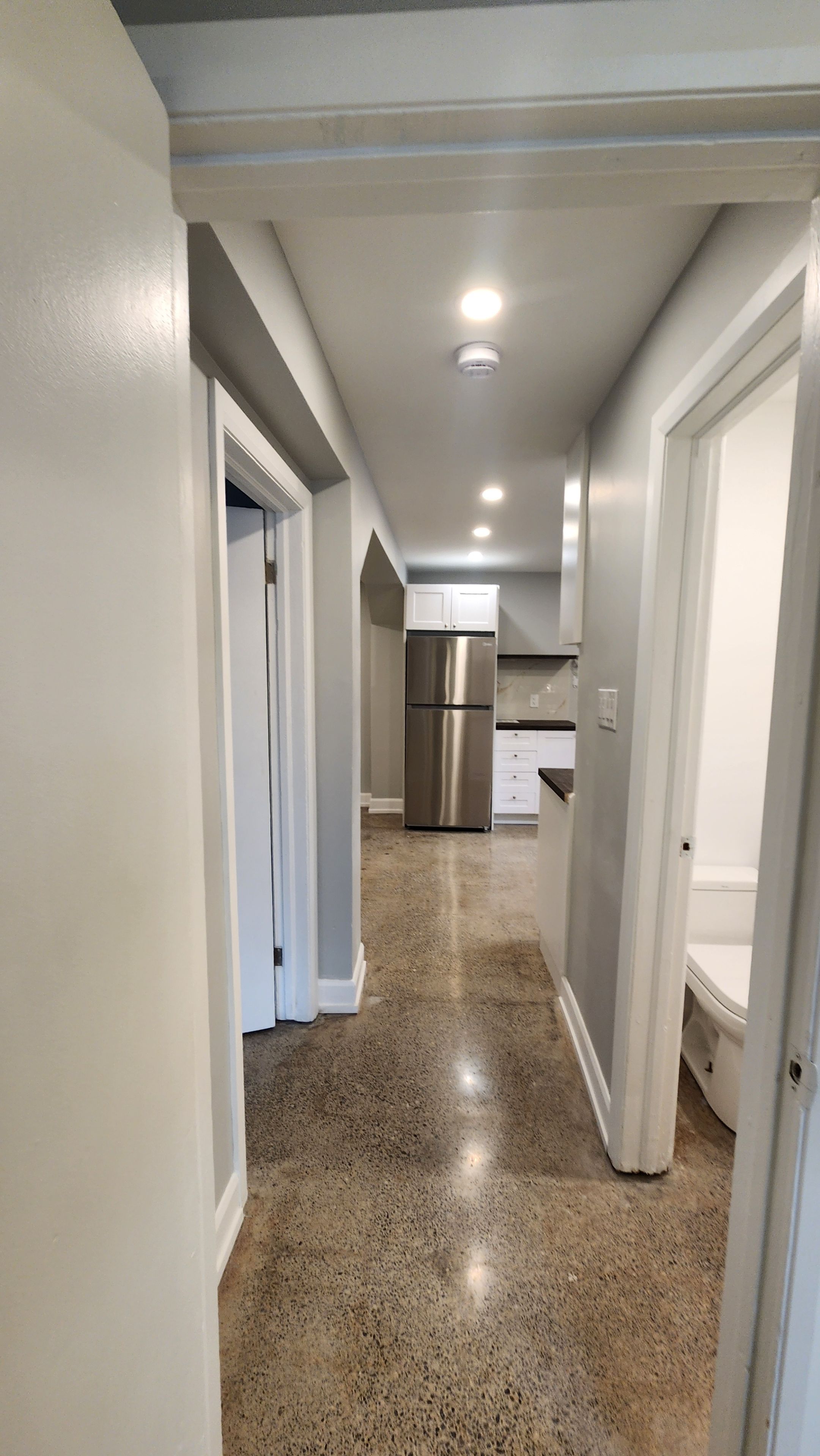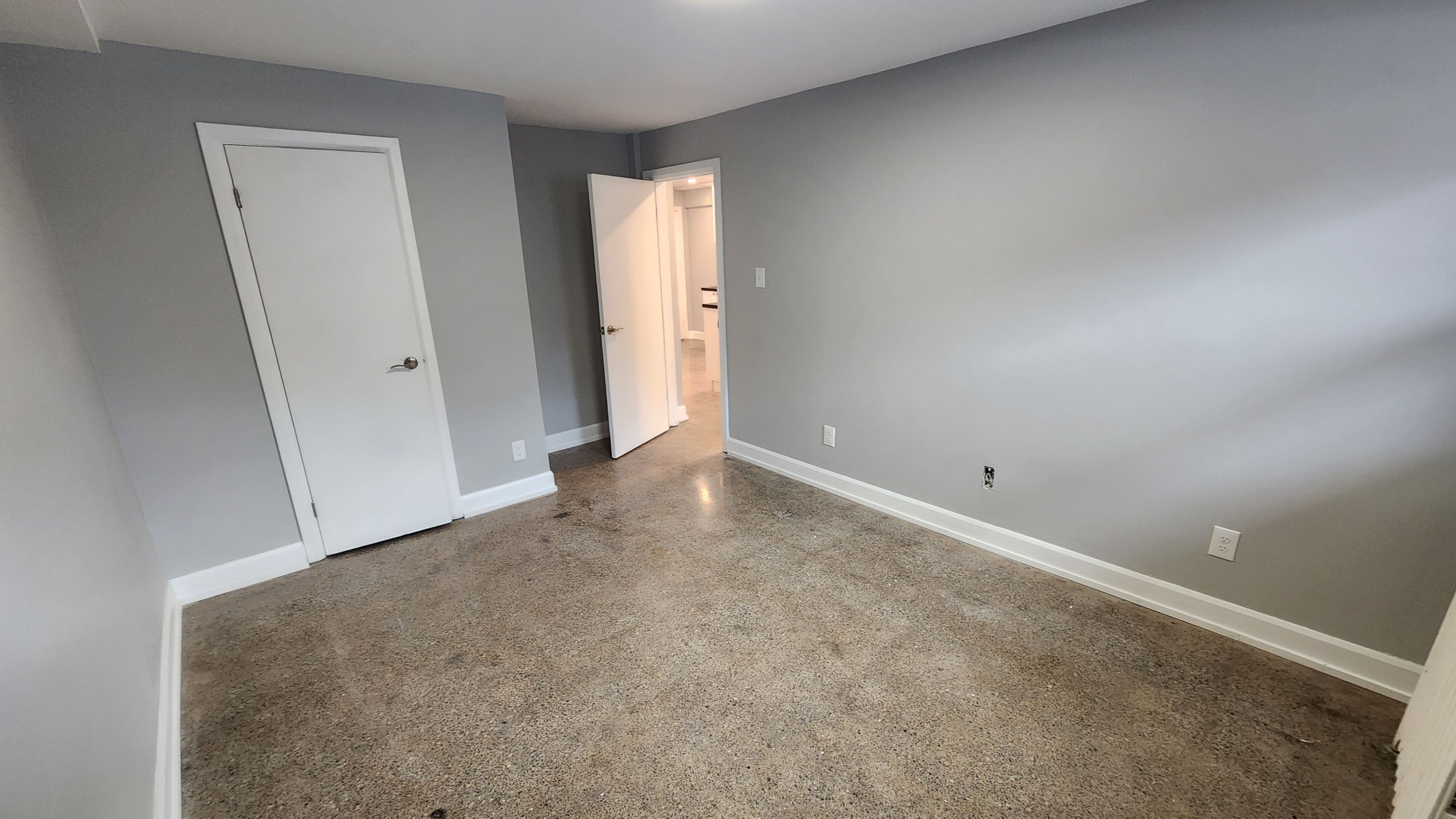 • Polished concrete floors add a sleek touch throughout the unit.