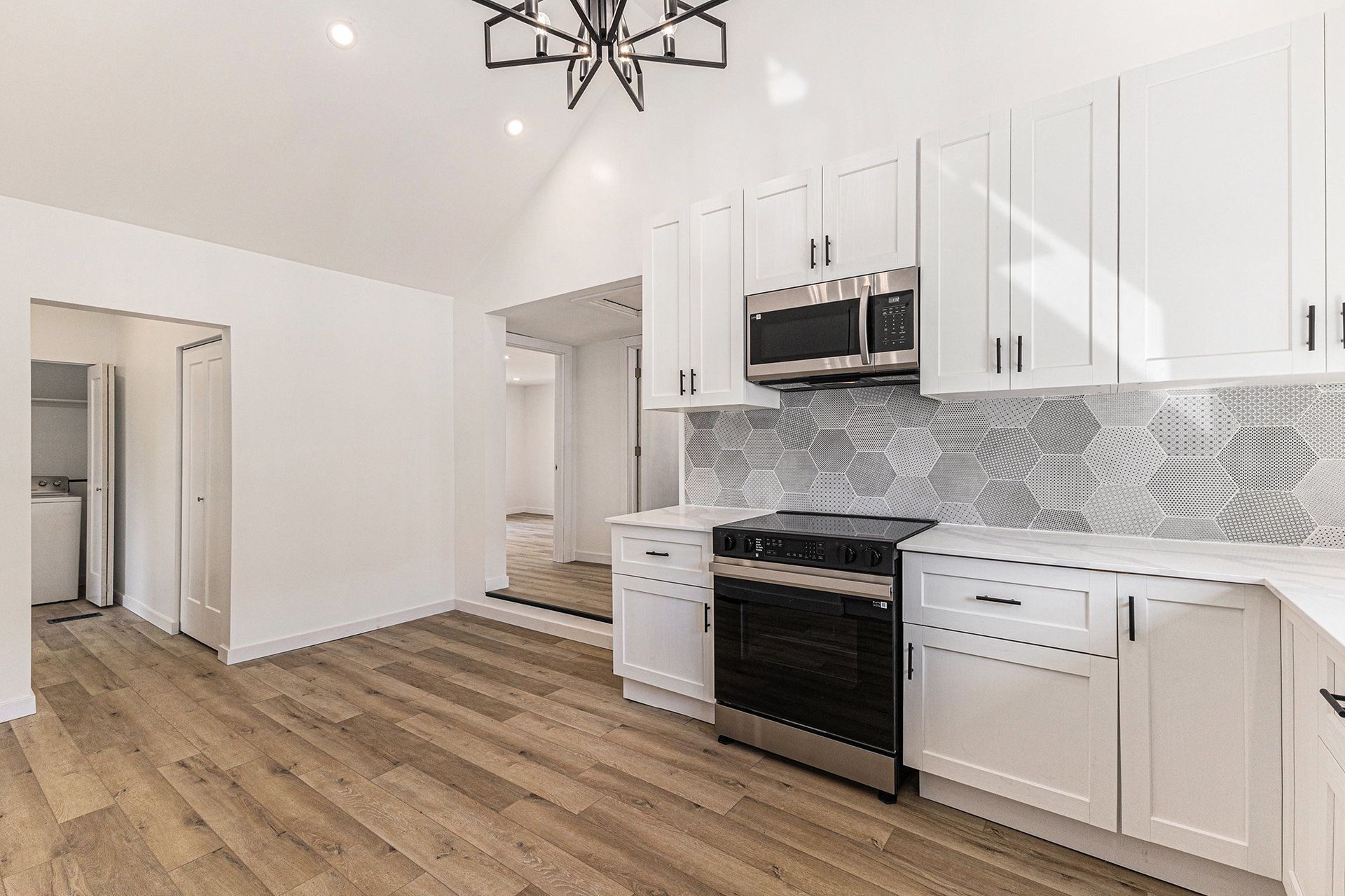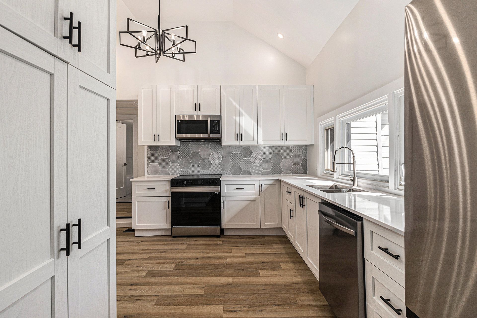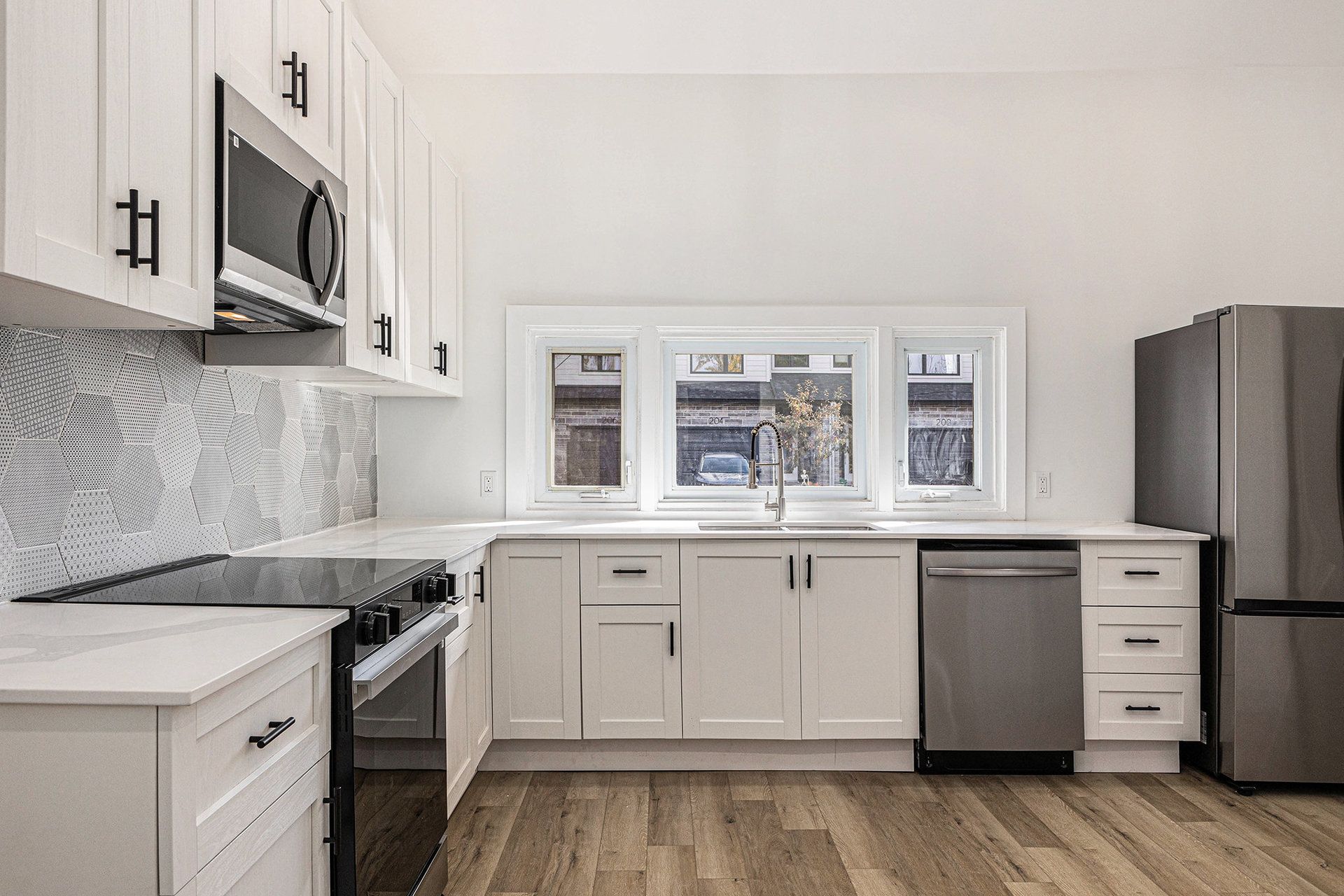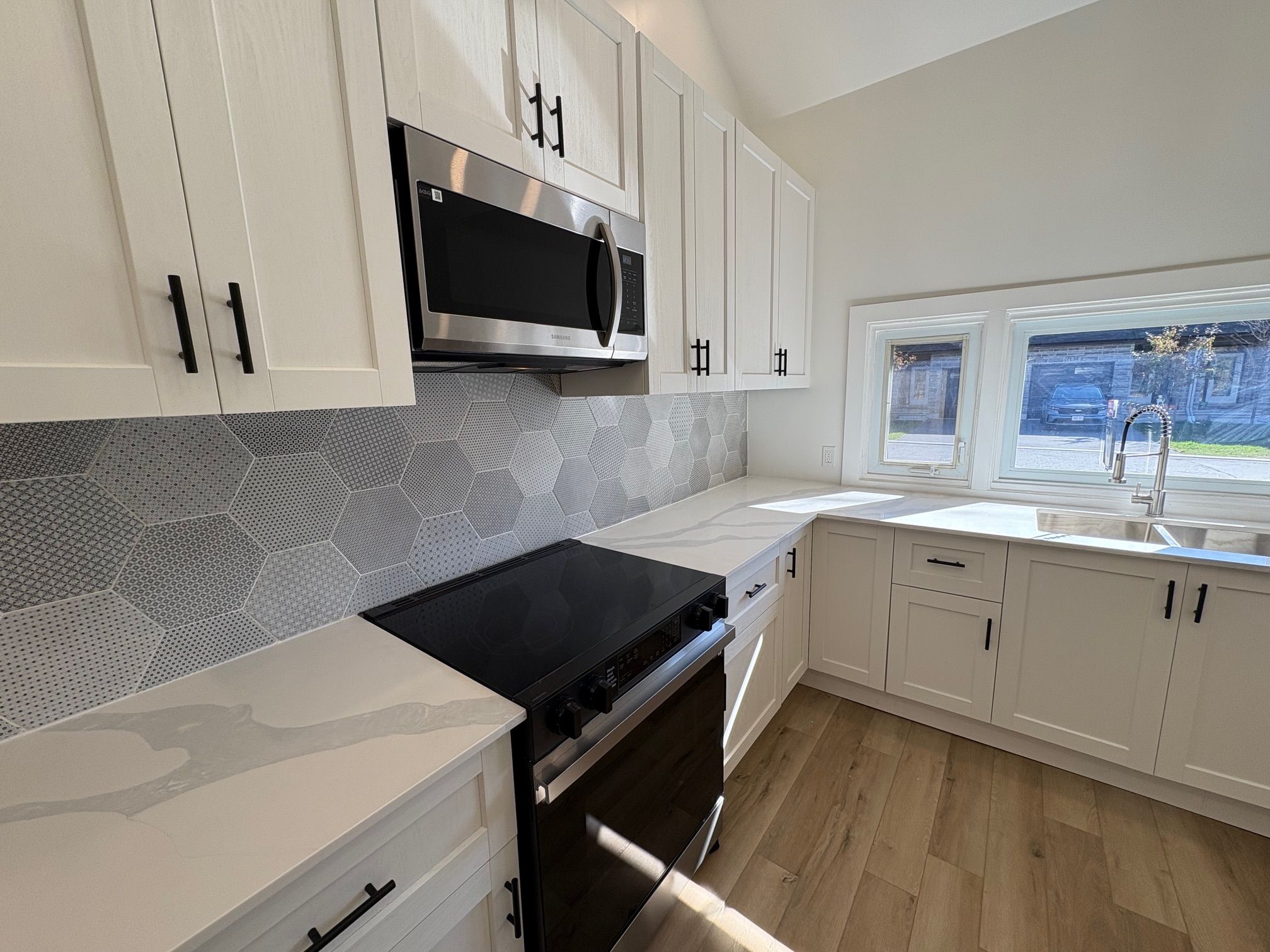 • Modern chef's kitchen with new appliances and quartz countertops.