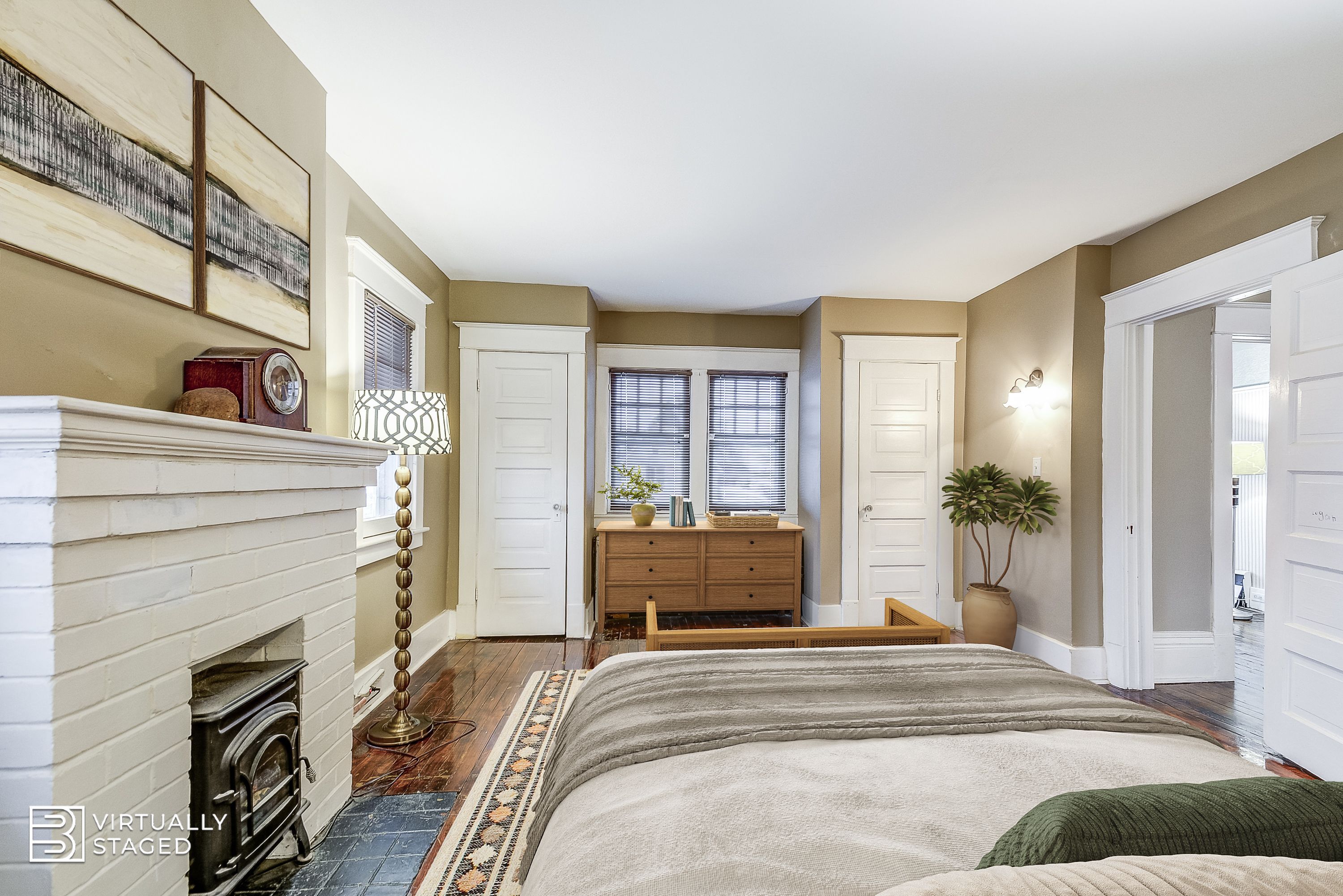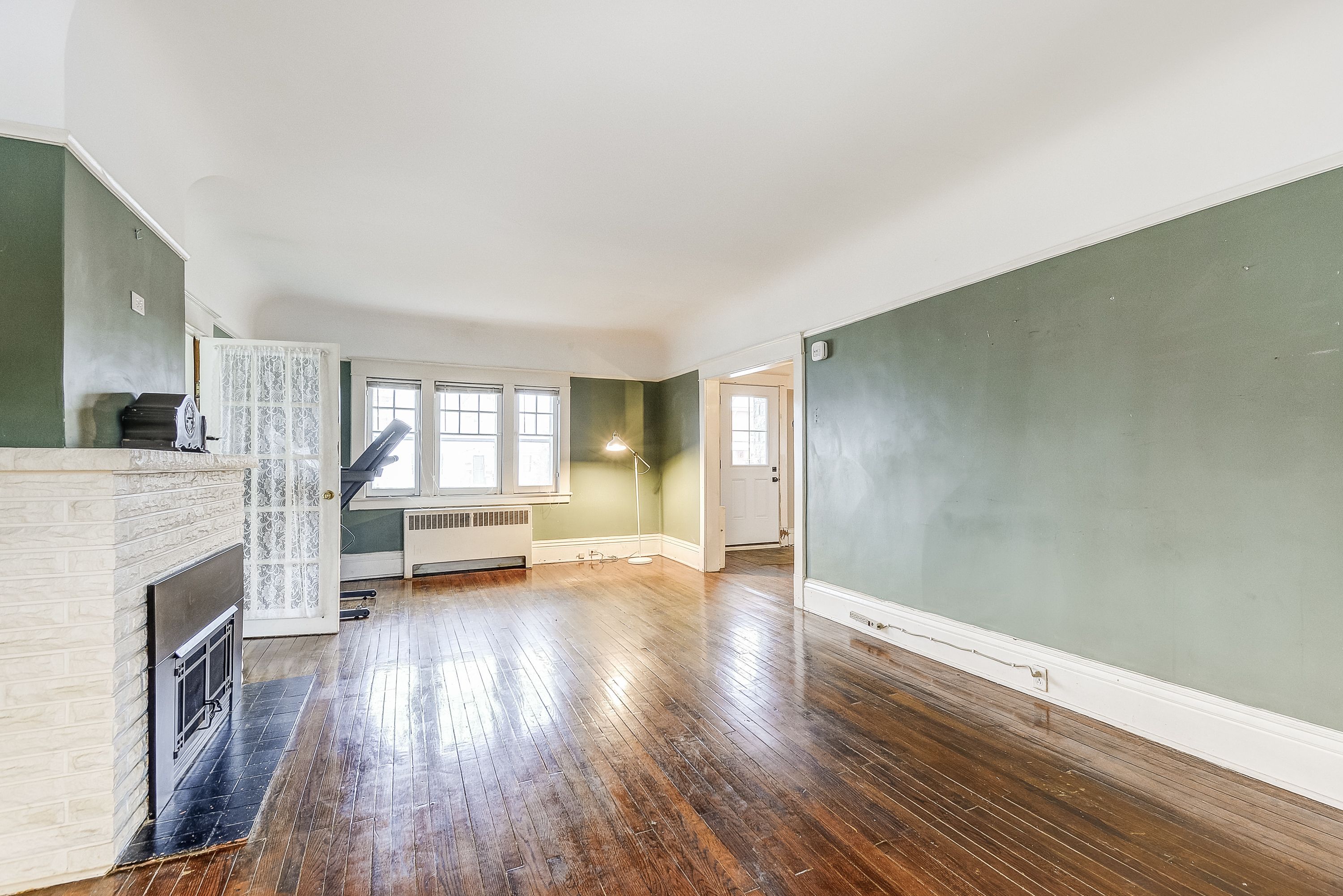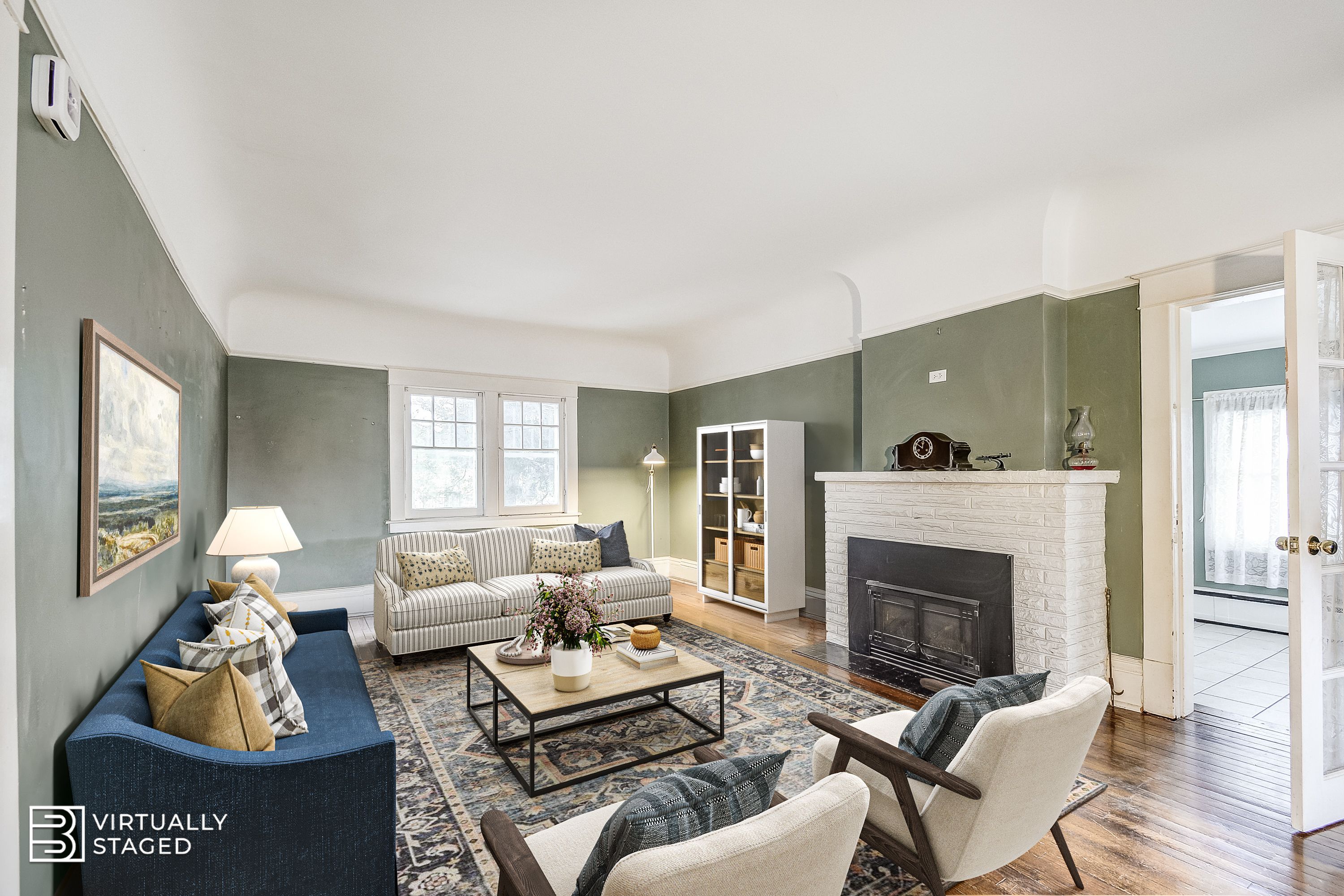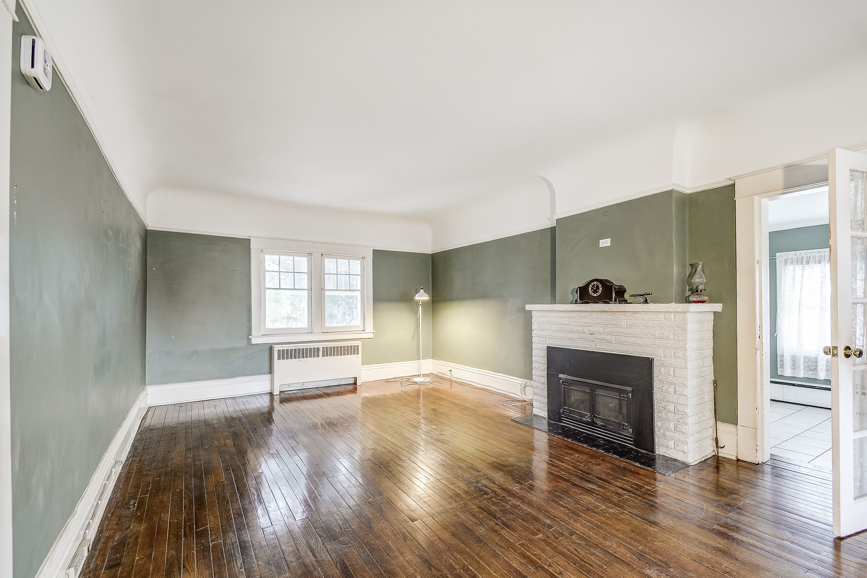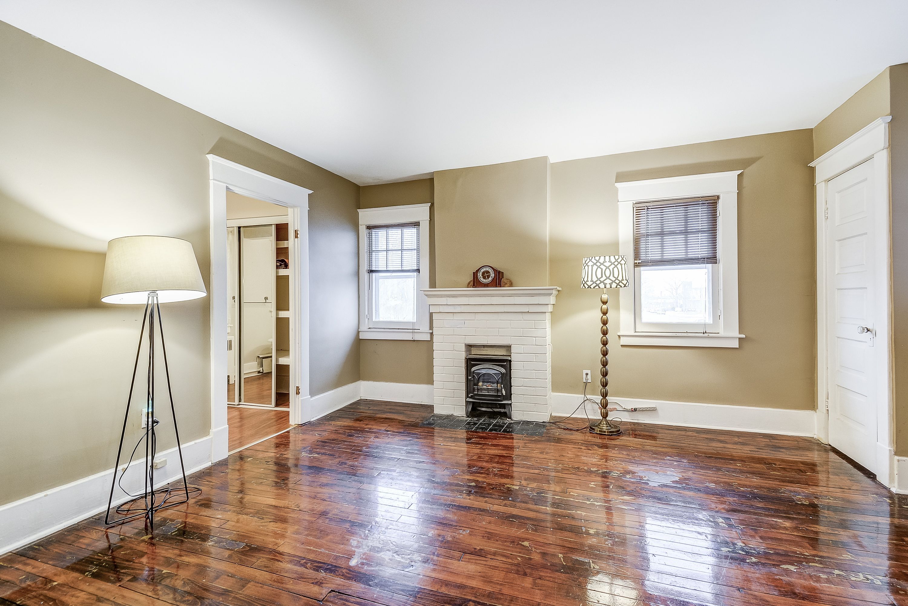 • Character-filled living room with gas fireplace and original hardwood floors.