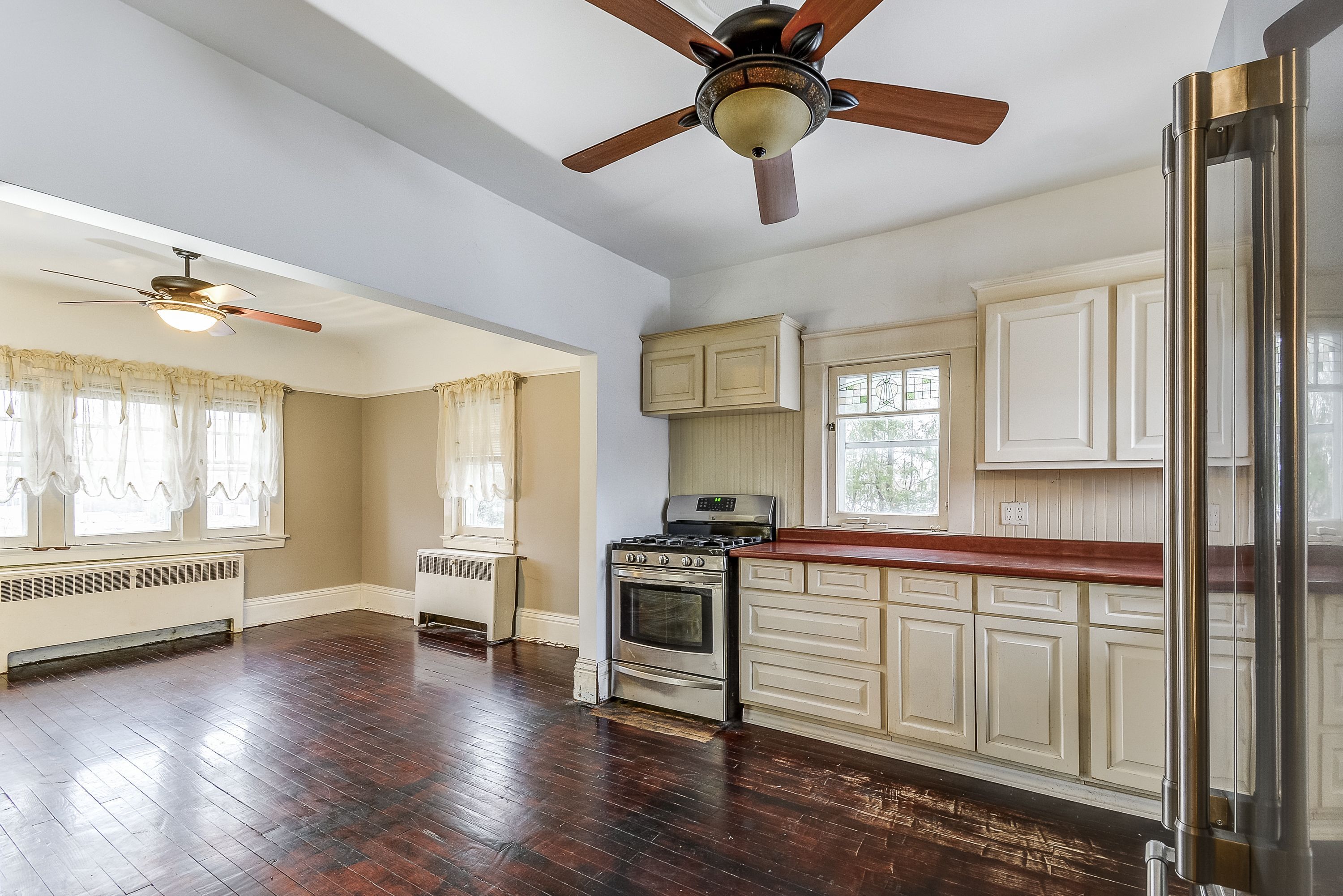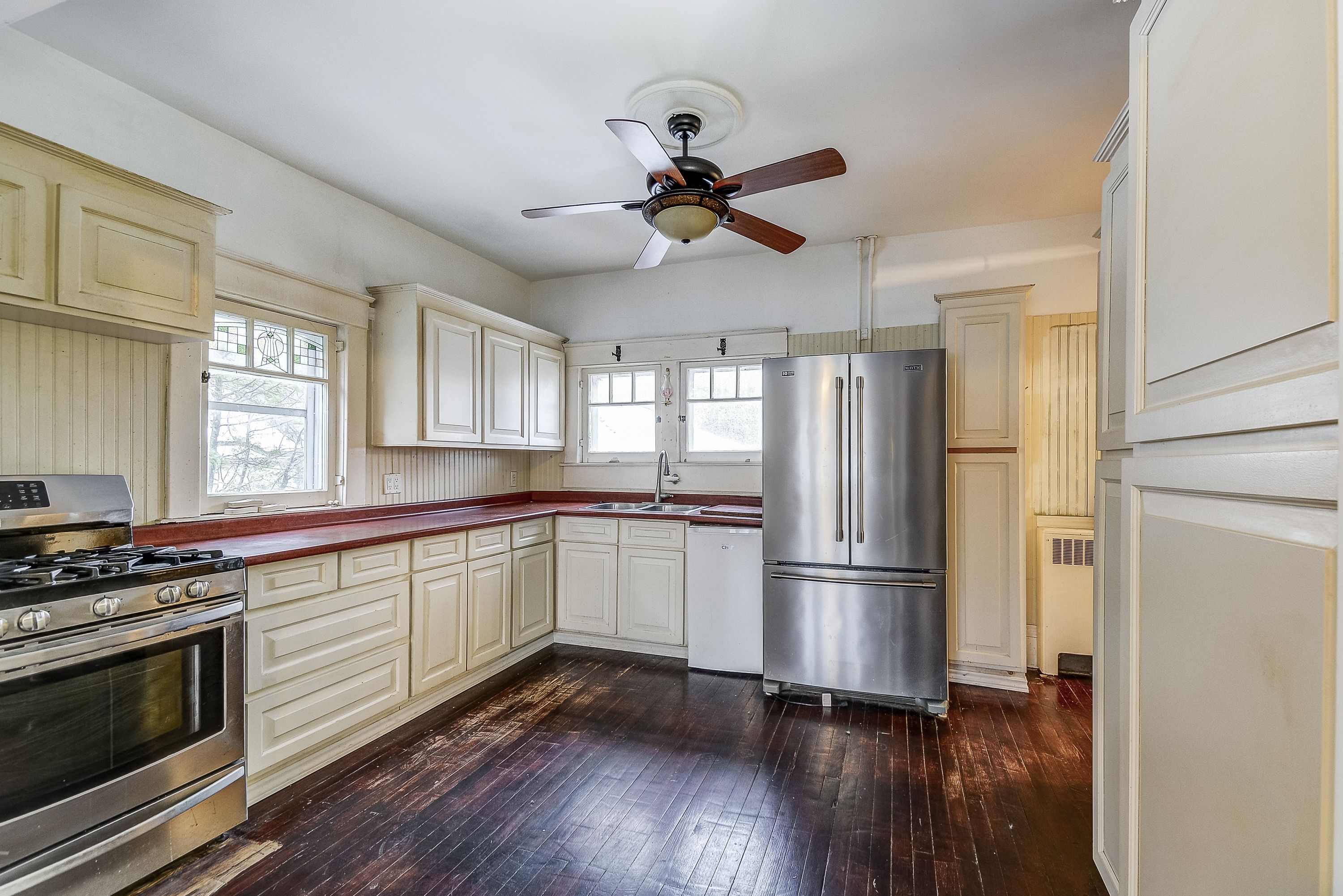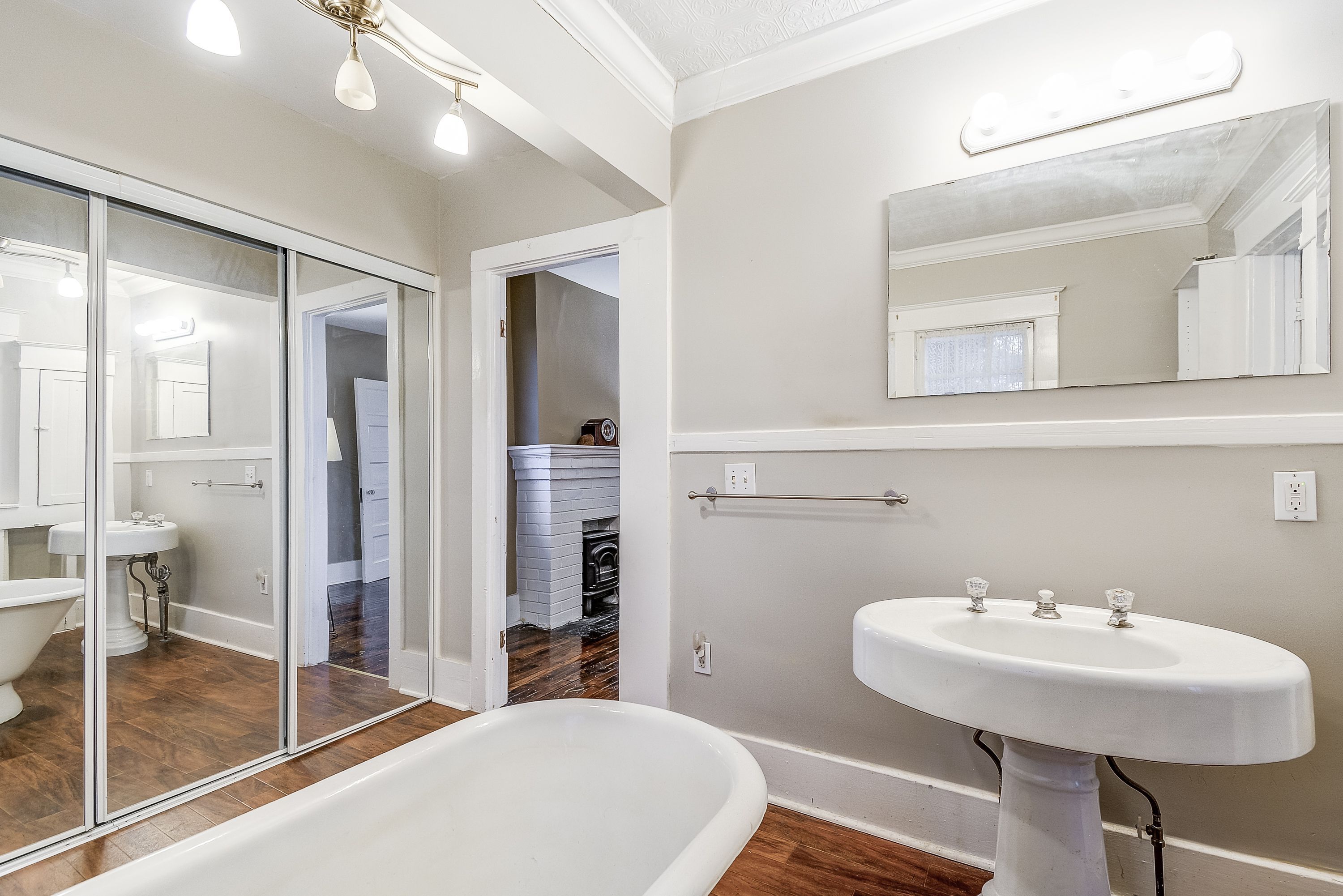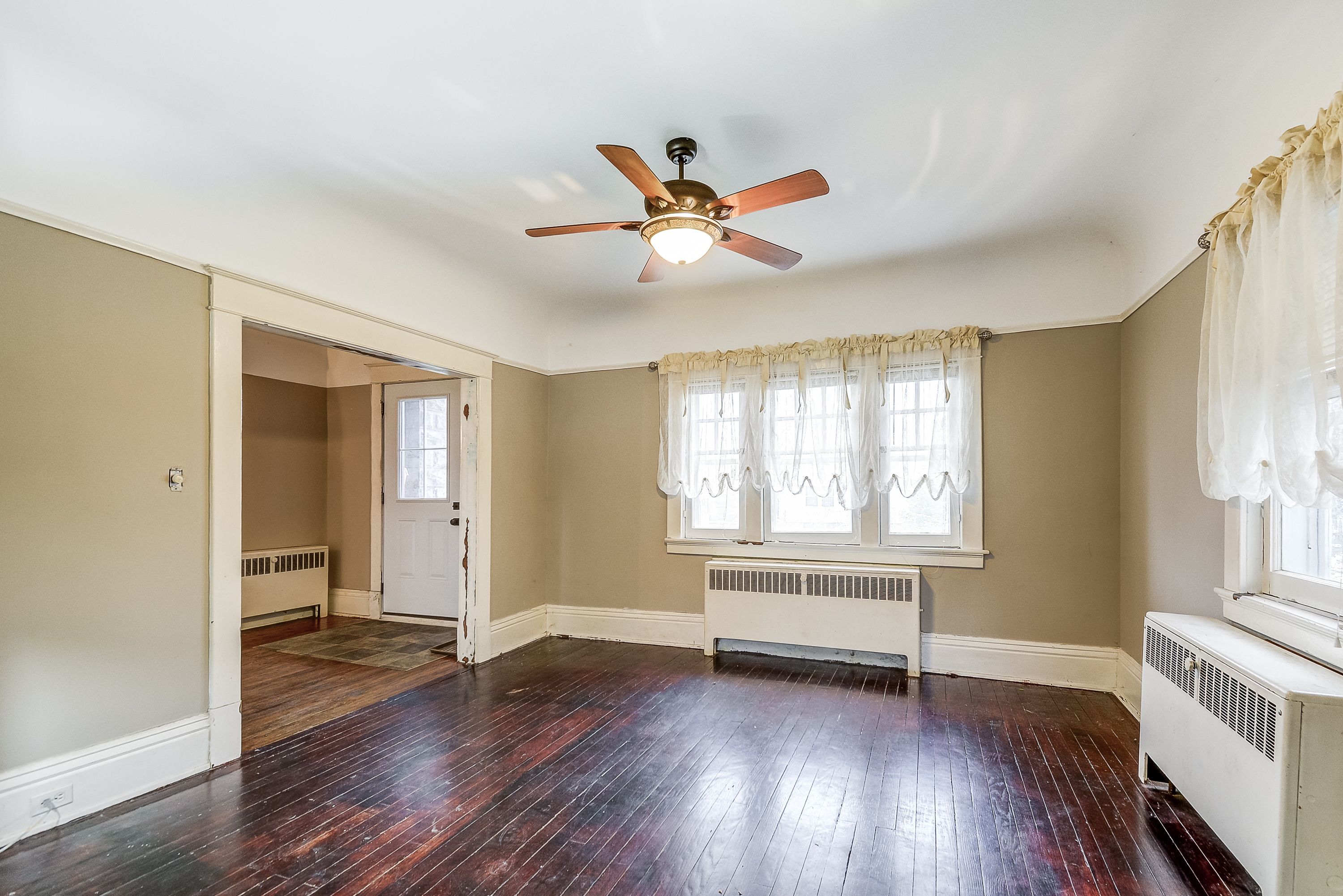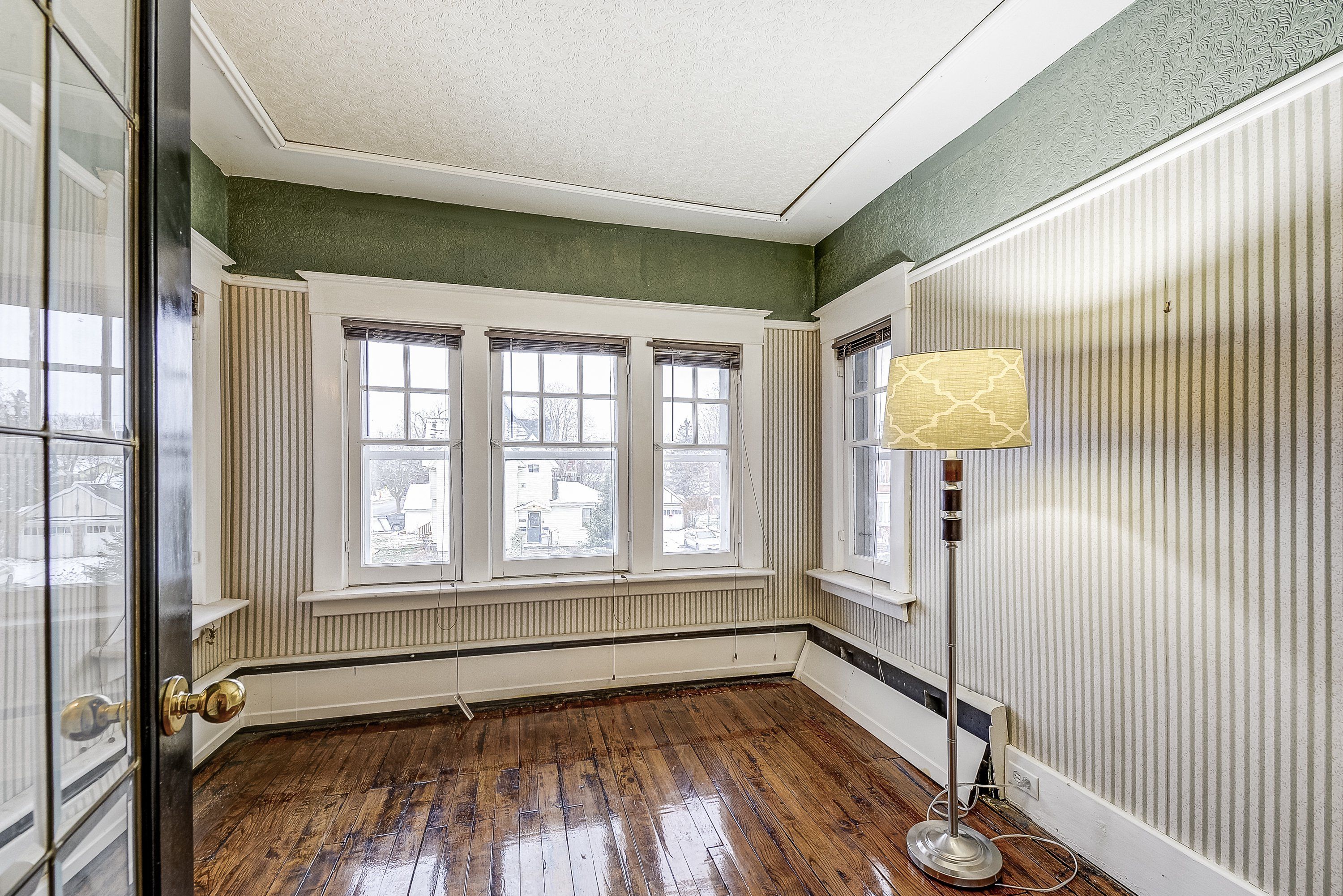 • Character-filled living room with gas fireplace and original hardwood floors.