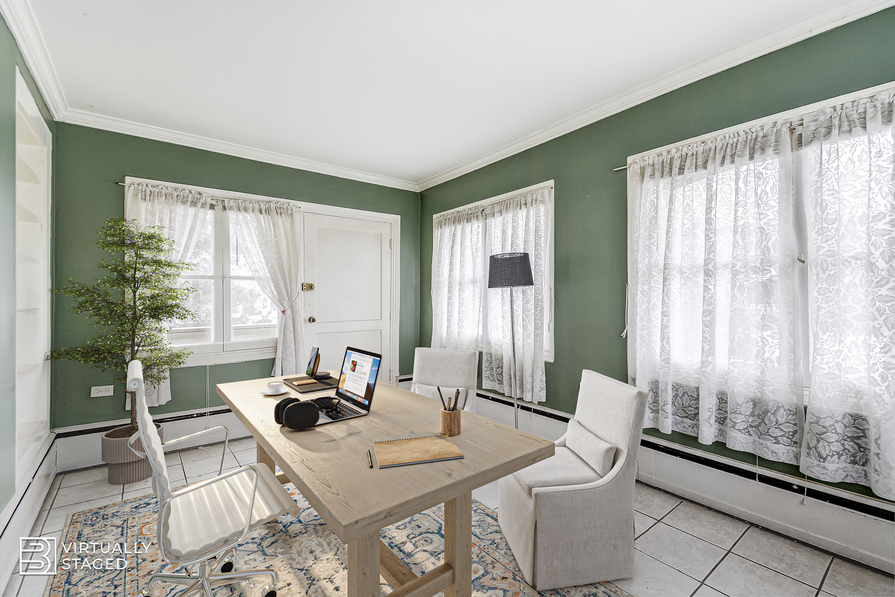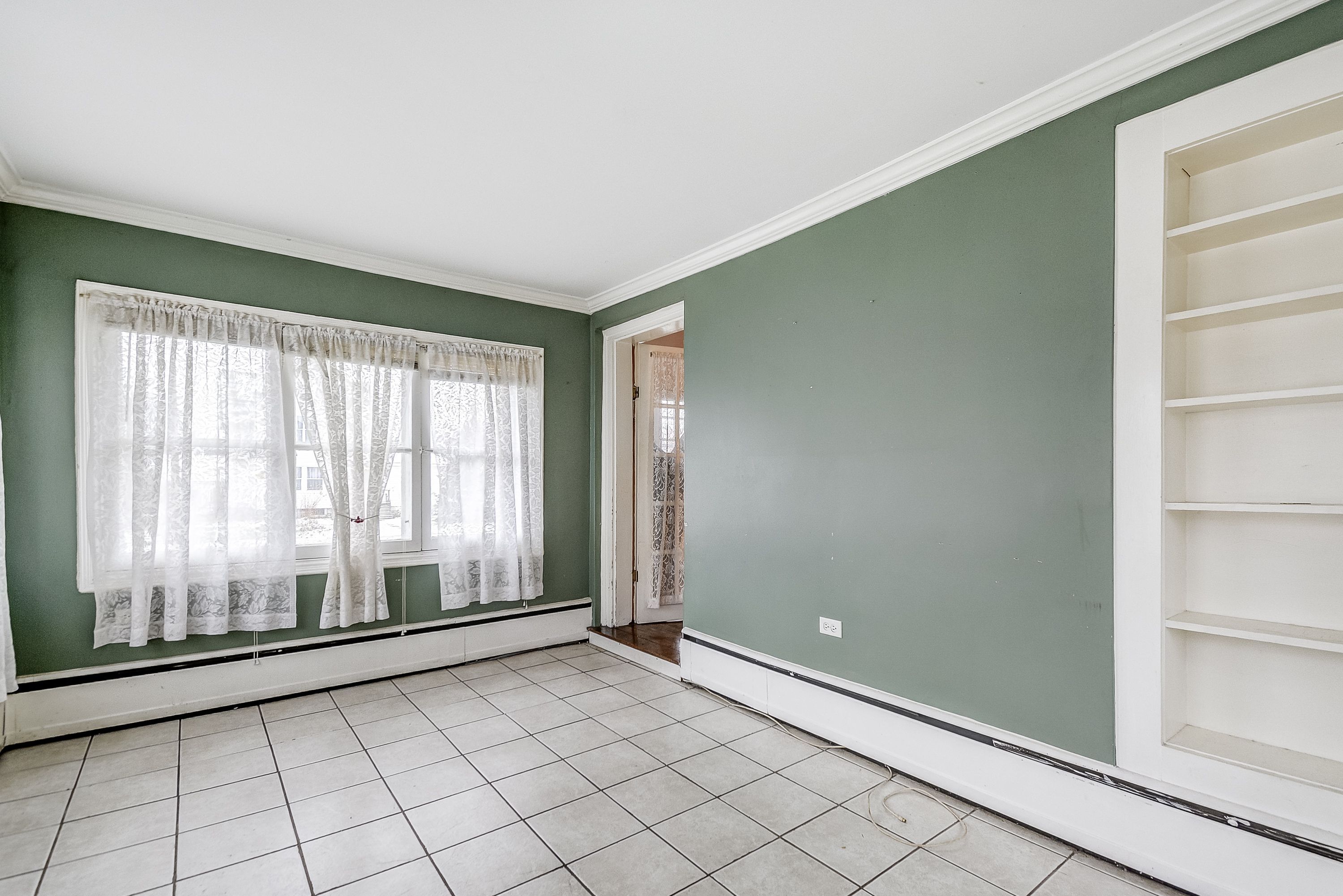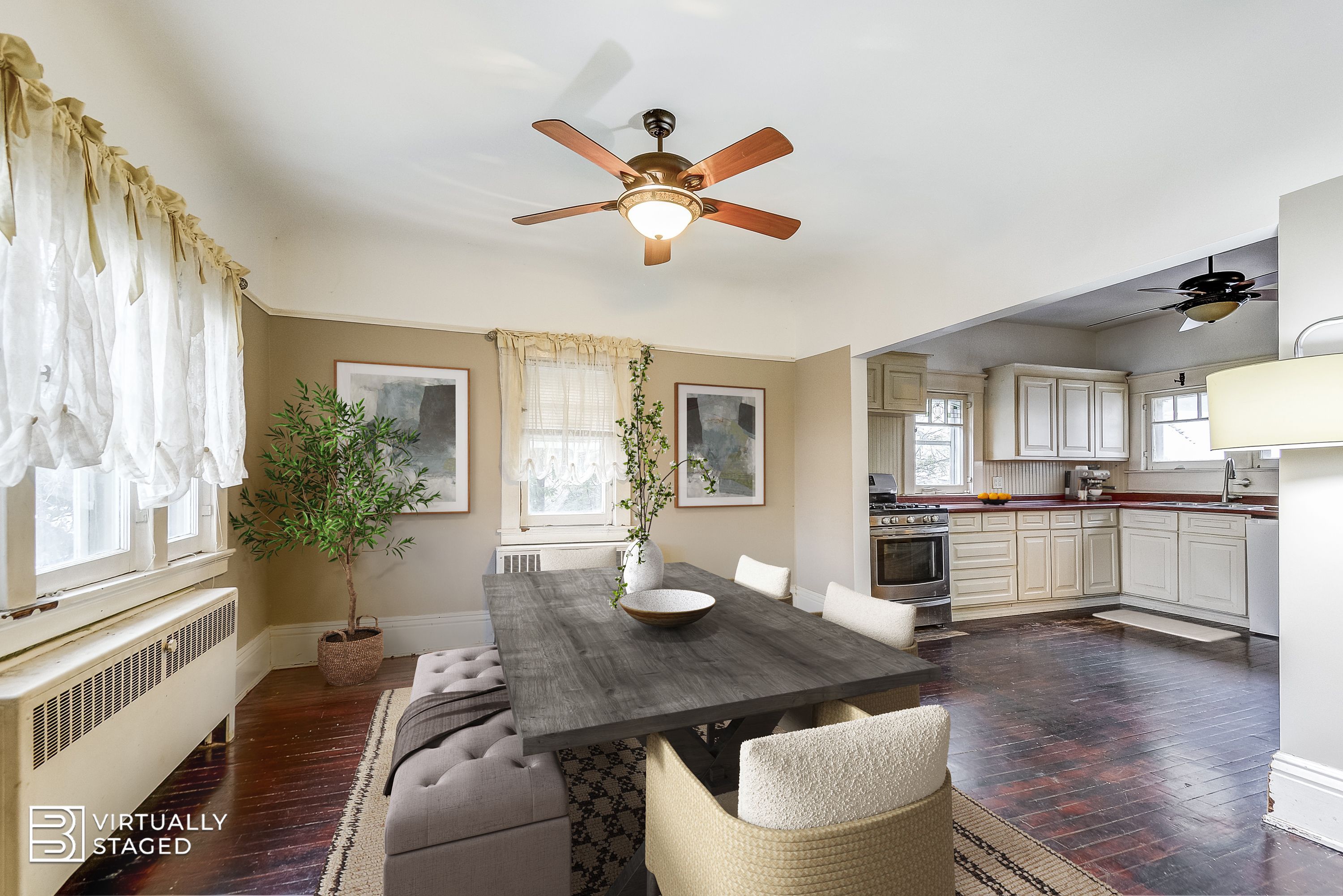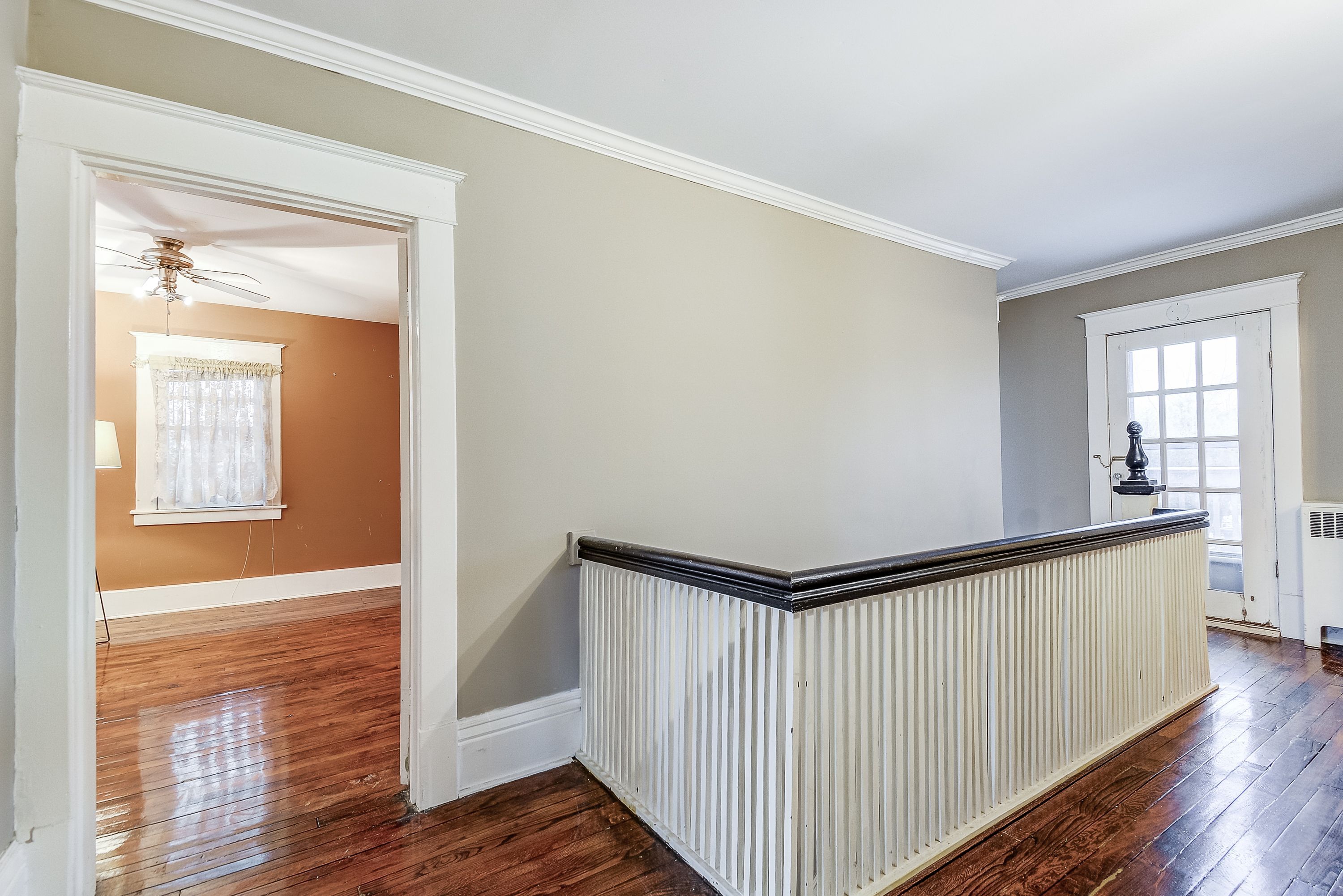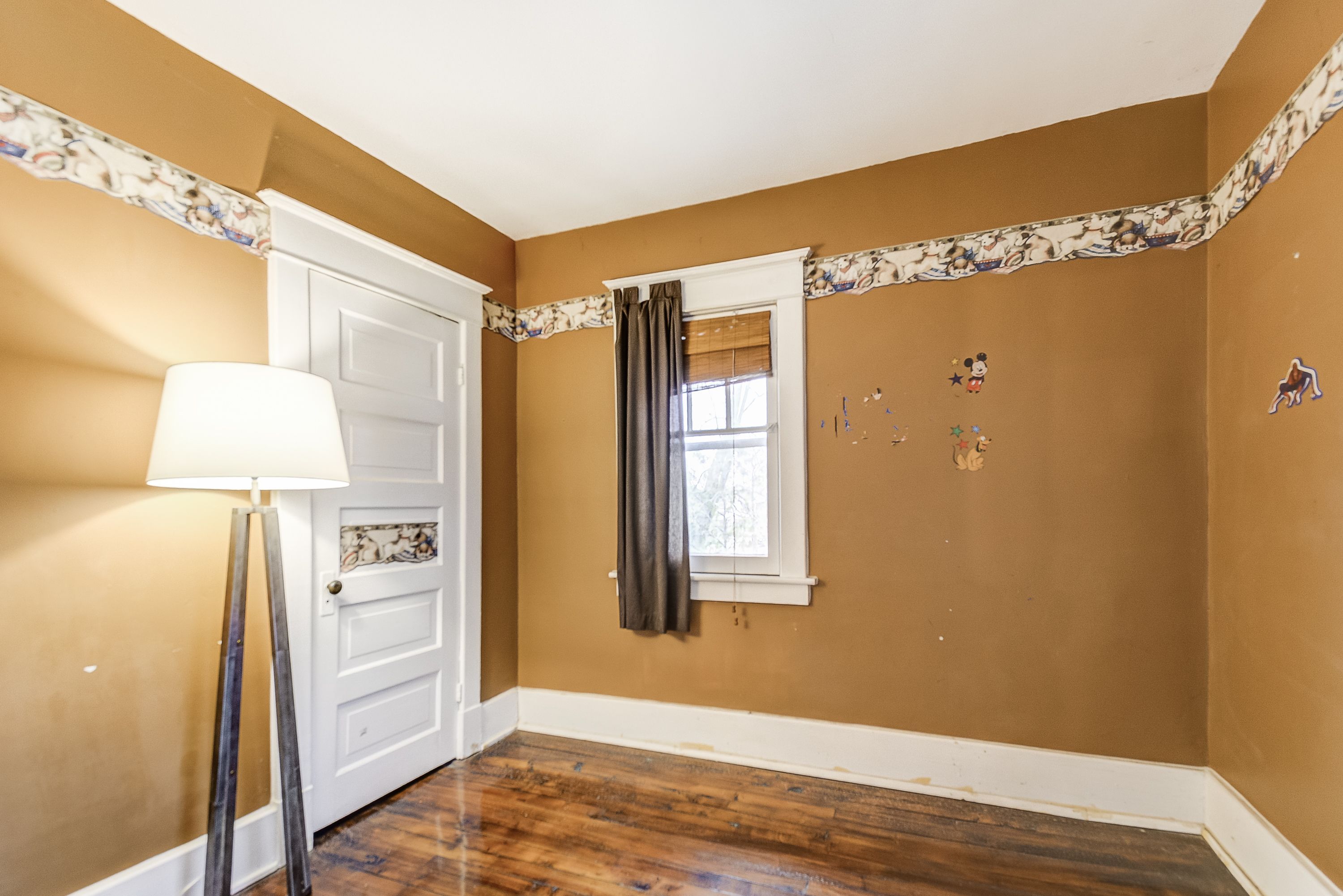 • Character-filled living room with gas fireplace and original hardwood floors.