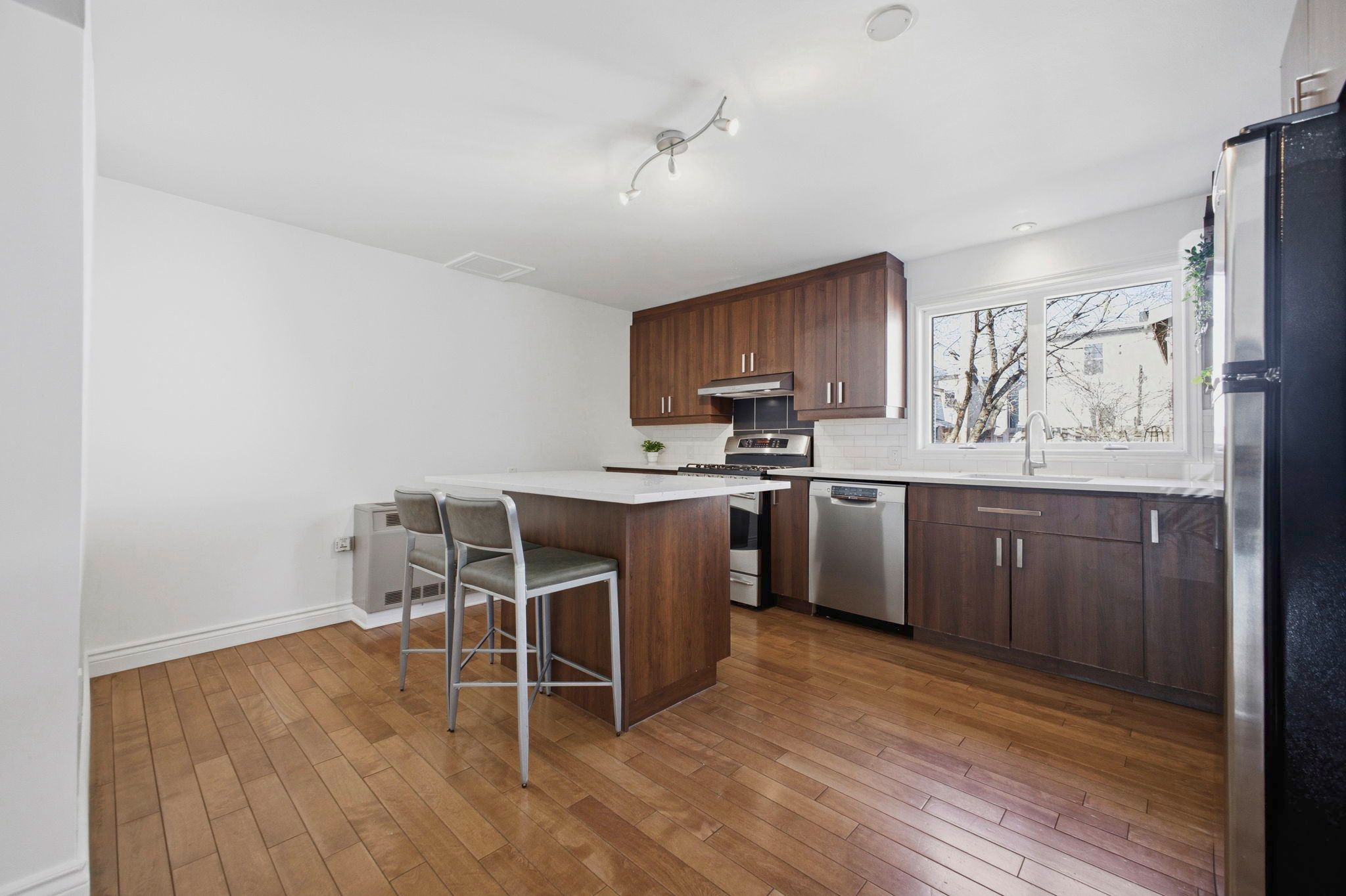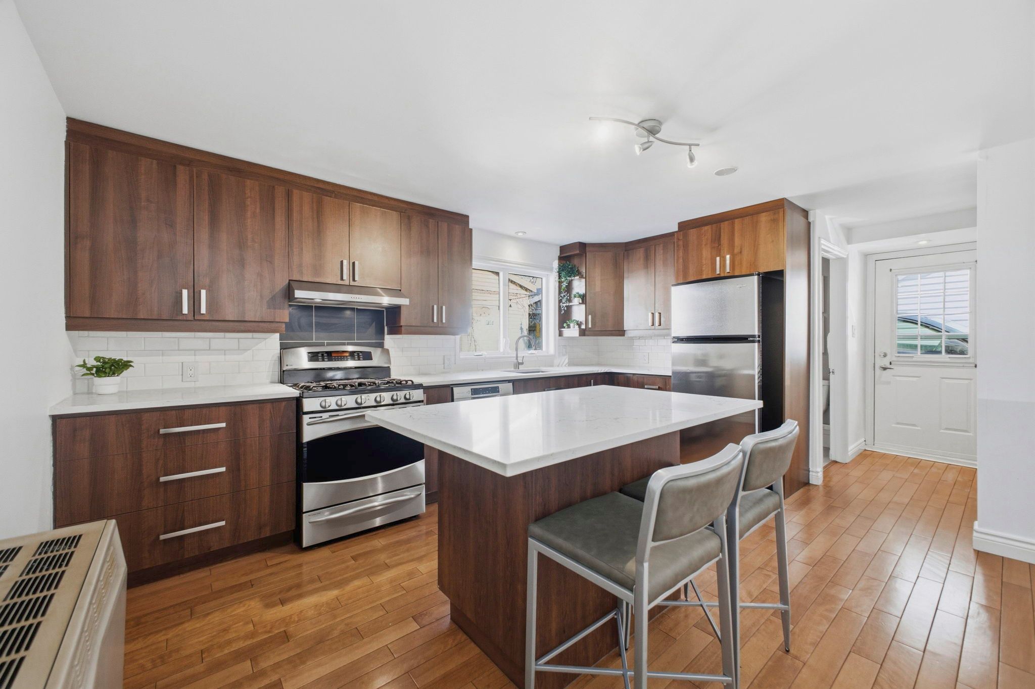 • Updated kitchen featuring quartz countertops and stainless steel appliances.
