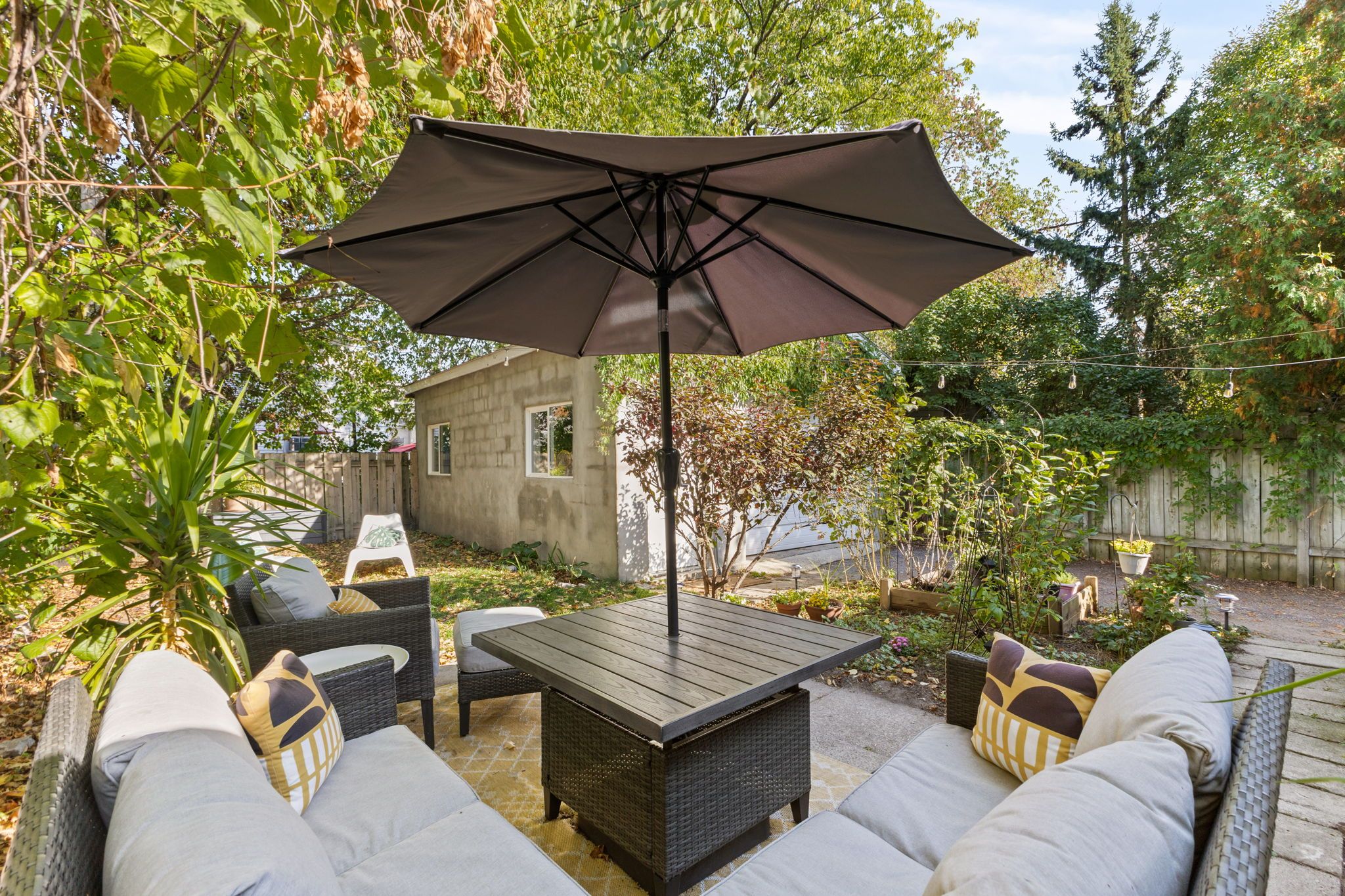• Private rear yard with patio and mature gardens for outdoor enjoyment.