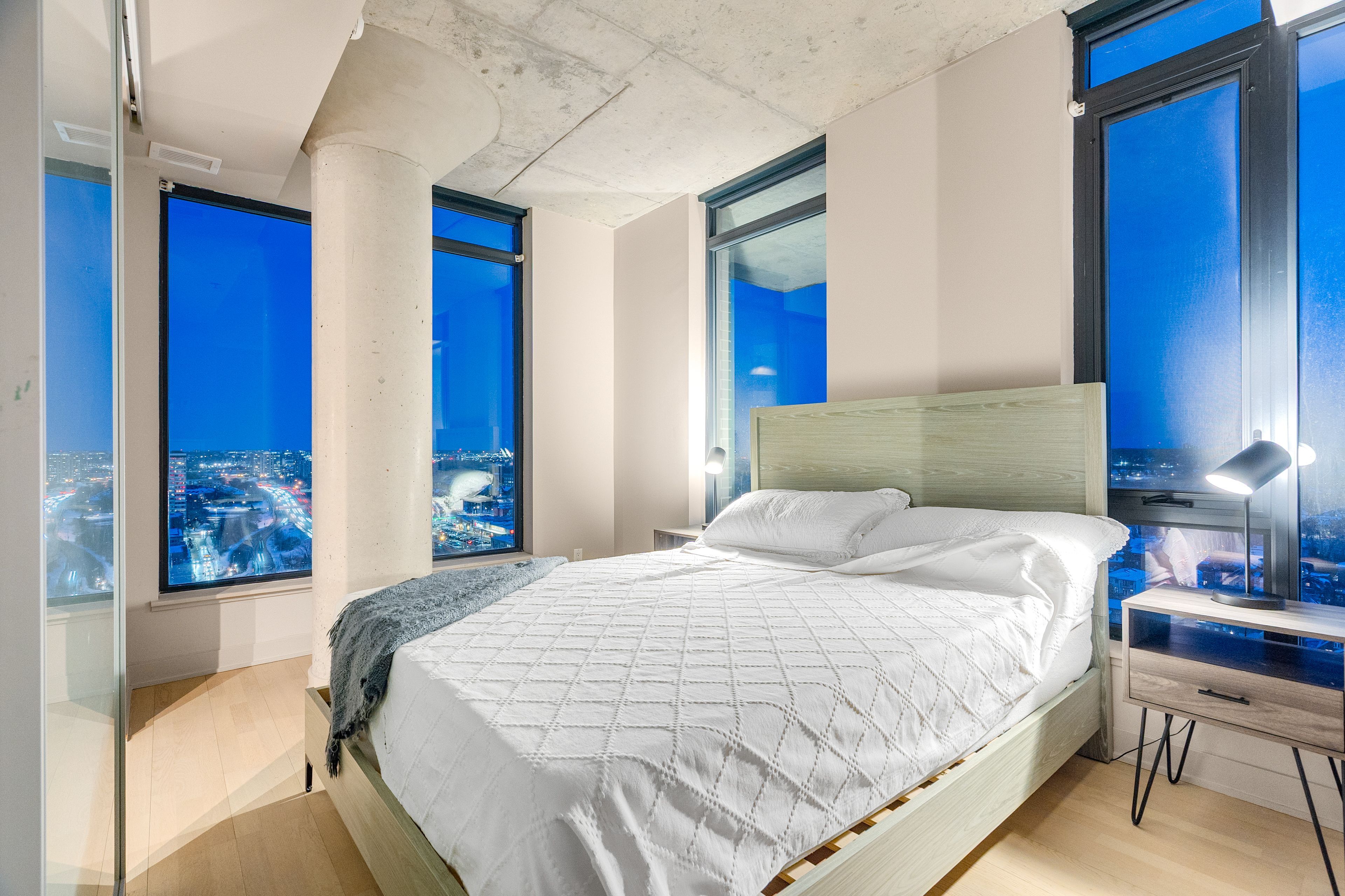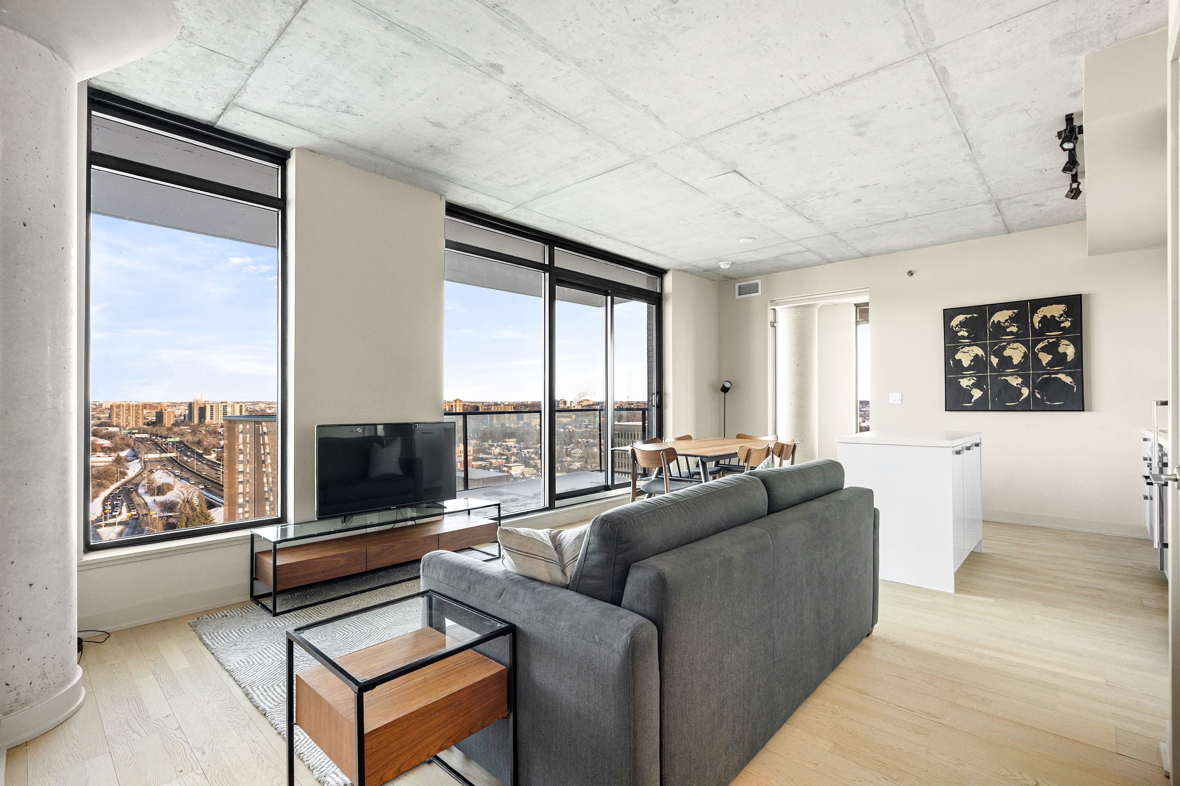 This fully furnished southeast-facing corner suite in the heart of centretown offers rare light, views, and architectural character. Floor-to-ceiling windows wrap the space in natural sunlight, while exposed concrete columns add a refined industrial edge. From the living area, enjoy open sightlines toward the museum of nature, with the rideau canal shimmering beyond. The open-concept layout is both calm and functional. The kitchen features sleek white cabinetry, quartz countertops, stainless steel appliances, subway tile backsplash, and a rare 4-burner gas cooktop anchored by a generous island - ideal for entertaining or everyday living. The east facing bedroom is bathed in afternoon light-perfect for a home office, creative studio, or morning yoga space. The bathroom is finished with floor-to-ceiling calacatta-style porcelain tile and clean, modern lines. In-unit laundry and underground parking provide everyday convenience. Residents enjoy concierge/security, gym, outdoor pool, and party room. Steps to cafes, restaurants, and the canal, with quick access to the 417 - this is corner-unit city living designed for professionals who value light, location, and lifestyle.