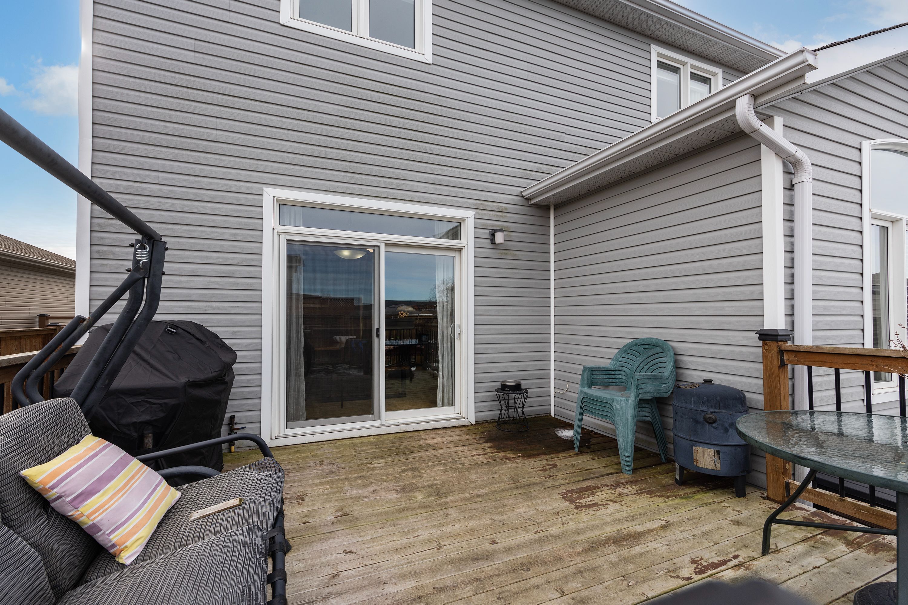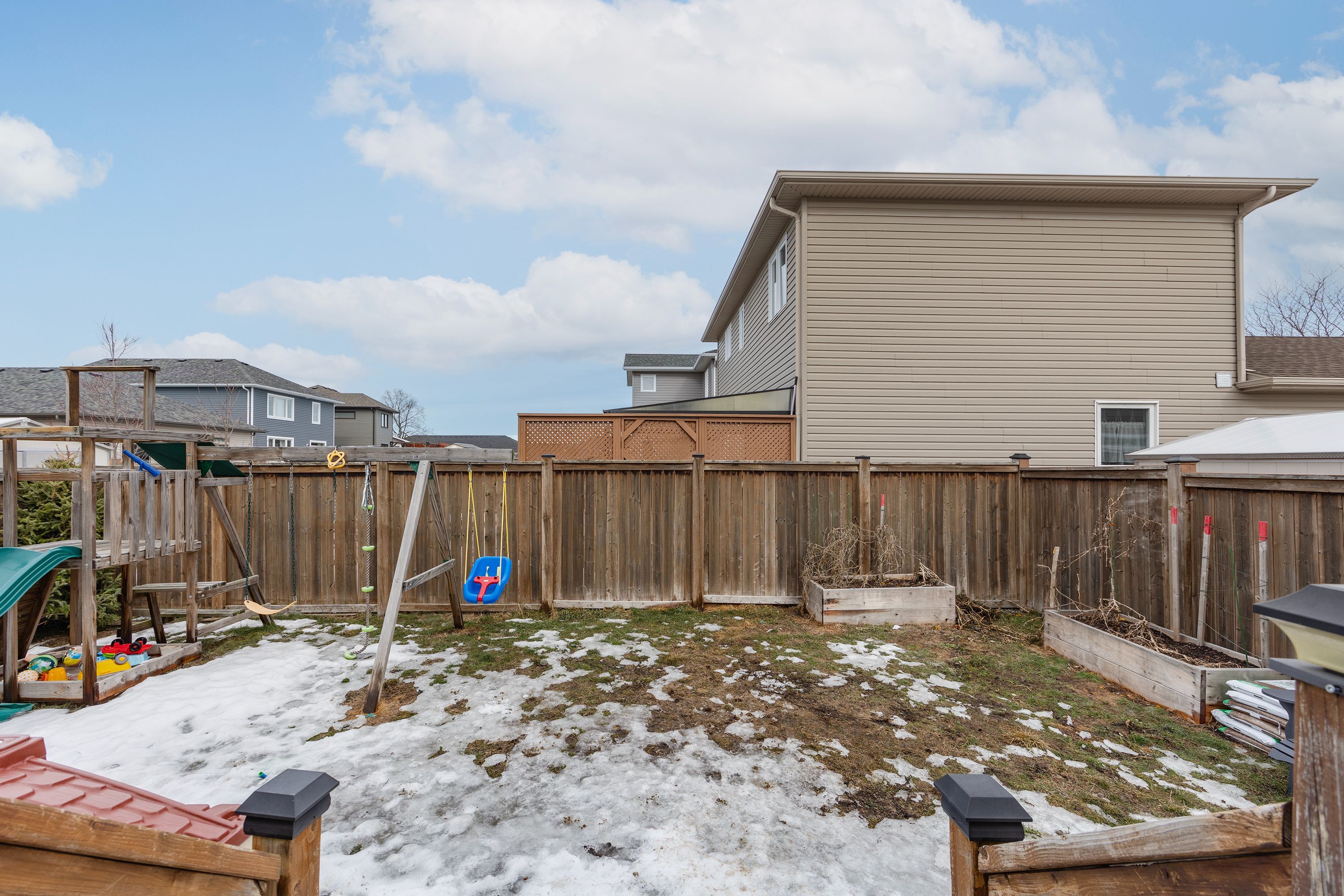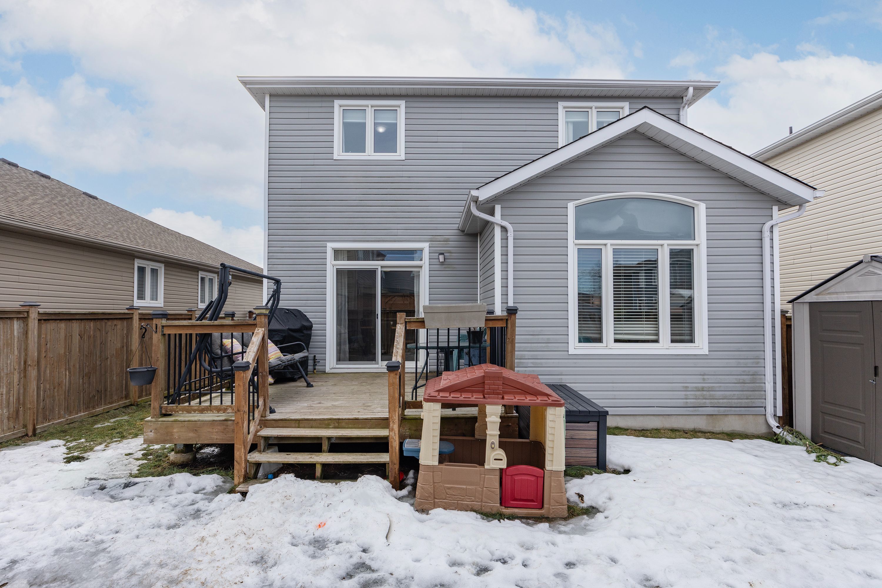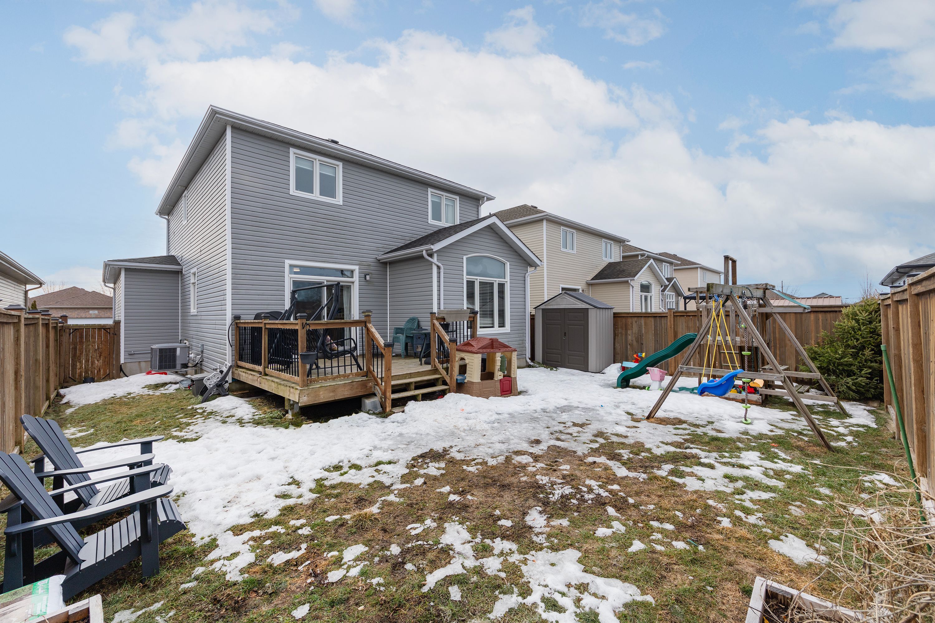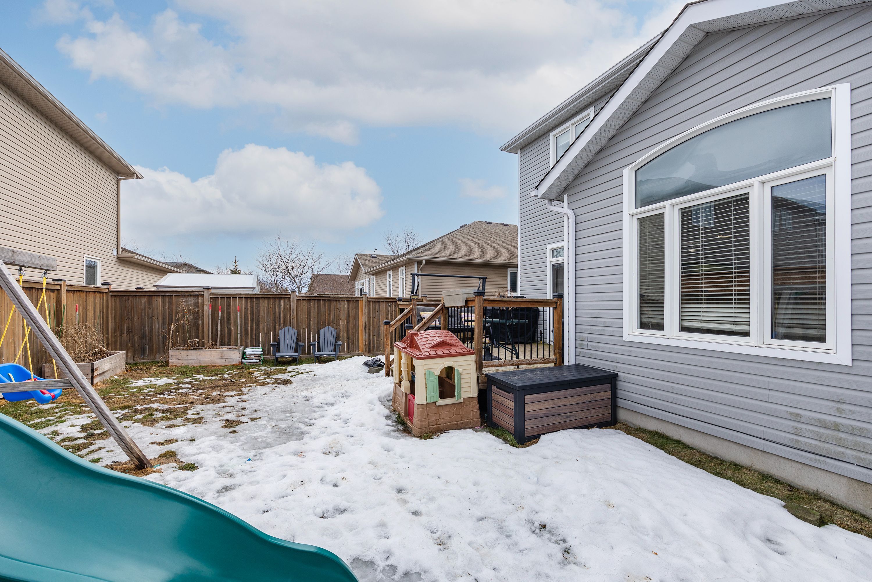• Fully fenced backyard with a large deck for outdoor activities.