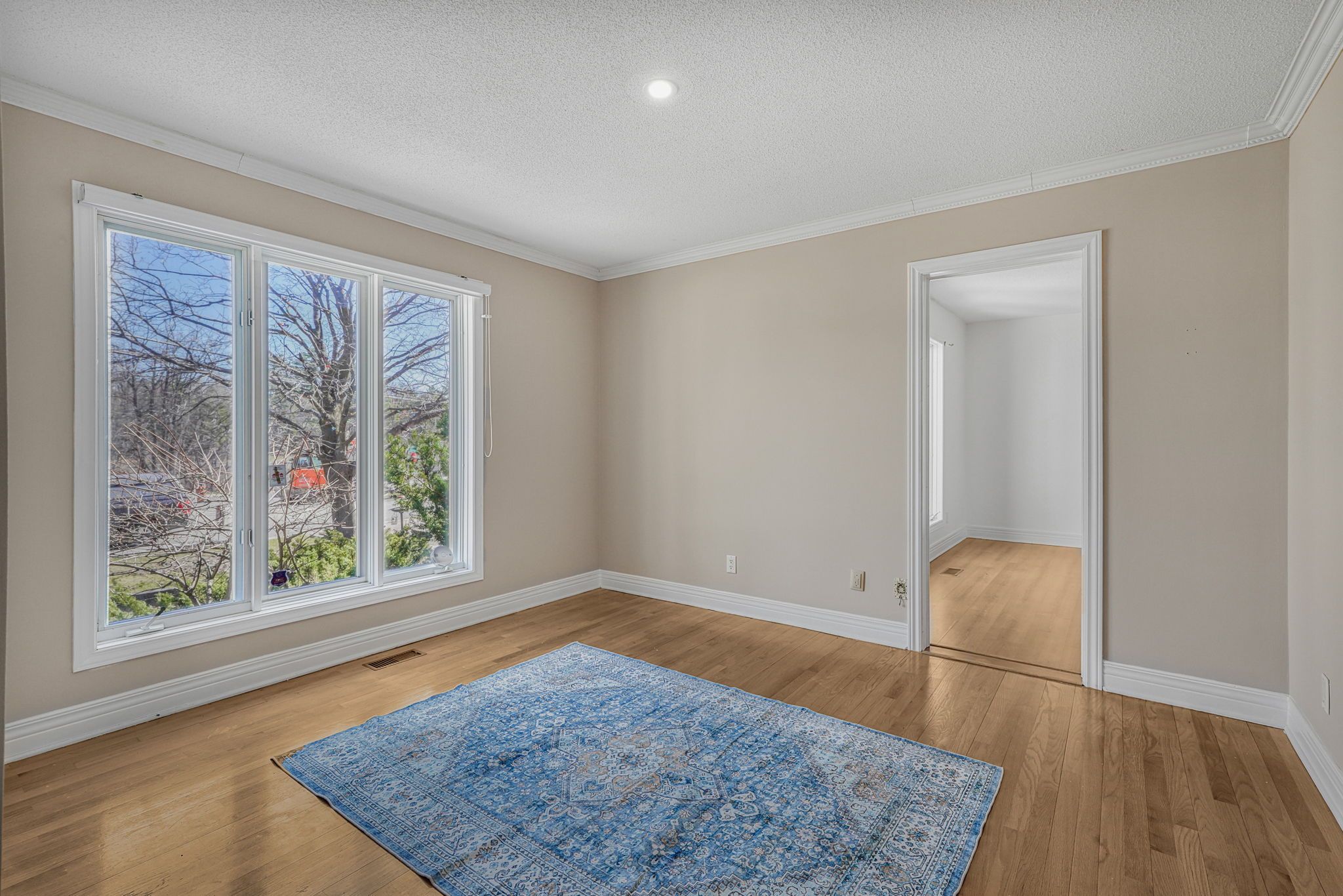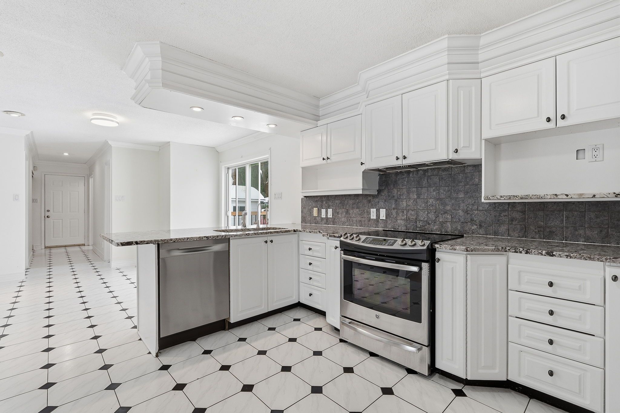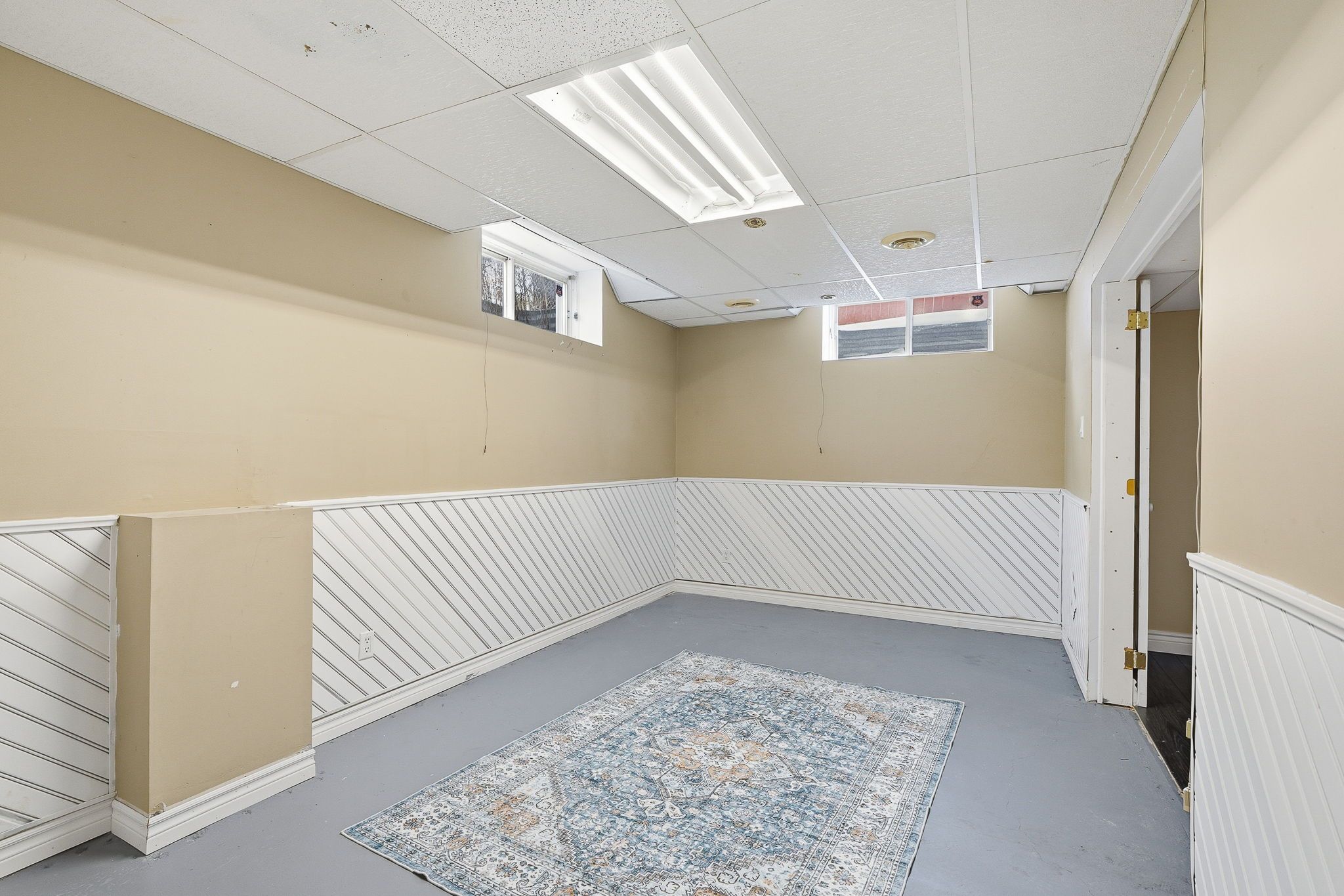 • Bright interior with a sunken living room for architectural charm.
