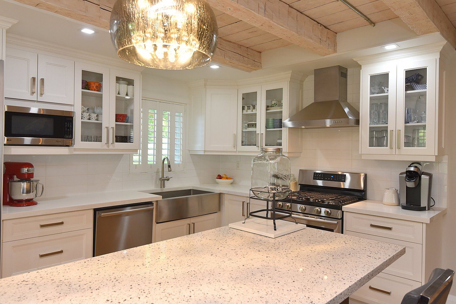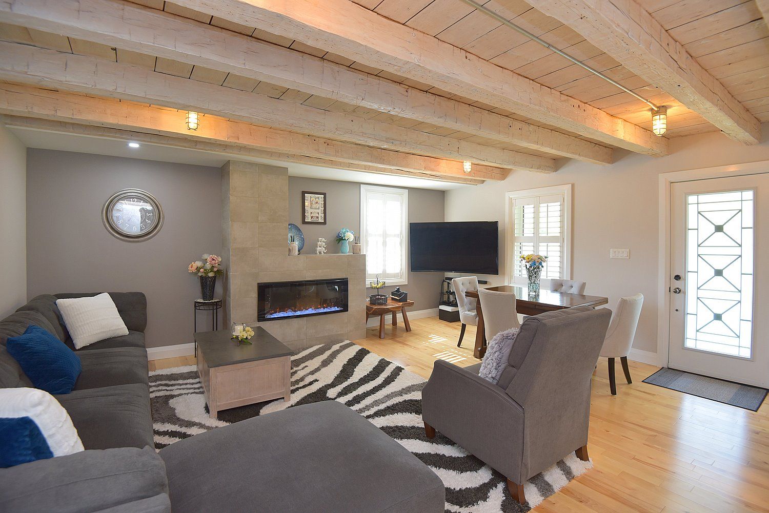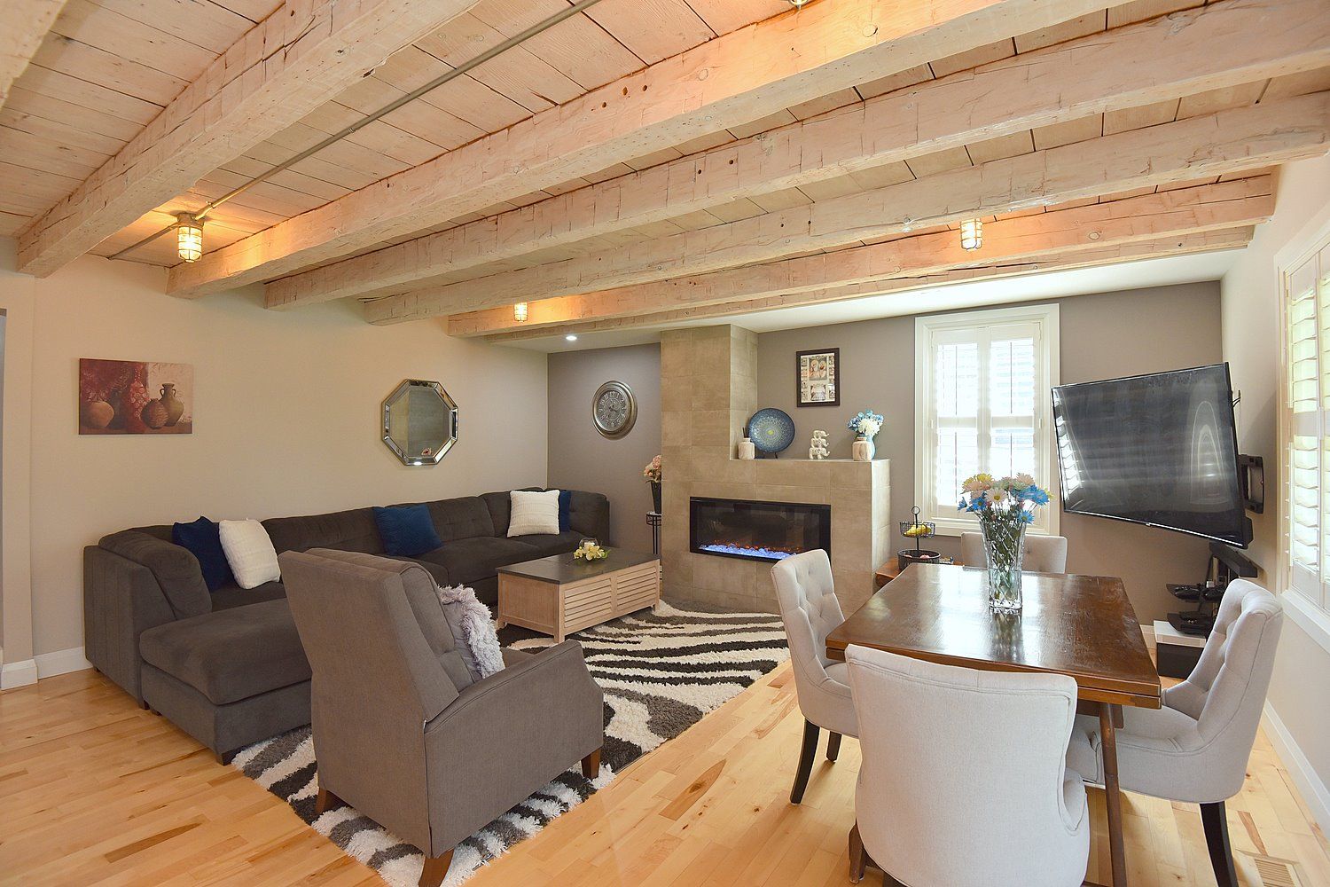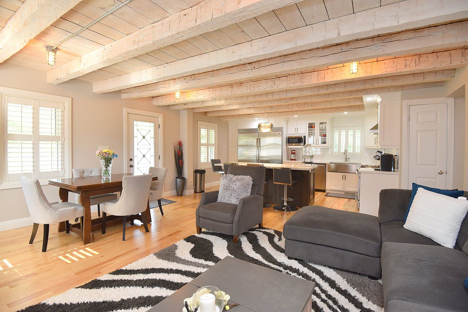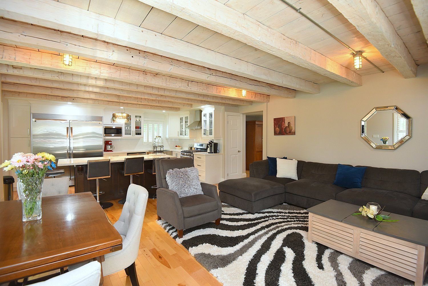 • Open concept living space with exposed beams and a custom fireplace.