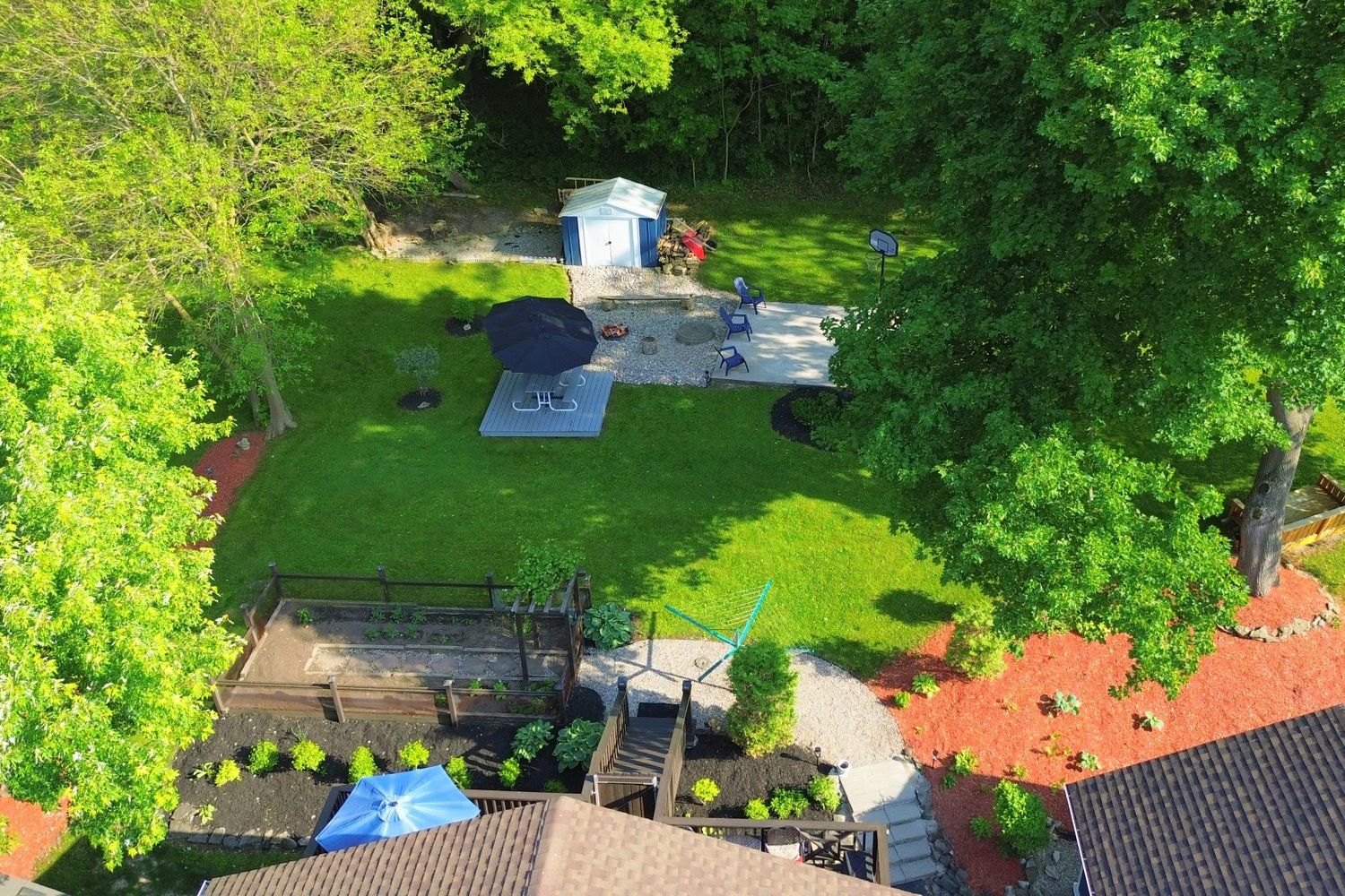 • Private backyard with a garden, firepit, patio, and deck for relaxation.