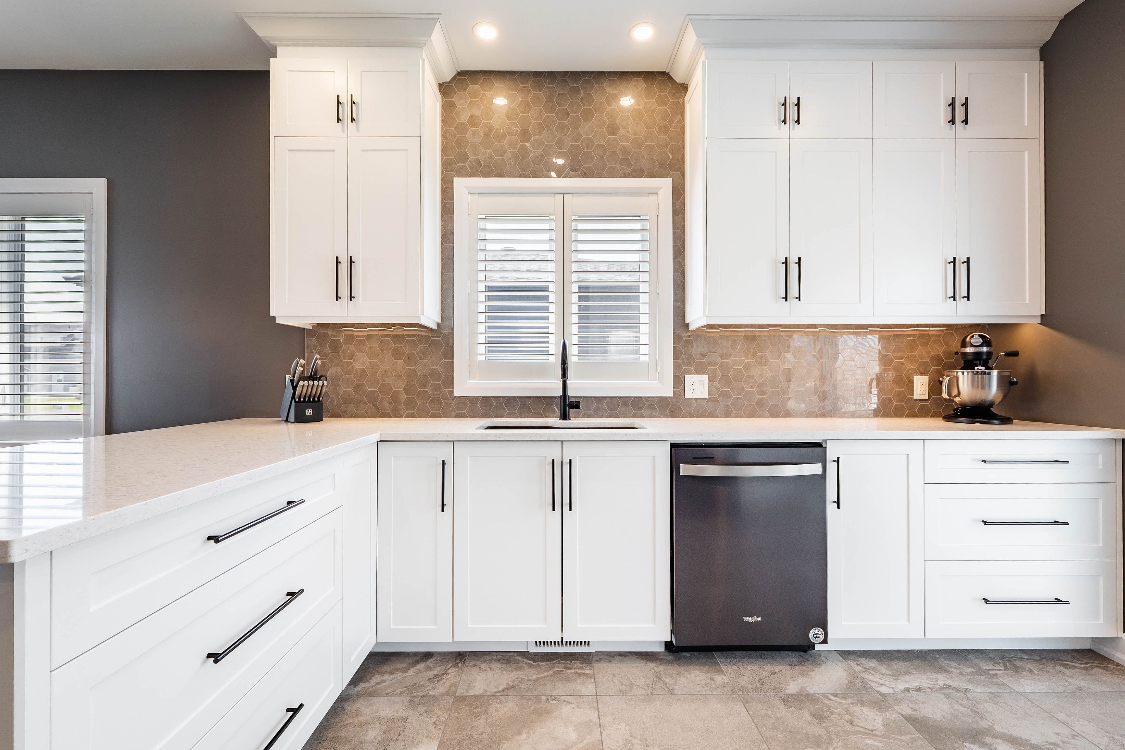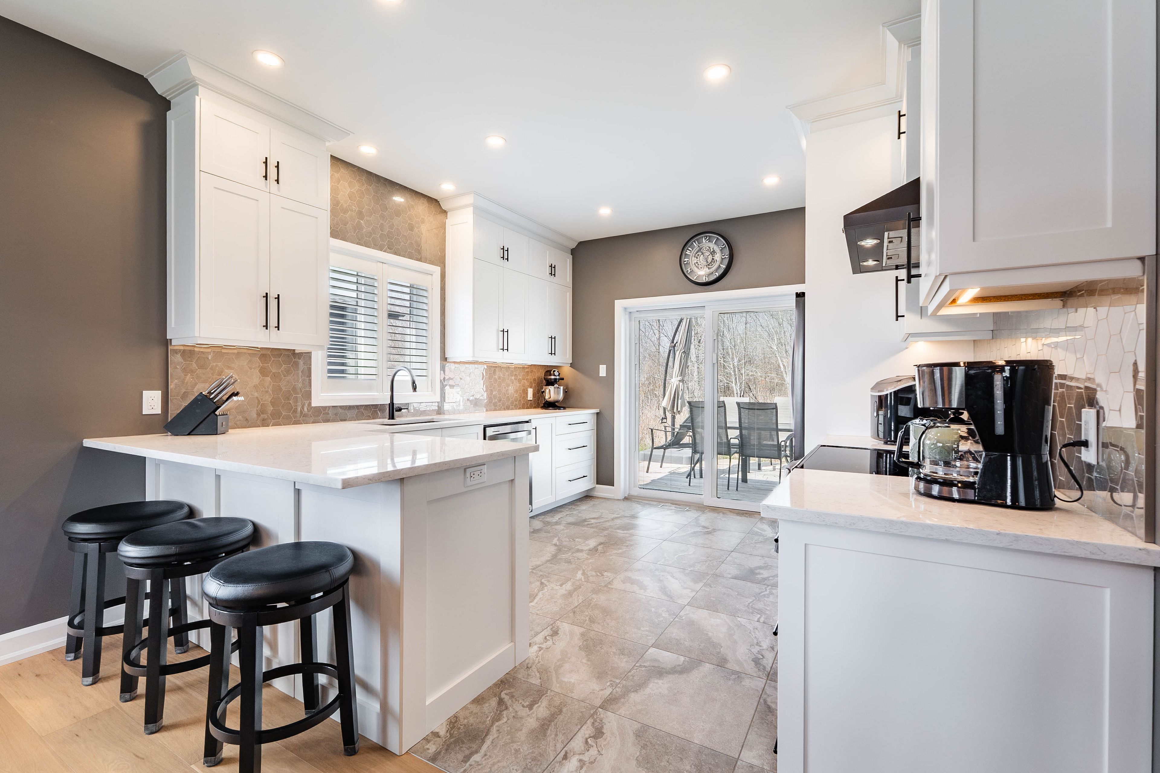 • Kitchen with full-height cabinetry and patio doors for indoor-outdoor access.
