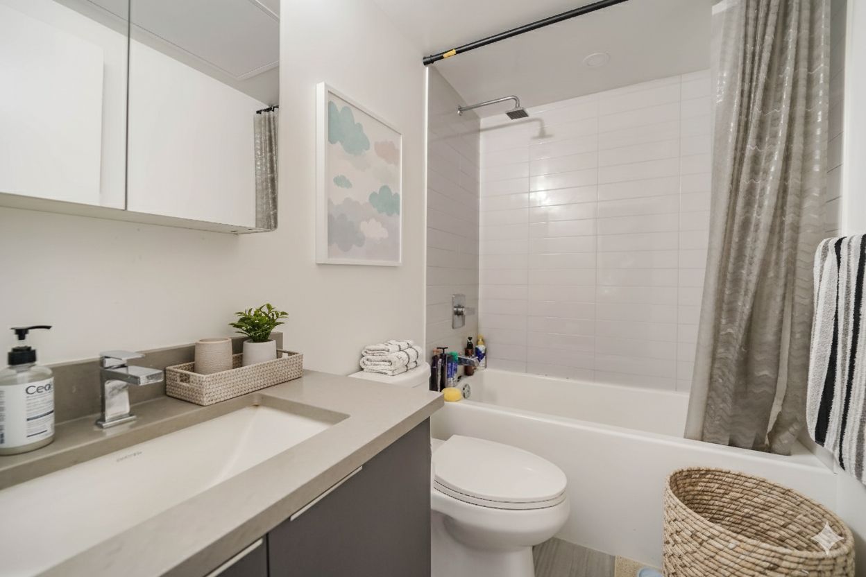 1-bedroom suite at k-square condos featuring floor-to-ceiling windows and a private balcony with unobstructed east views. The modern linear kitchen is equipped with built-in appliances, quartz countertops, and a matching backsplash. Open-concept living and dining area seamlessly extends to the balcony, creating a bright and functional layout. The bedroom offers laminate flooring, a closet, and a large window. Includes a 4-piece bathroom and in-suite washer and dryer. 1 parking space included. Prime location just minutes to highway 401, agincourt mall, scarborough town centre, and utsc. Steps to metro gate park, nearby convenience stores, and ttc access via village green square bus route or kennedy bus stop. The condo is currently tenanted at $2,000 per month, and the buyer will have to assume the current tenant. No vacant possession available. Please note: certain images in this listing have been digitally enhanced or virtually staged using ai to demonstrate possible layout and furnishing options. These renderings are intended to inspire and assist buyers in visualizing the space. Actual property condition may vary.