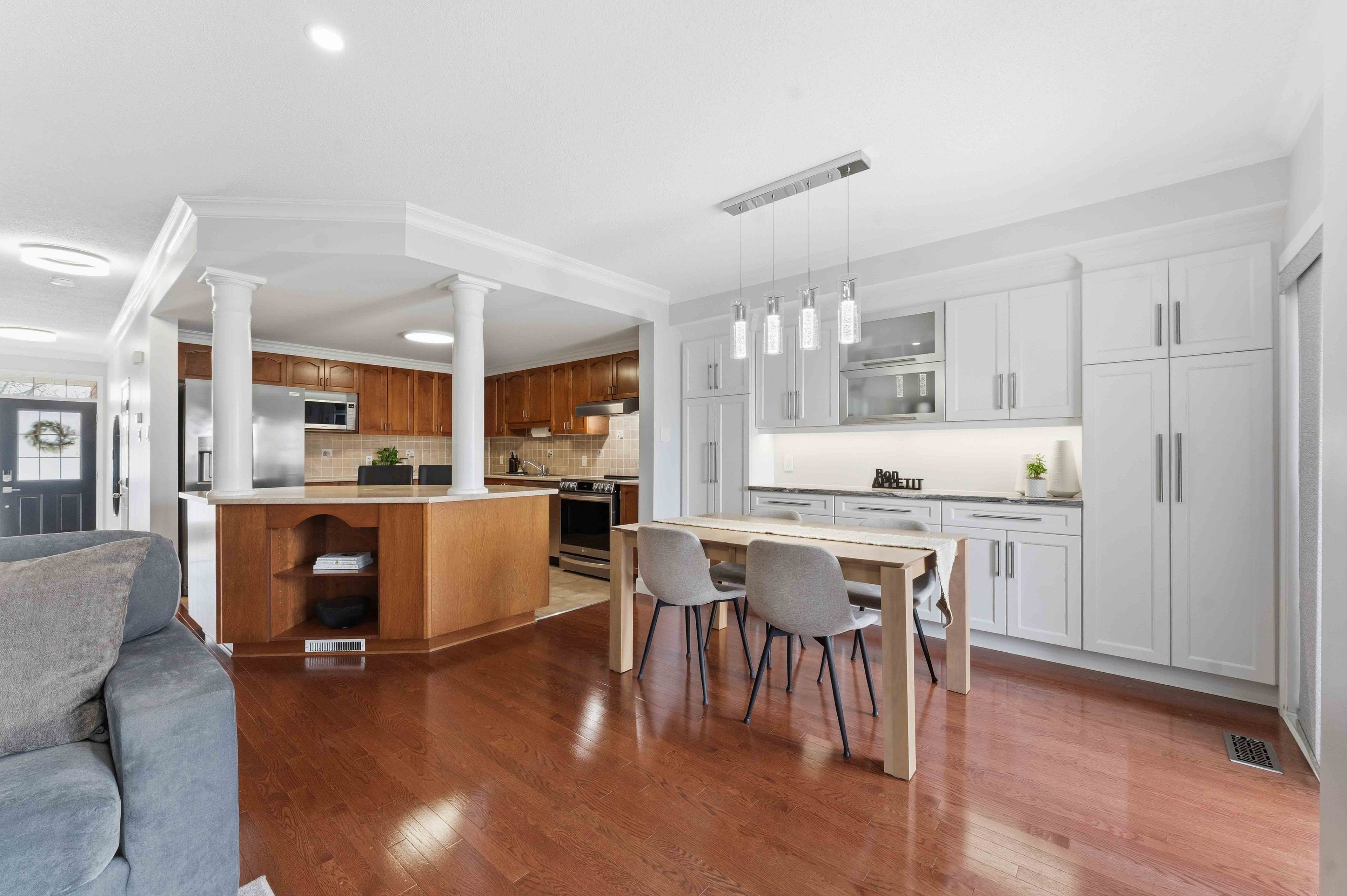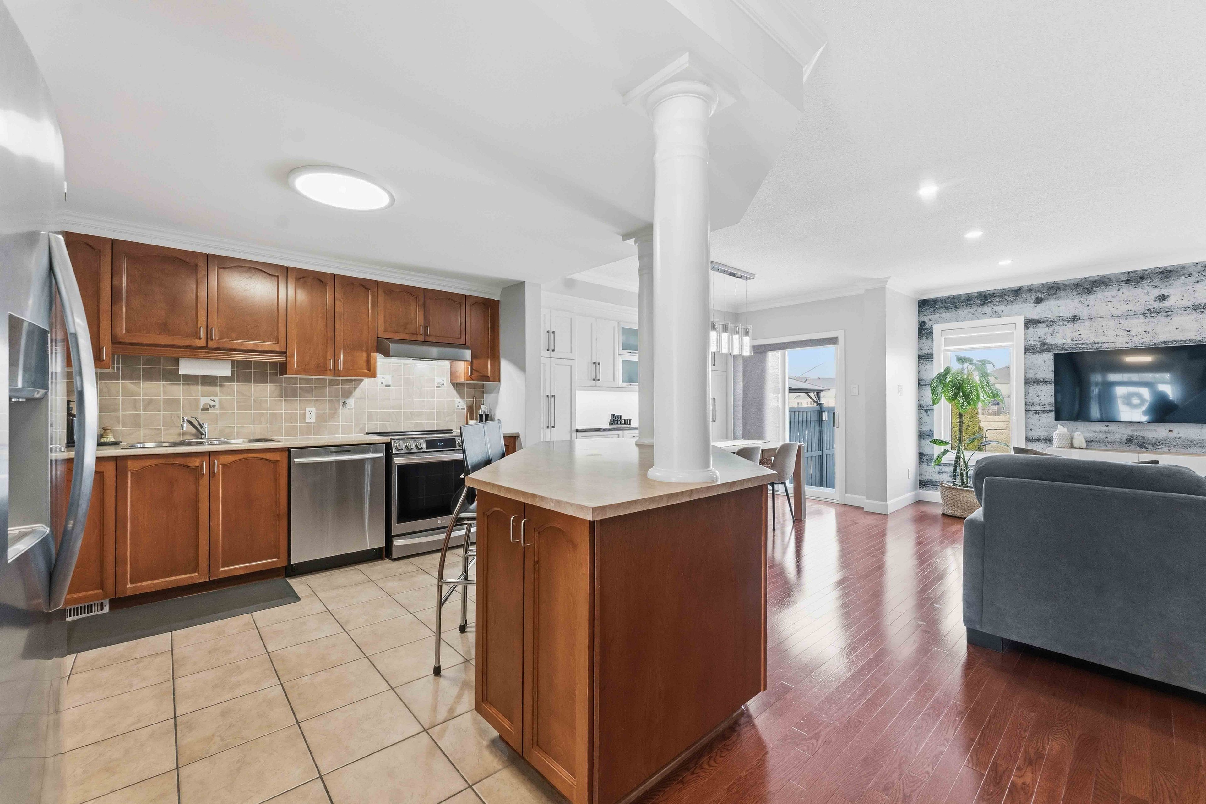 Welcome to this beautifully maintained and spacious townhome in the highly desirable notting gate community, where comfort meets style. A generous foyer welcomes you into an open-concept main floor featuring gleaming hardwood floors and abundant natural light. The kitchen/dining area is both practical and inviting featuring solid wood cabinetry, ample counter space, and a custom built-in wall unit for added convenience. Upstairs, you'll find three generously sized bedrooms. The primary suite offers a private retreat with a full ensuite bathroom and a large walk-in closet. The finished basement is bright and functional, complete with a large window, a cozy family room, a spacious laundry area, and additional storage. Step outside to your private, low-maintenance backyard oasis with no rear neighbours. Fully fenced for privacy, it features a gazebo, shed, and a convenient gate with direct access to open space-perfect for relaxing or entertaining. Pride of ownership is evident throughout this home, making it truly move-in ready. Ideally located just minutes from schools, shopping, parks, and bike trails, this is an opportunity you won't want to miss. Book your private showing today and discover all this exceptional townhome has to offer! Furnace and ac 2023, and roof roof is 2018.