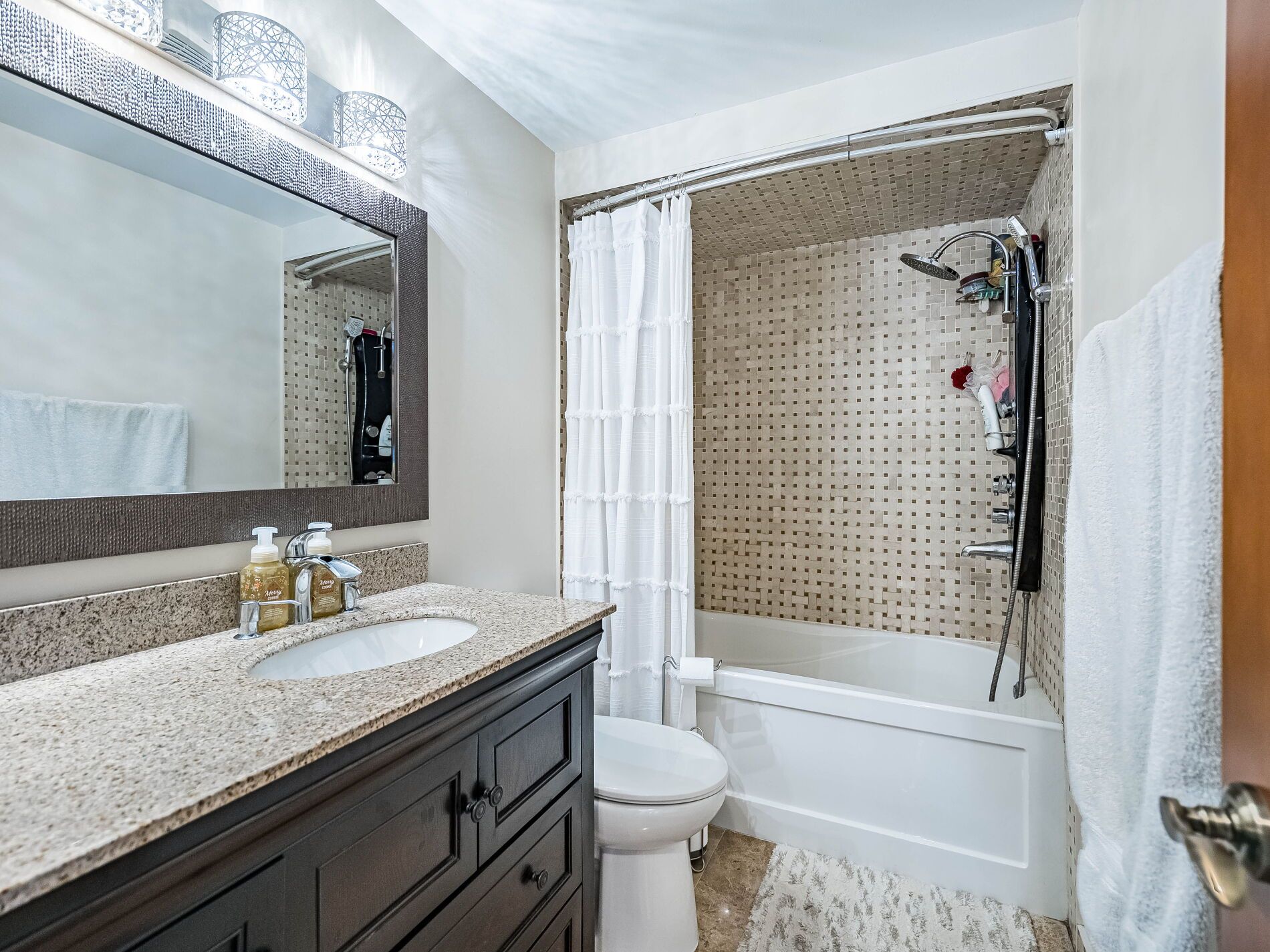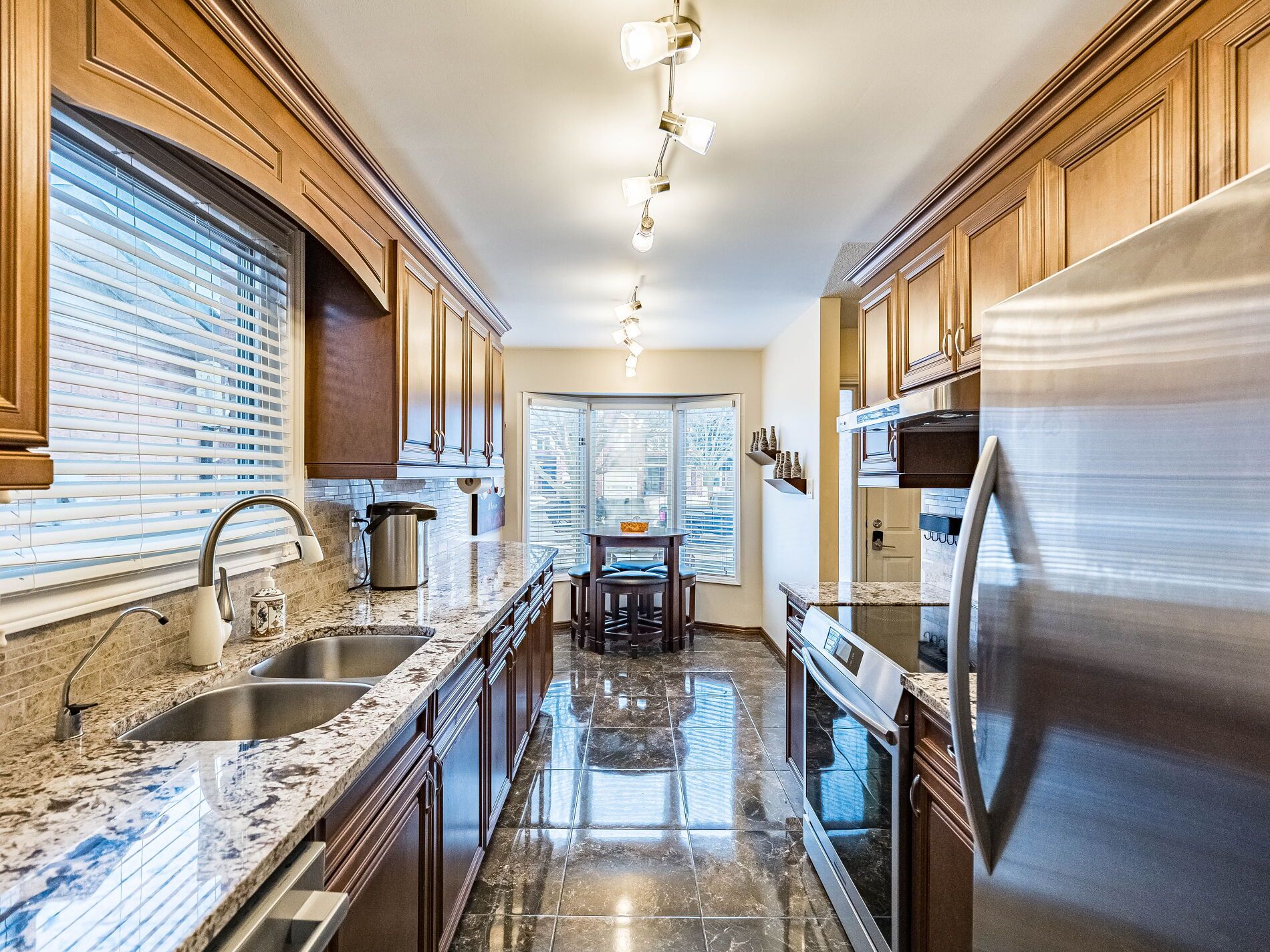 • Newly renovated kitchen with granite countertops and stainless steel appliances.
