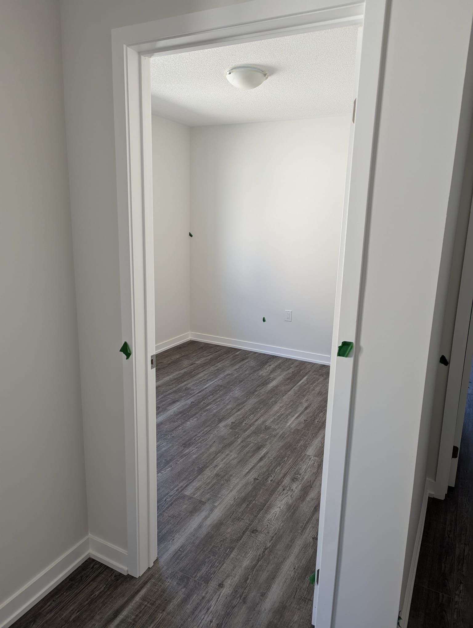 • Open living area features an electric fireplace and stylish vinyl flooring.