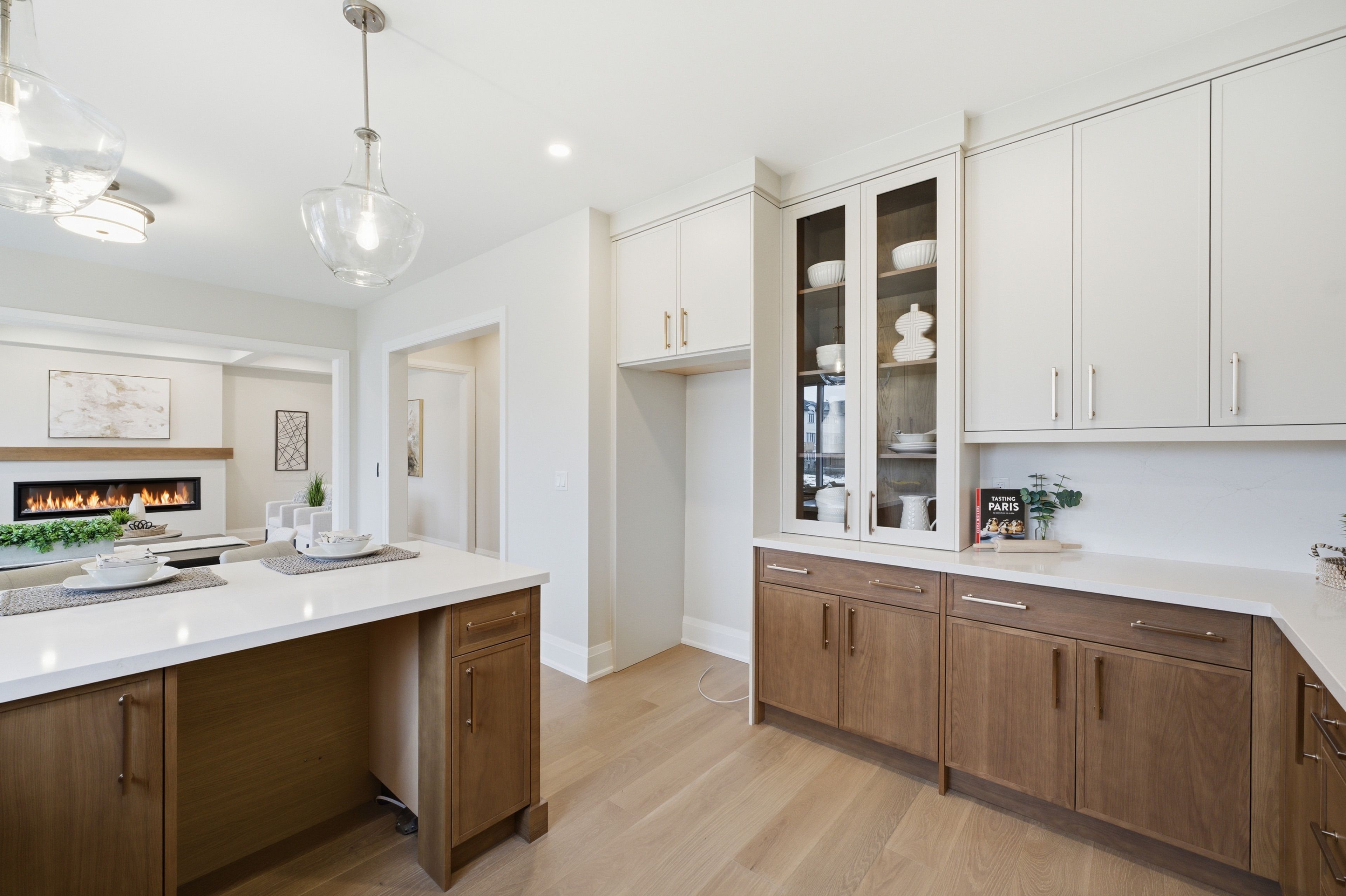 • Stunning kitchen with glass-front cabinetry and quartz countertops.