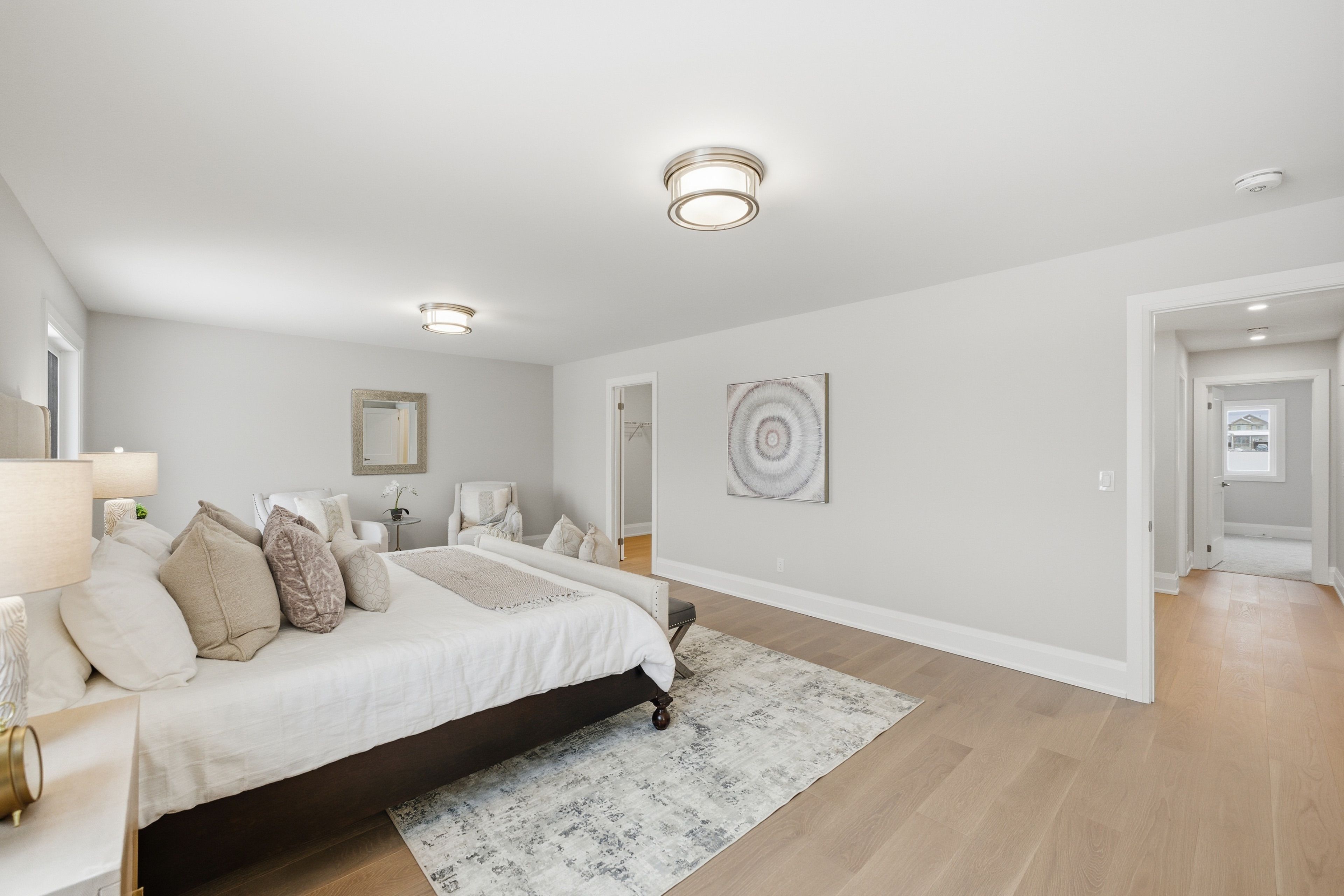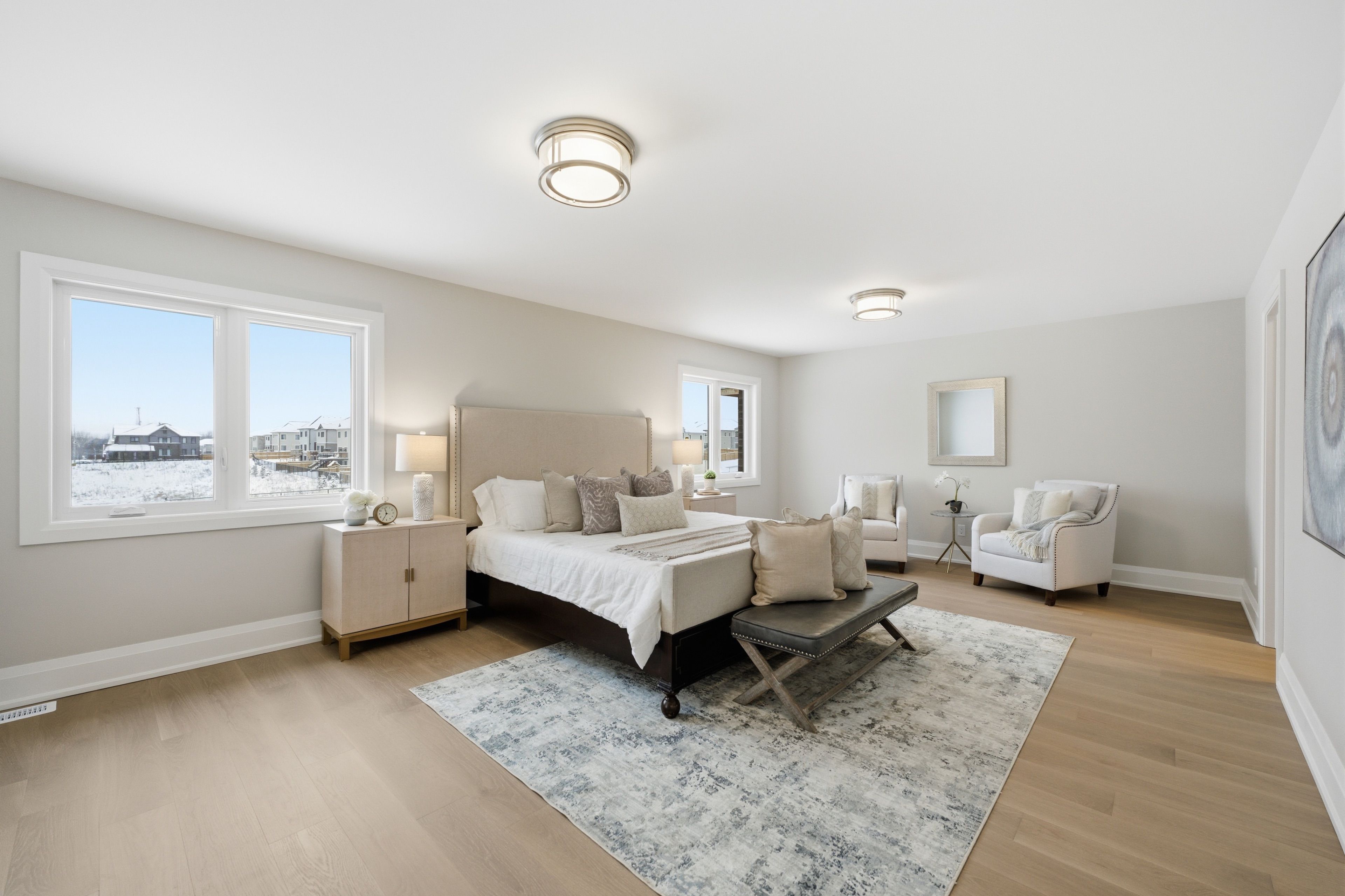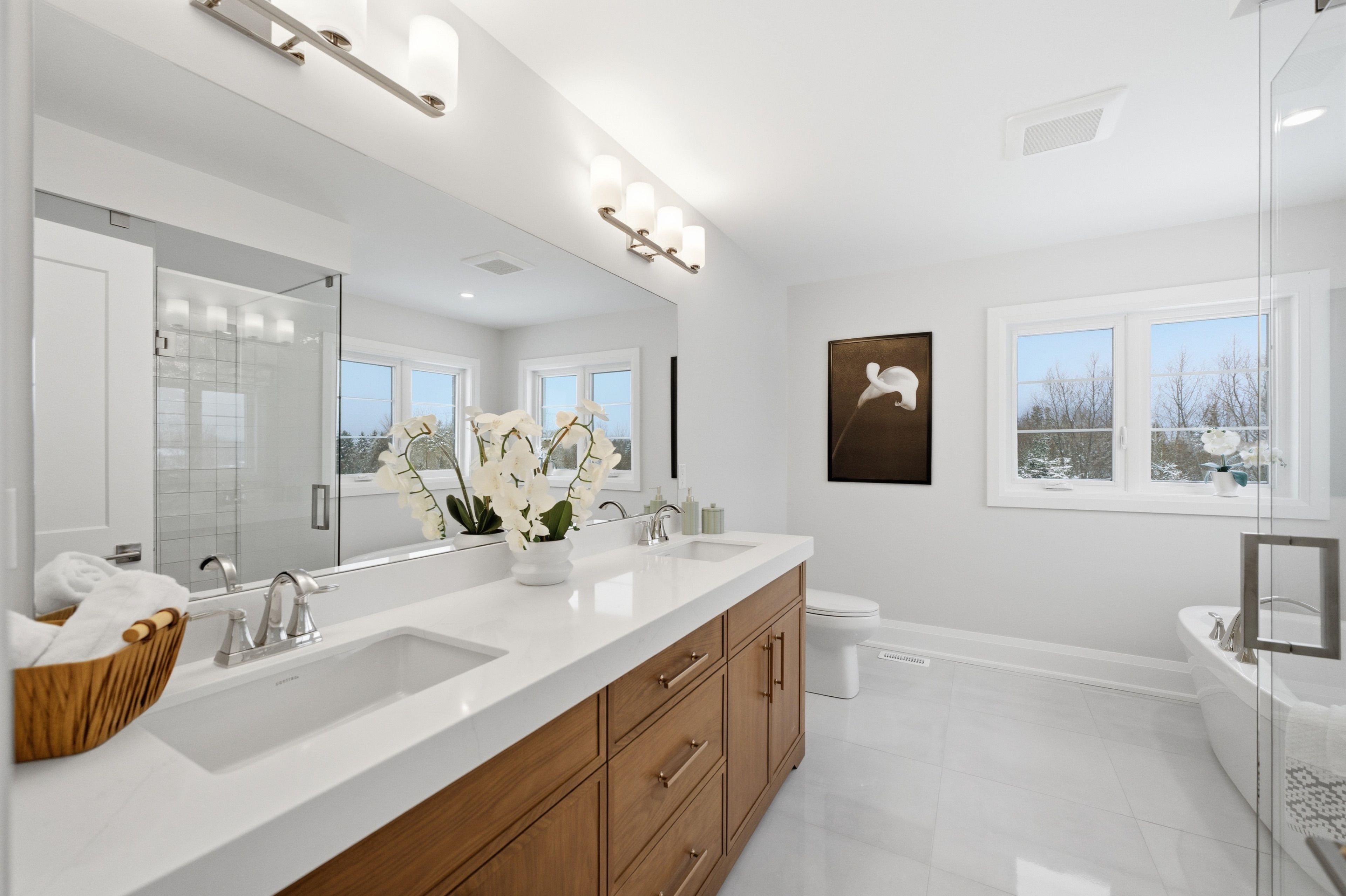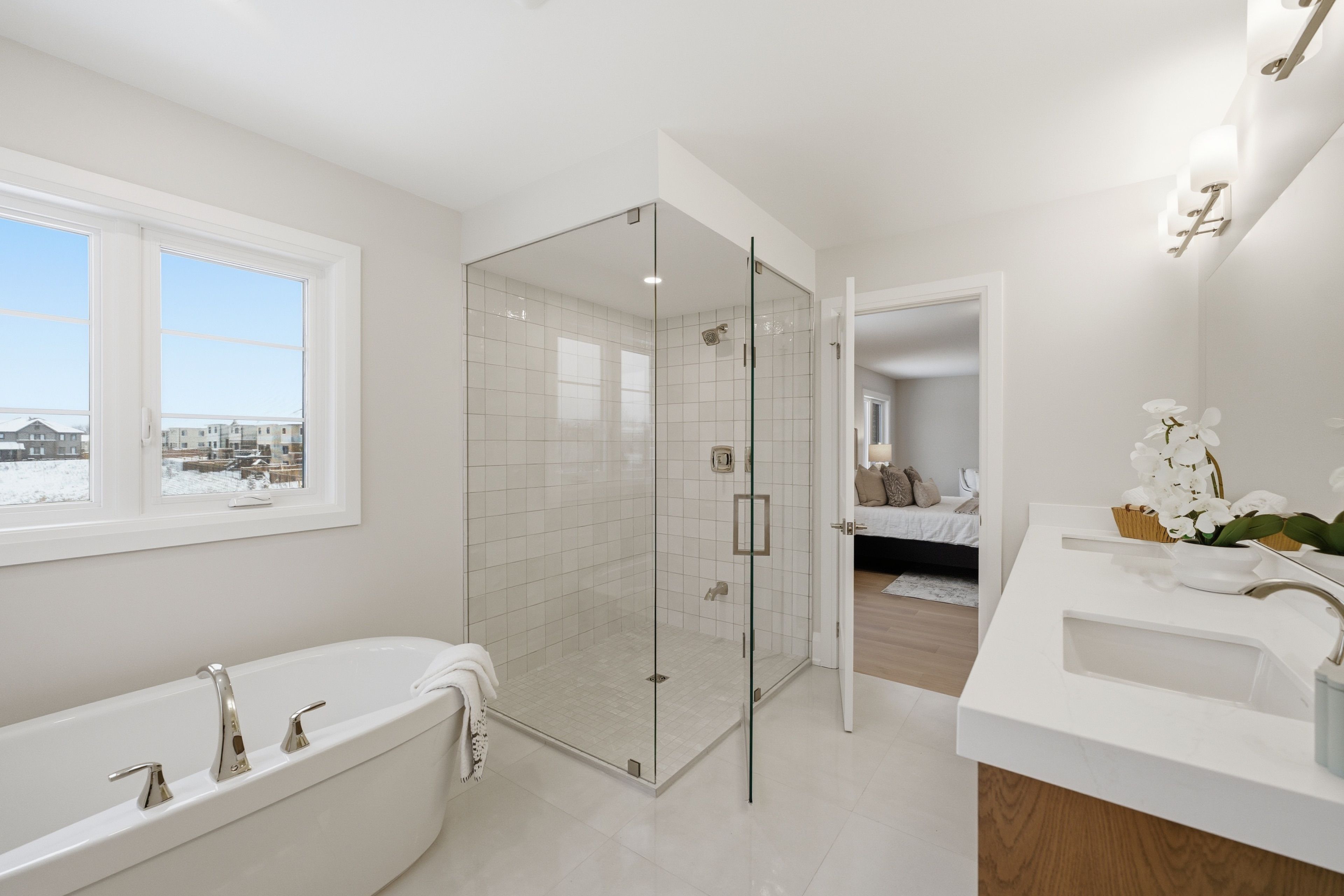 • Luxurious primary ensuite featuring a freestanding tub and glass shower.