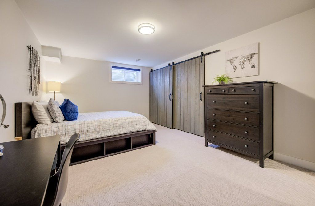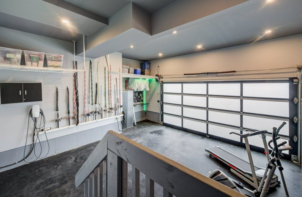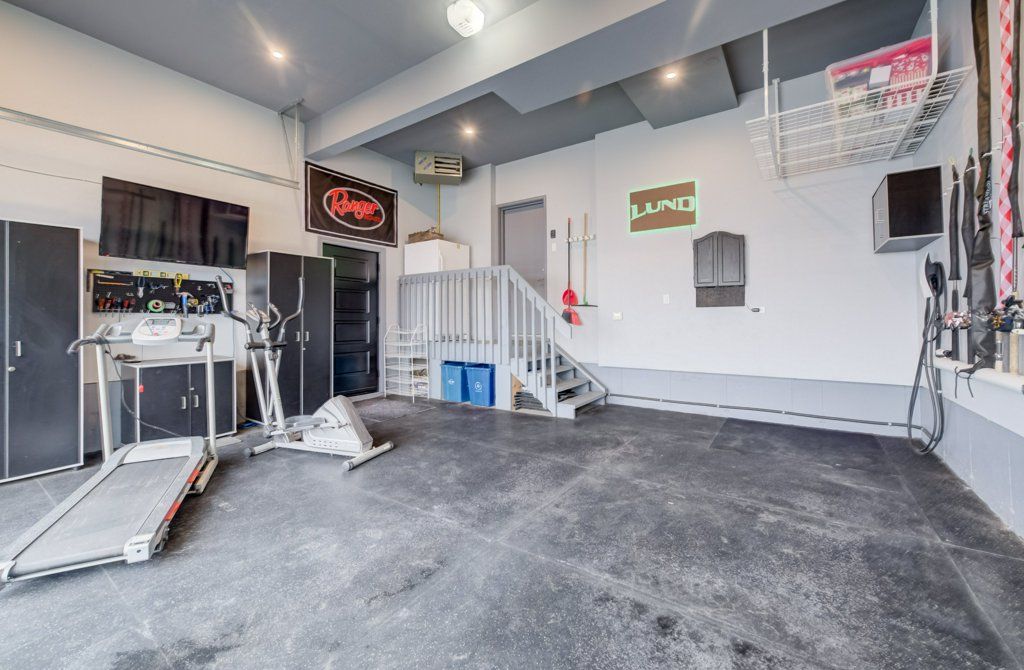 • Finished basement with entertainment space, projector, and extra storage.