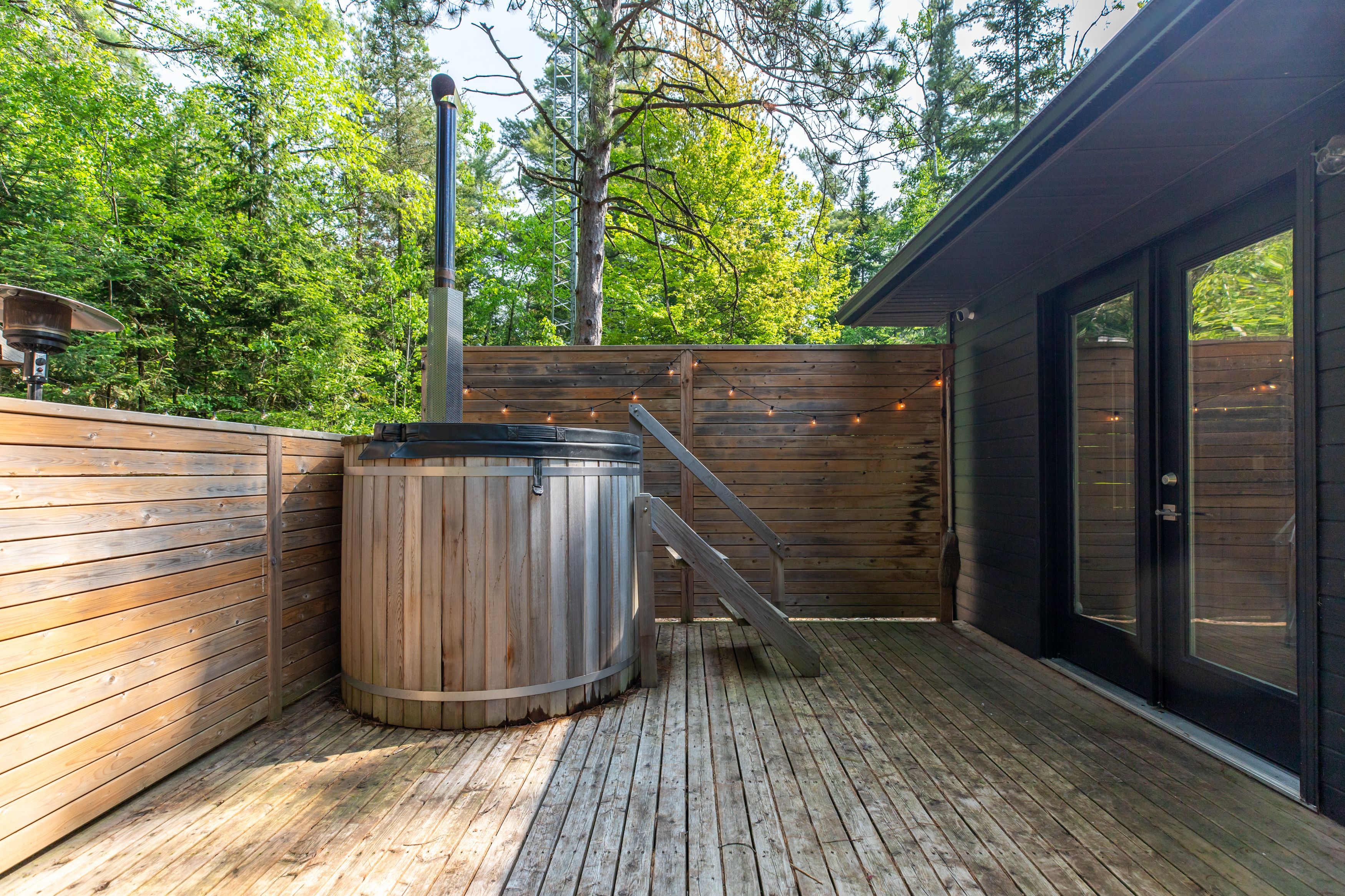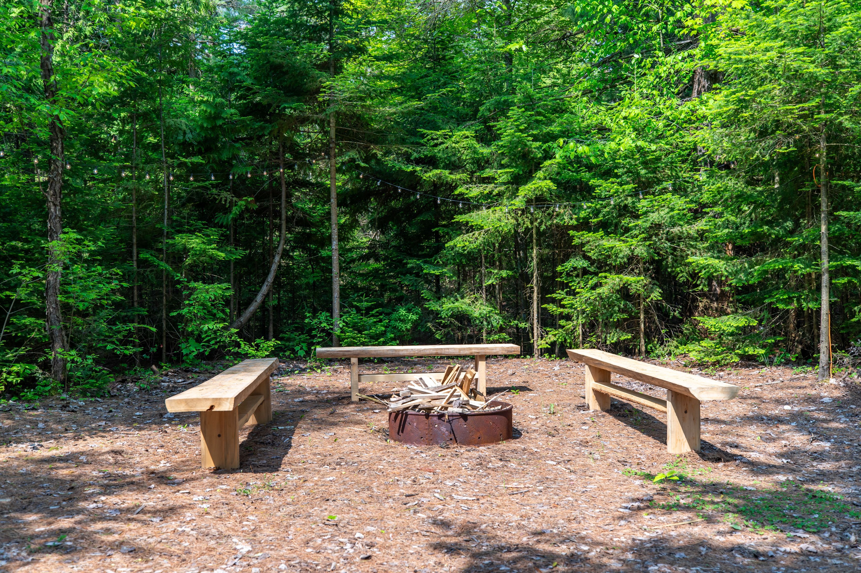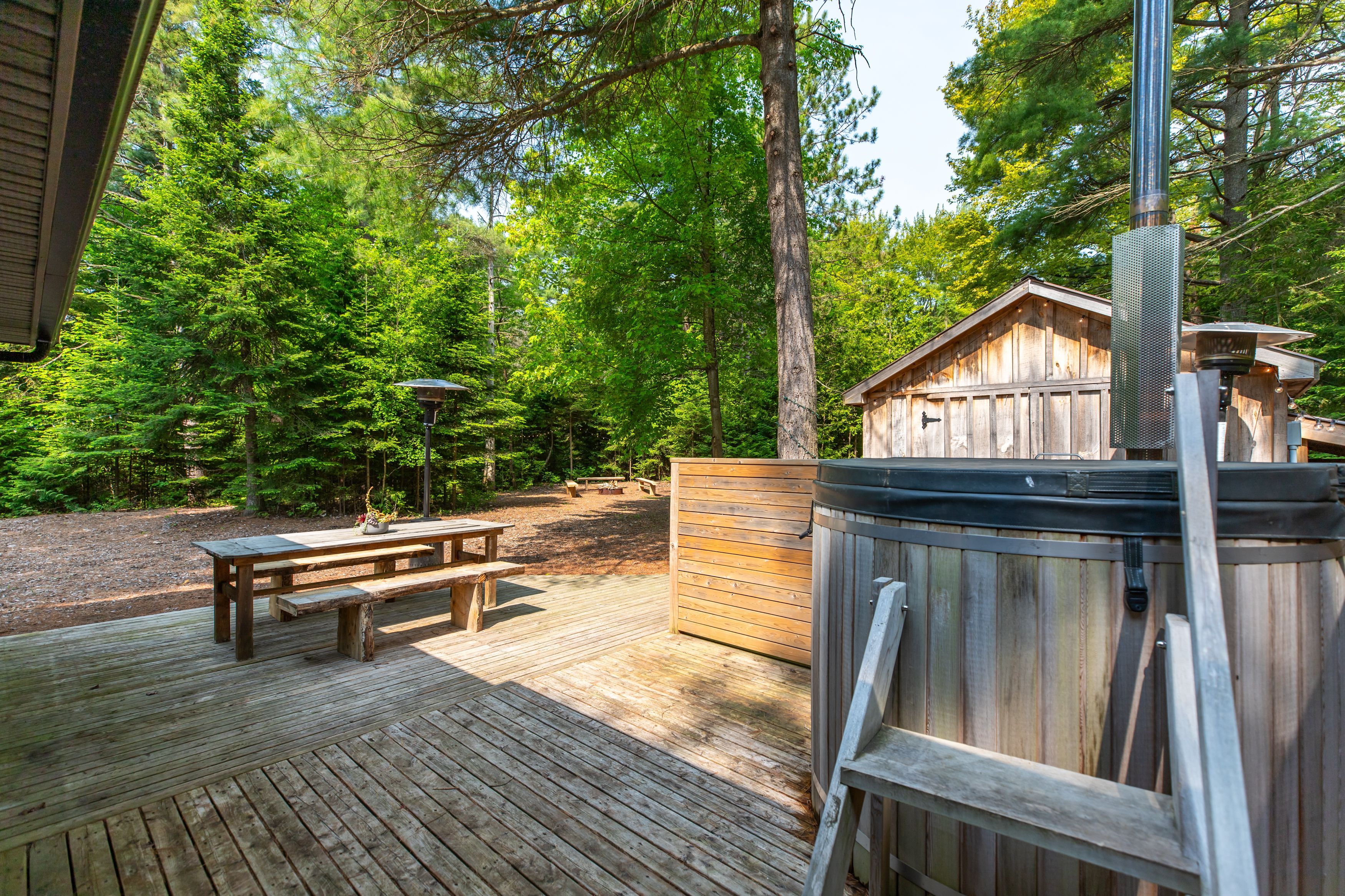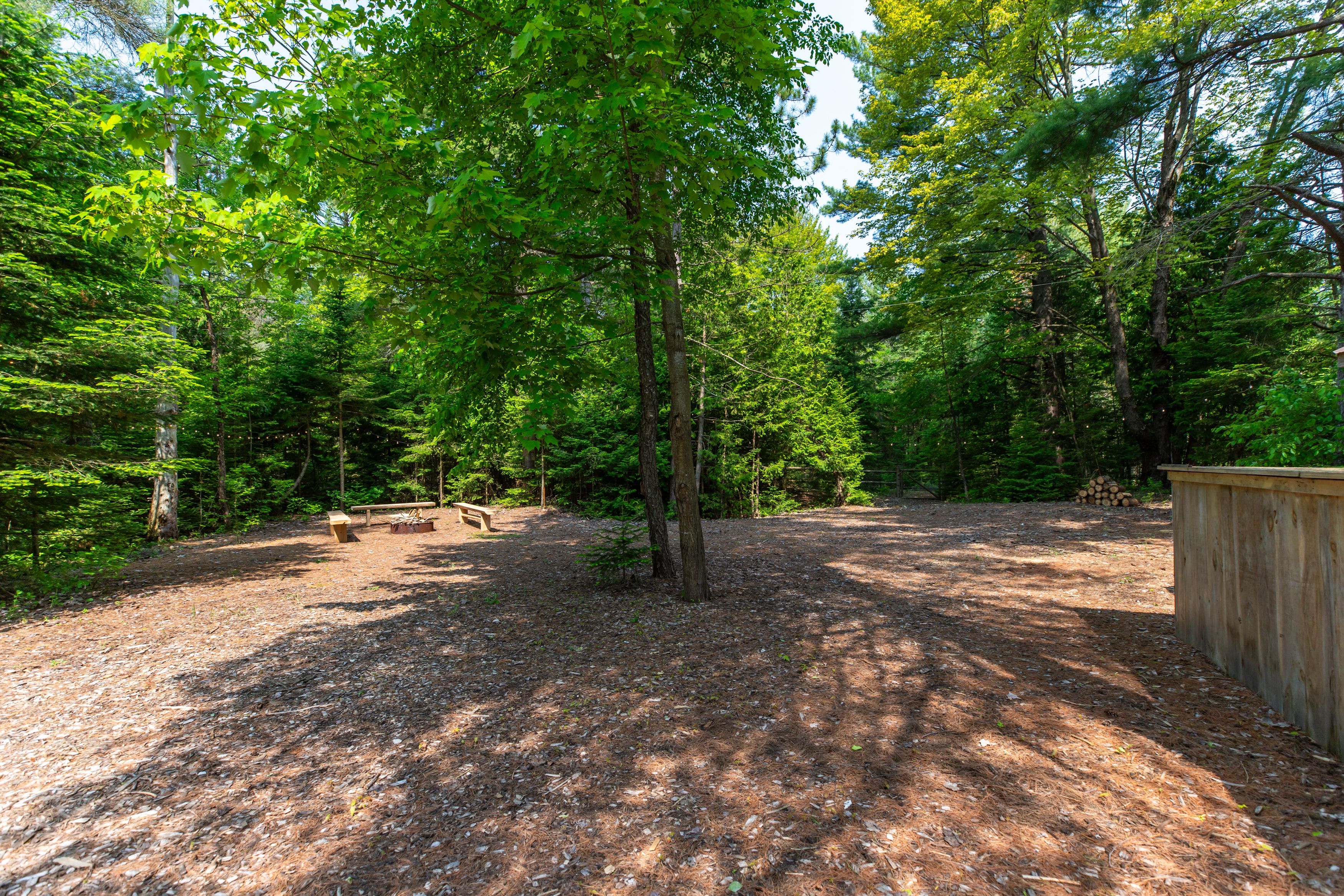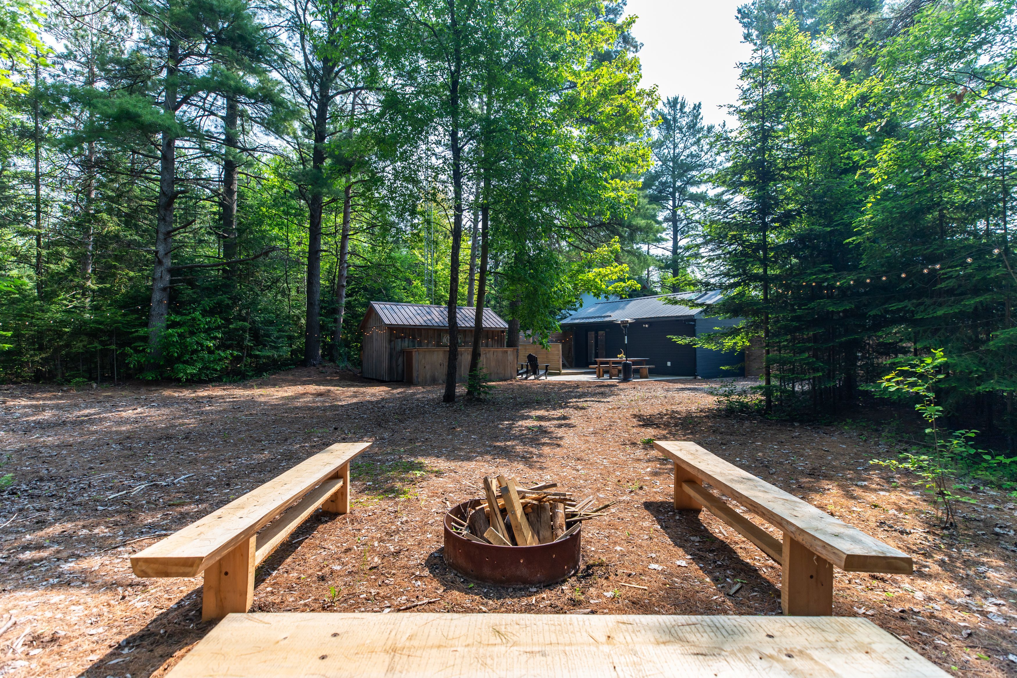 • Multiple outdoor spaces with a hot tub and campfire area.