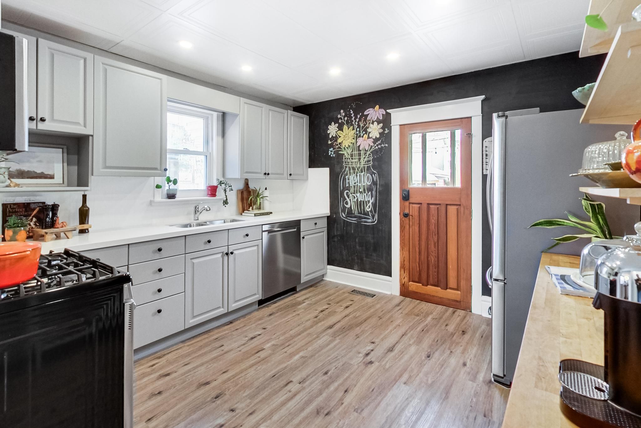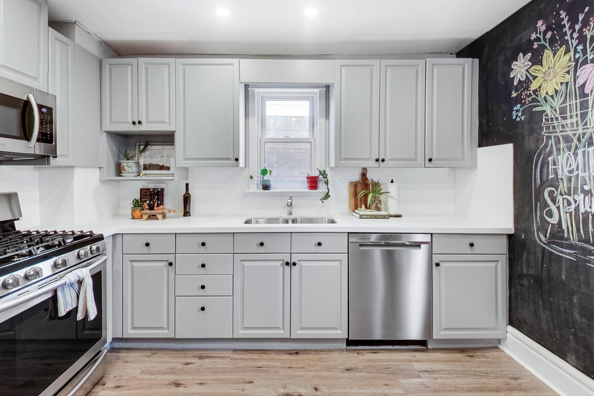 • Updated kitchen featuring stainless steel appliances and quartz countertops.