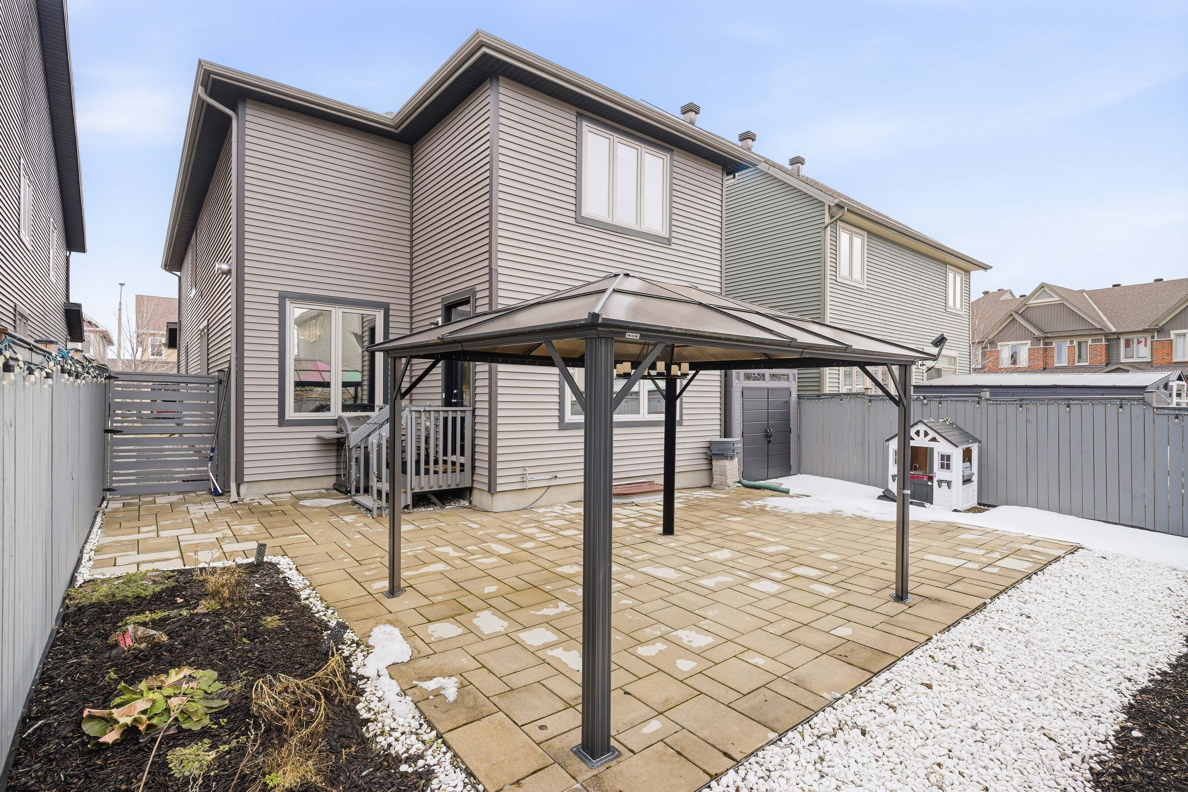 • Fully fenced yard with gazebo for enjoyable outdoor gatherings.
