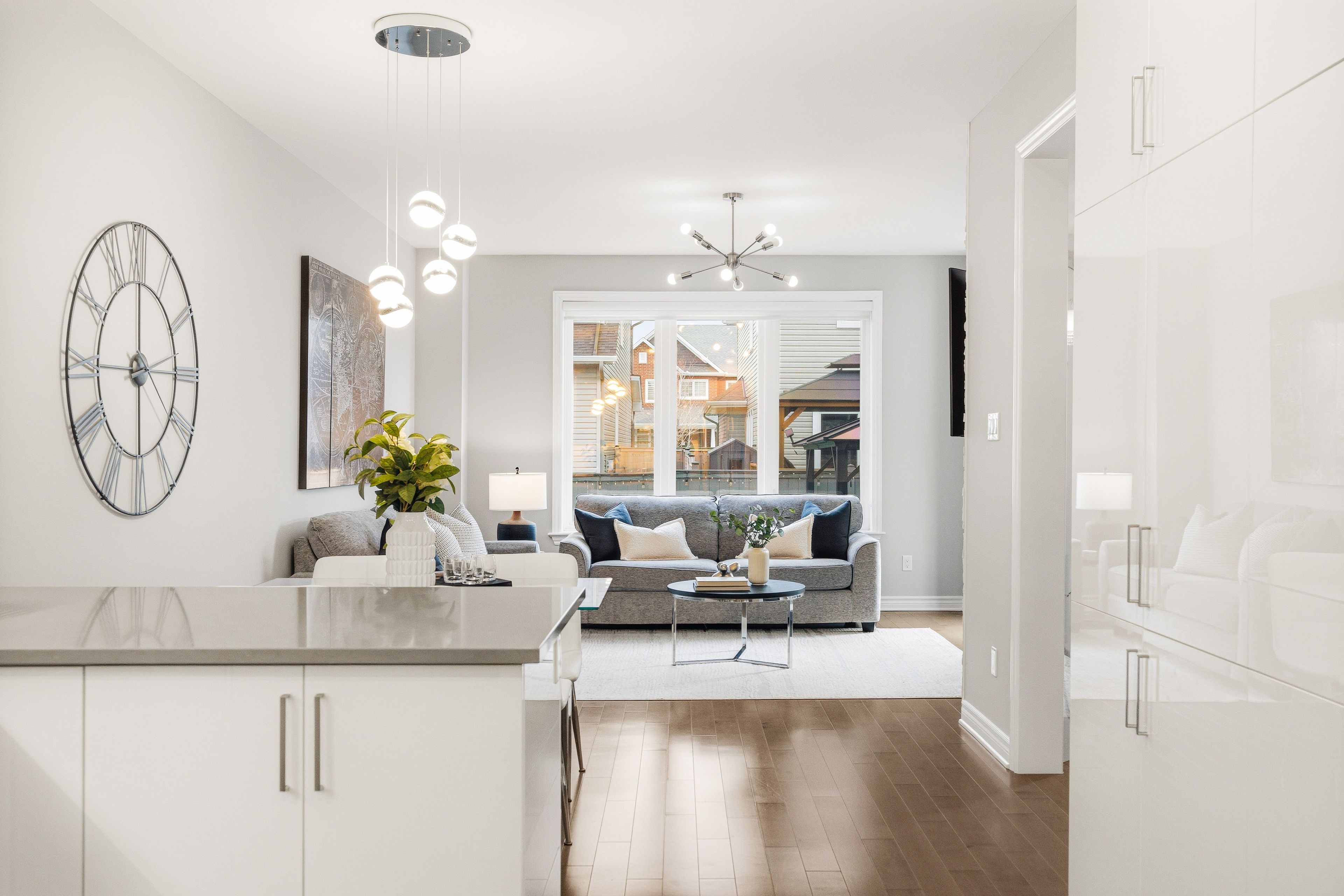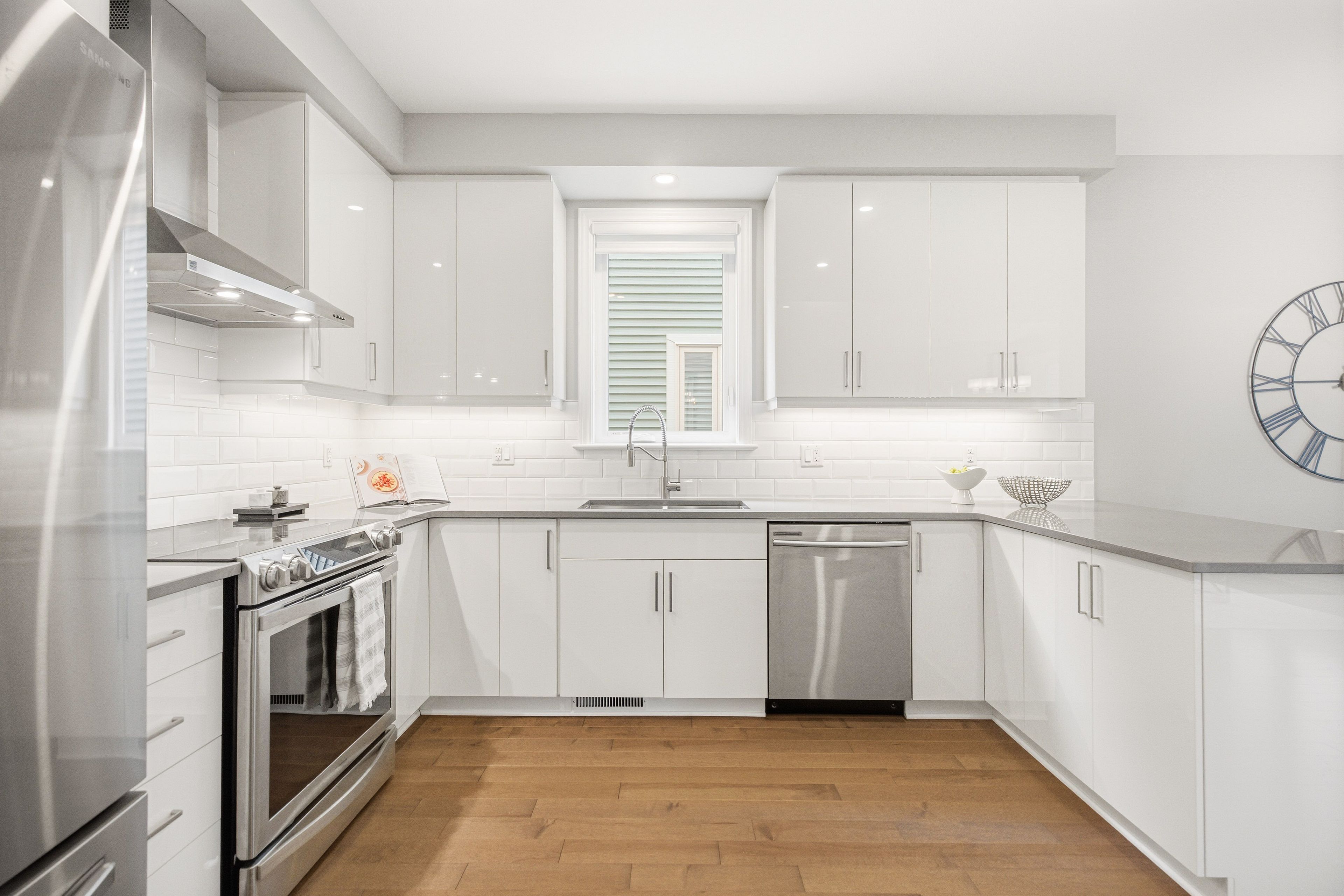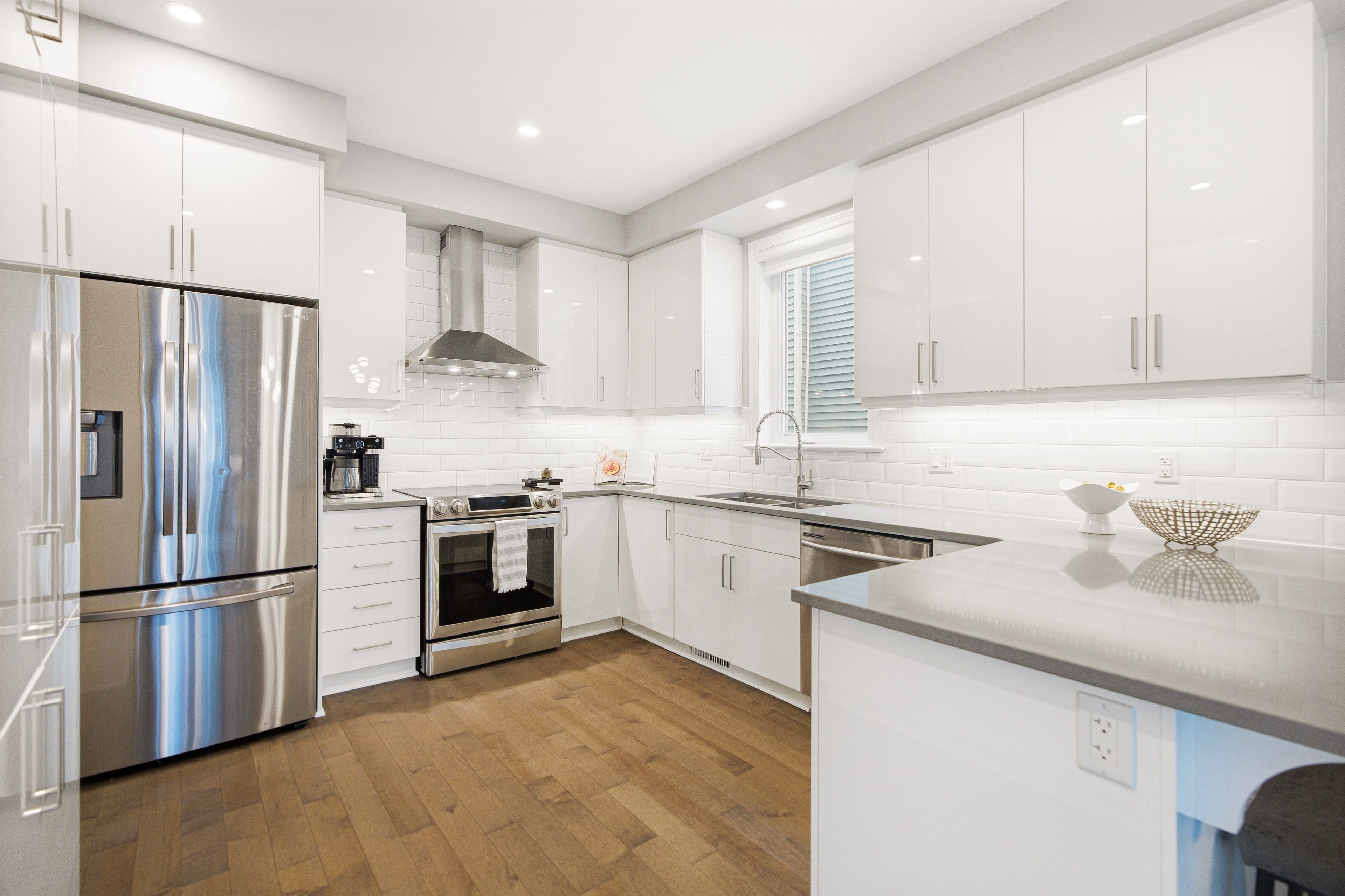 • Kitchen features quartz counters, upgraded cabinetry, and ample counter space.