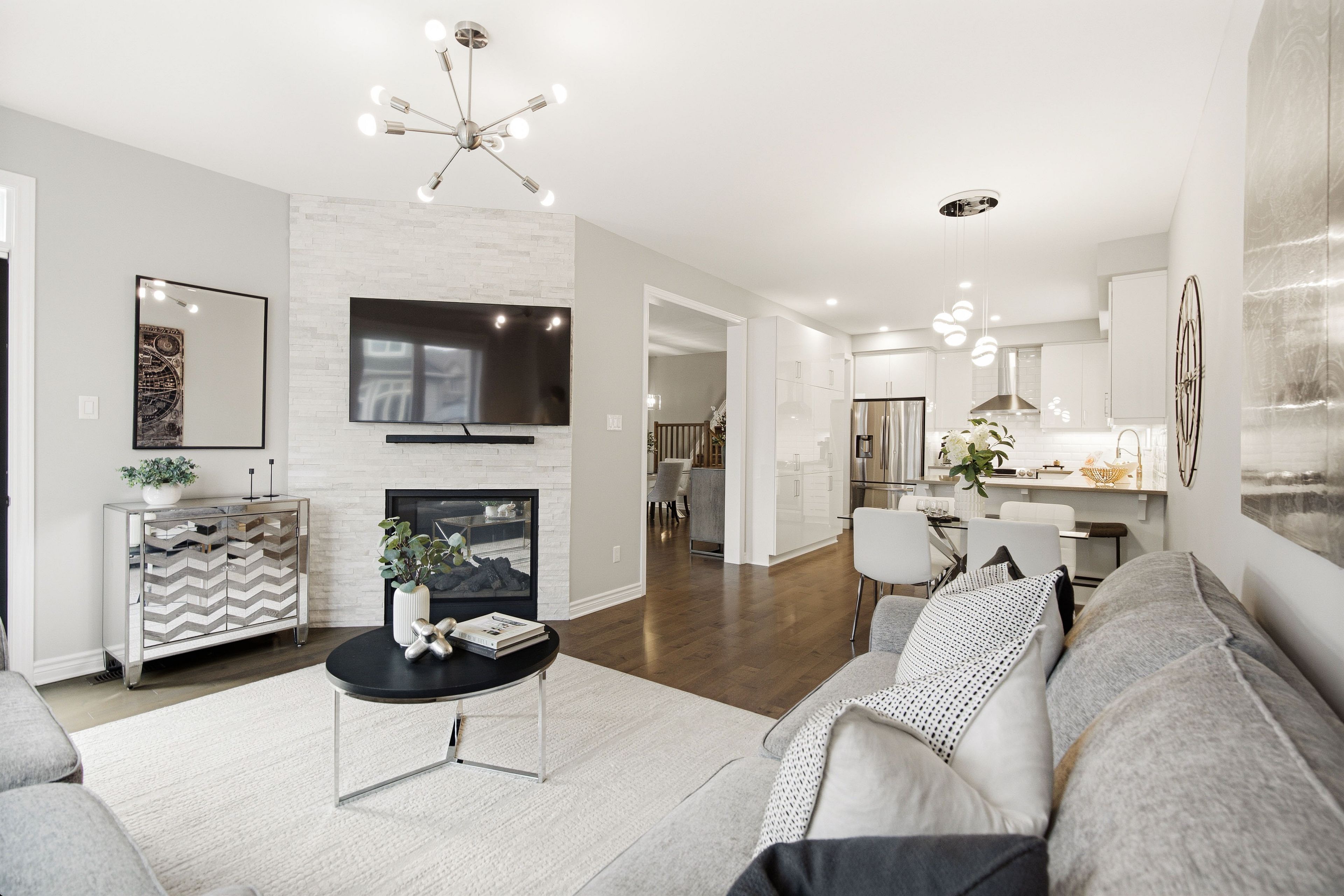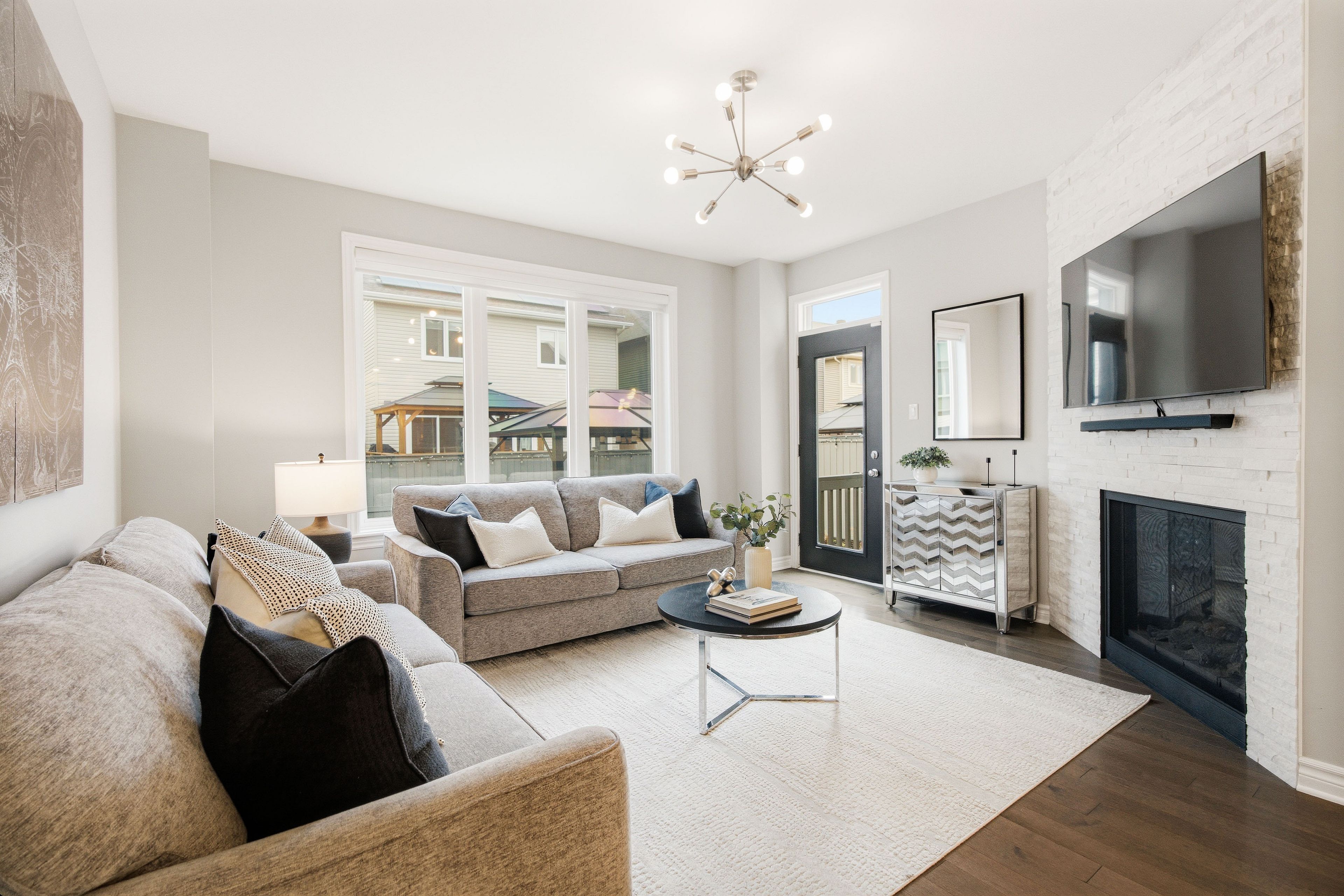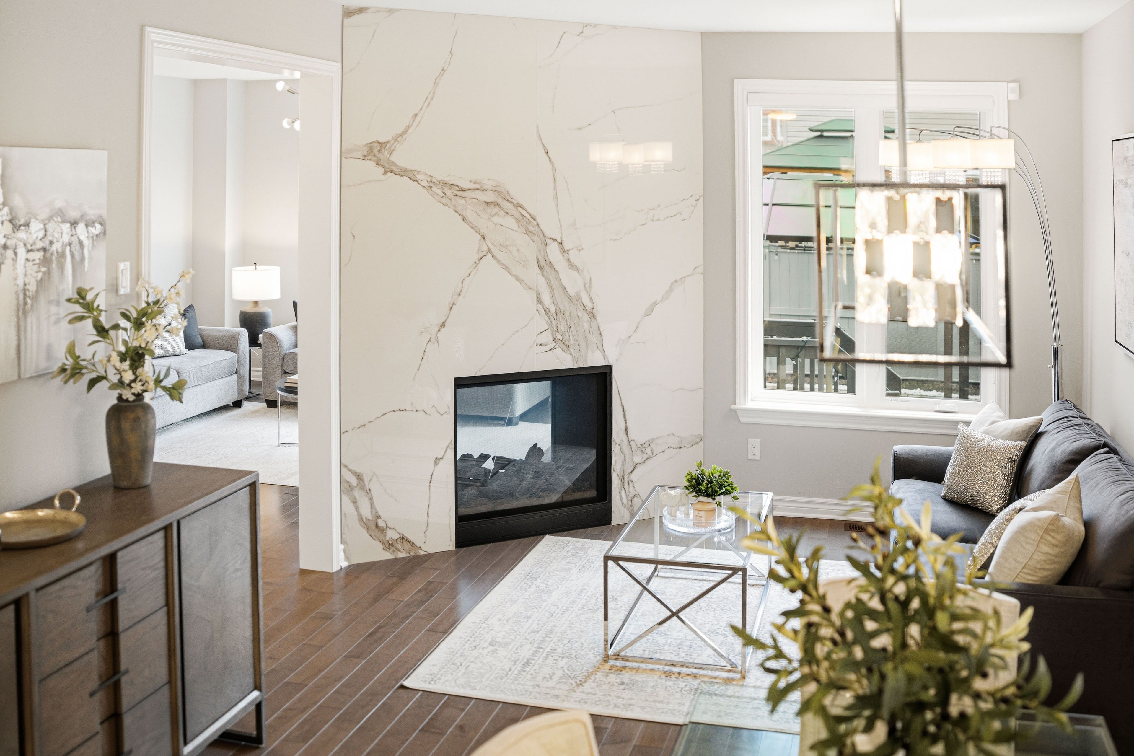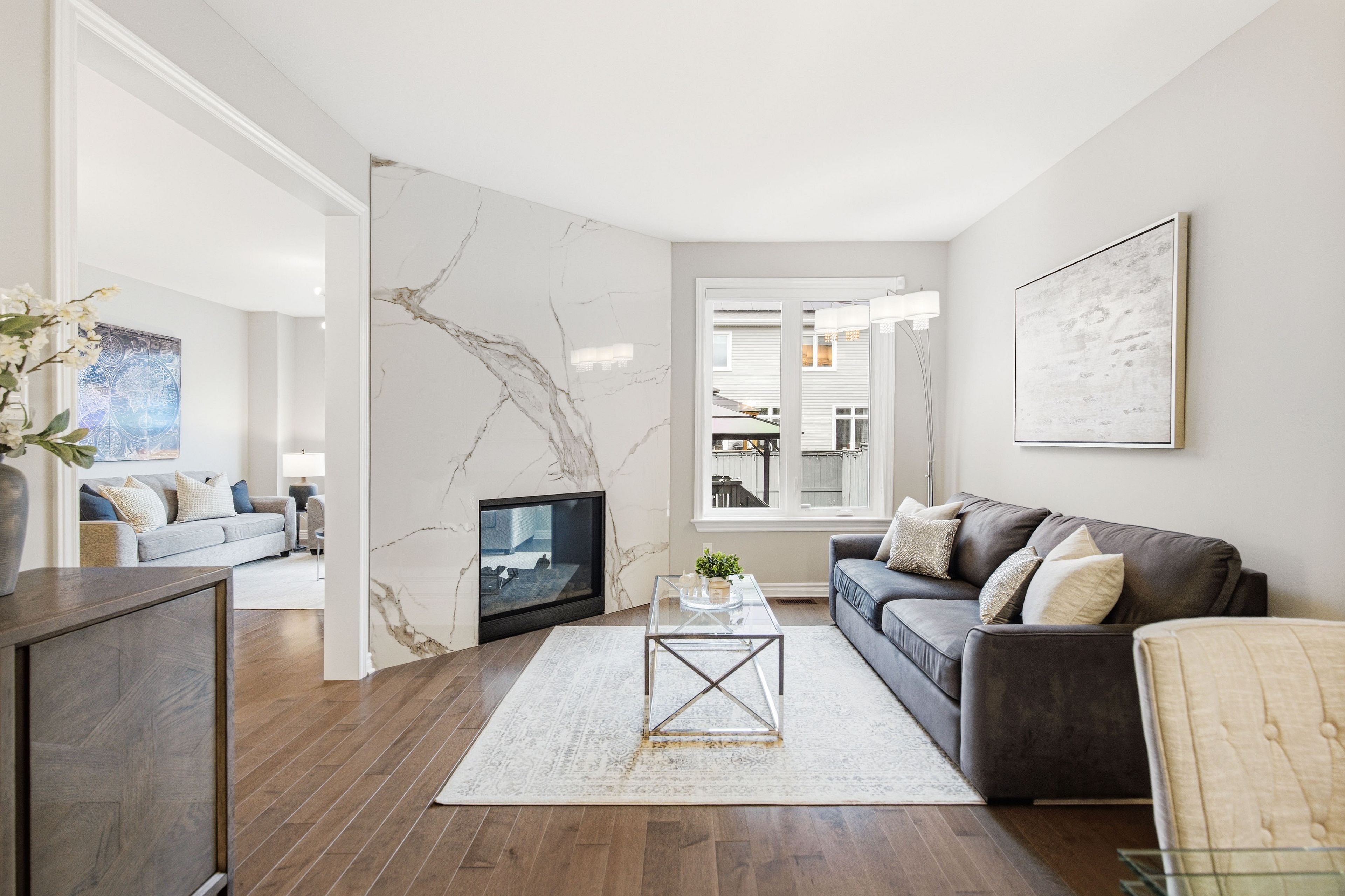 • Two-sided fireplace in the living room creates a cozy atmosphere.