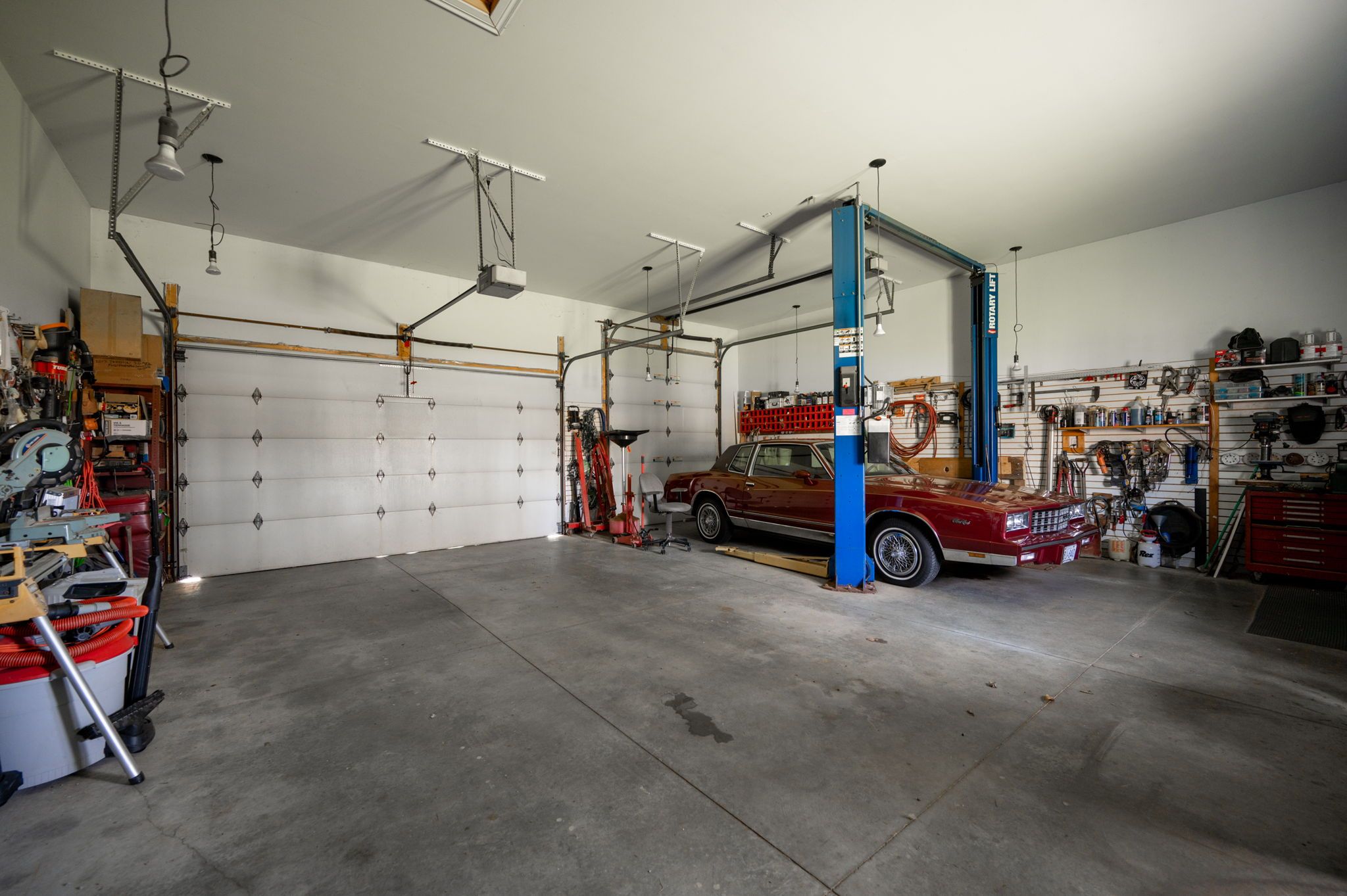 • Two garages, one heated and equipped with a hoist for car enthusiasts.
