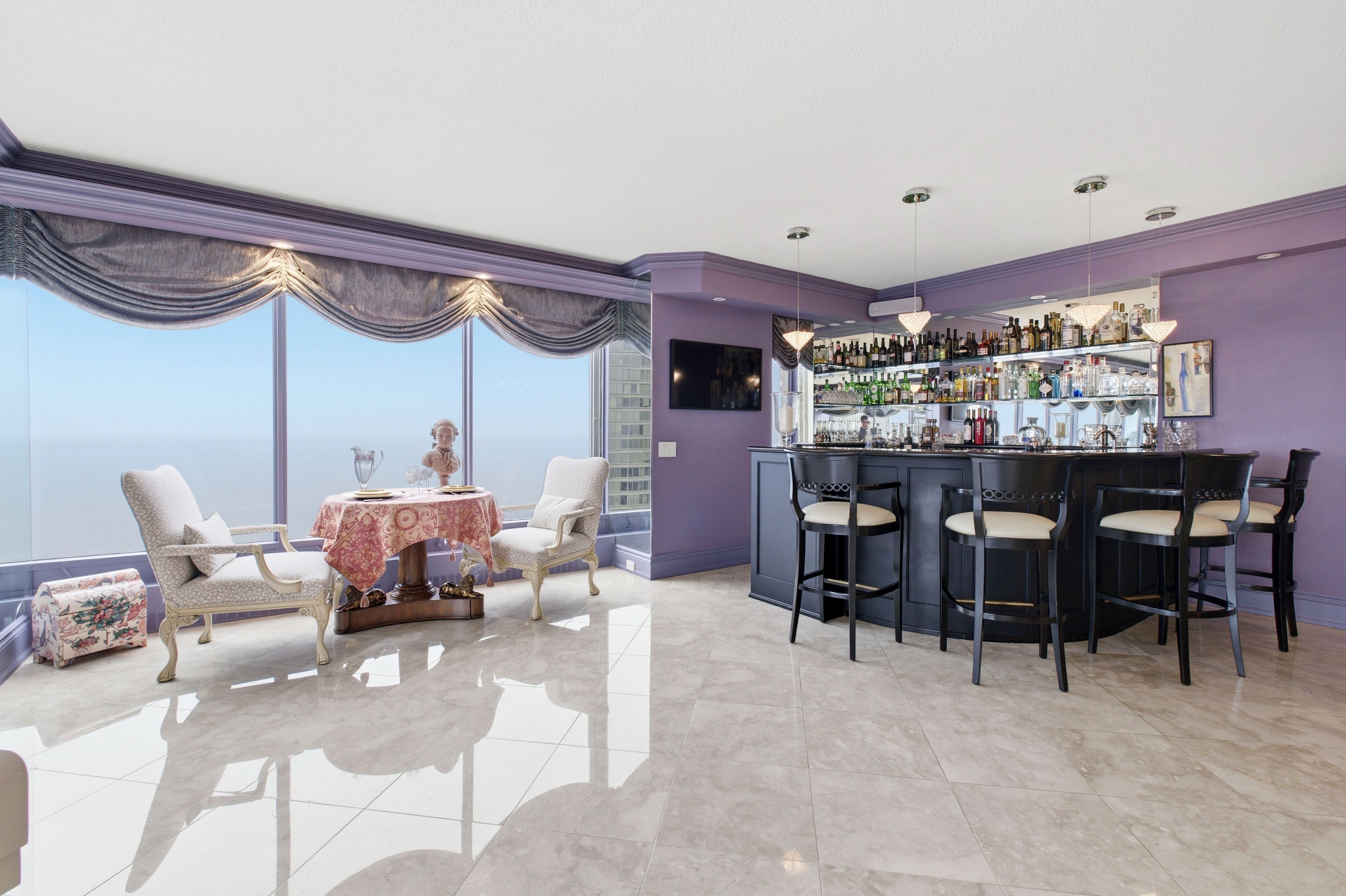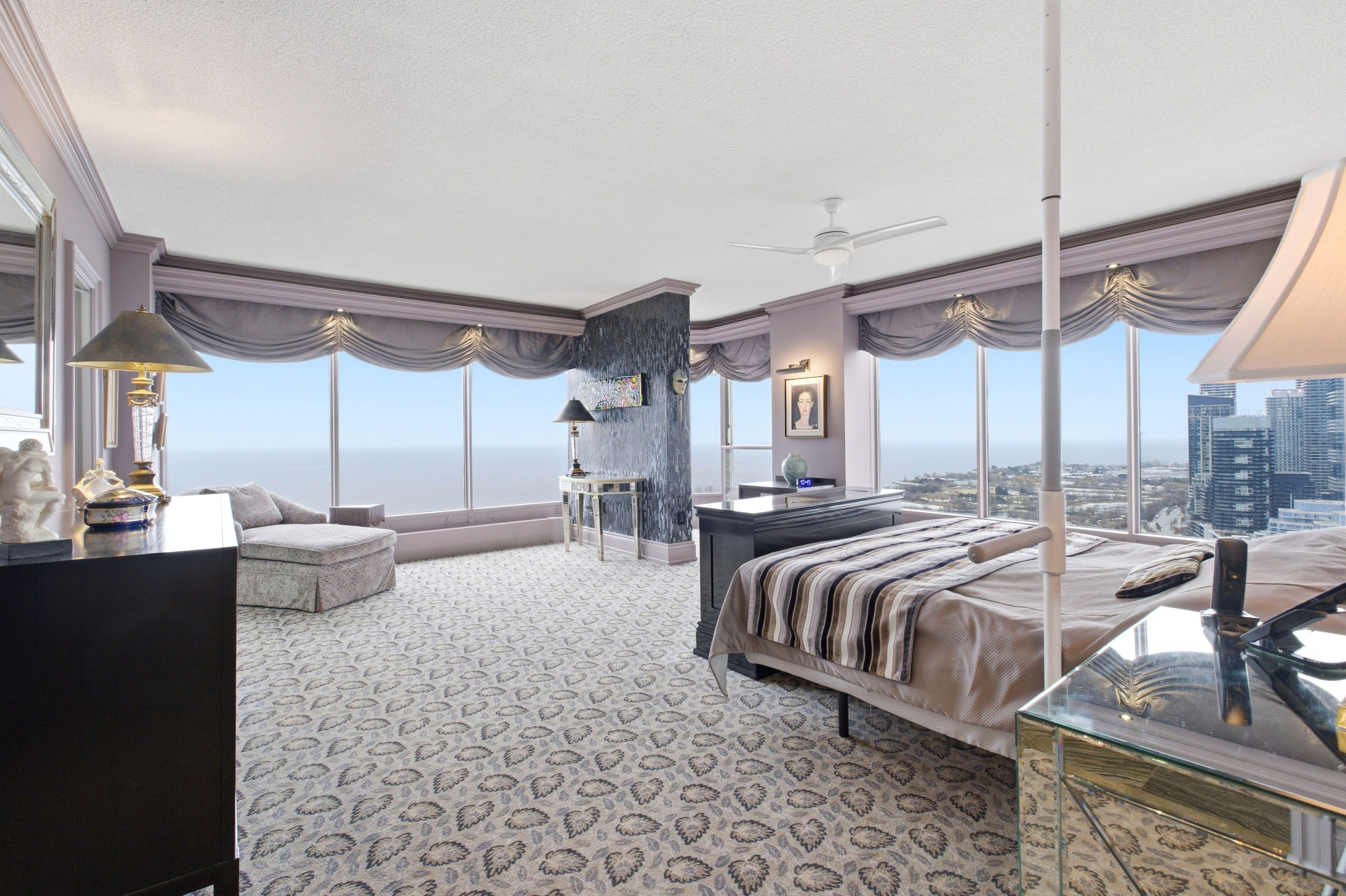 Spacious 3,247 sq. Ft residence on the 36th floor of the luxurious resort-style palace pier showcasing breathtaking lake and city skyline views. Elegant wainscoting enhances the foyer and corridors, complemented by marble and porcelain flooring throughout. The open-concept kitchen features a marble peninsula, statement marble wall, and backsplash overlooking the breakfast area and family room with built-in wall unit. The great room offers a dining area, built-in bar, solarium with julitette balcony, custom electric fireplace, and automated blinds on the floor to ceiling windows. Lots of natural light and beautiful view of lake ontario! The primary suite includes two large walk-in closets, solarium with juilette balcony, luxurious 5-piece bath, and pop-up tv. A truly exceptional home with refined custom finishes. Two bedrooms were converted to a custom office/library with built-ins and fireplace which can be easily converted back to two bedrooms. Amenities include: fitness and aerobics center, restaurant, club on 47th floor, media room , event kitchen stage for events, terraces, tennis court, putting green, squash courts, golf simulator table tennis room billiards room party room, convenience store, spa, arts and crafts room, childrens playroom , 24 hour concierge, 18 hour valet service, hourly bus service to downtown 6 days a week, 7 guest suites, large indoor swimming pool with whirlpool and sauna, av charging stations, car wash, pets allowed with restrictions