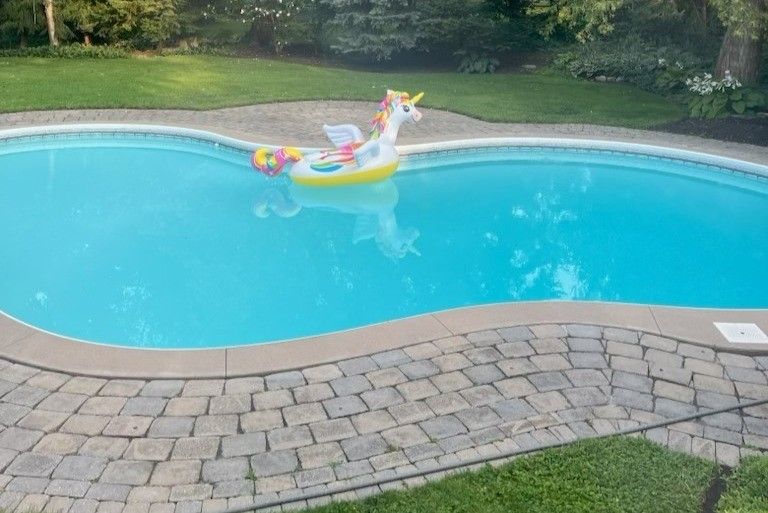 • Spacious covered porch and large stone patio with in-ground pool for outdoor enjoyment.