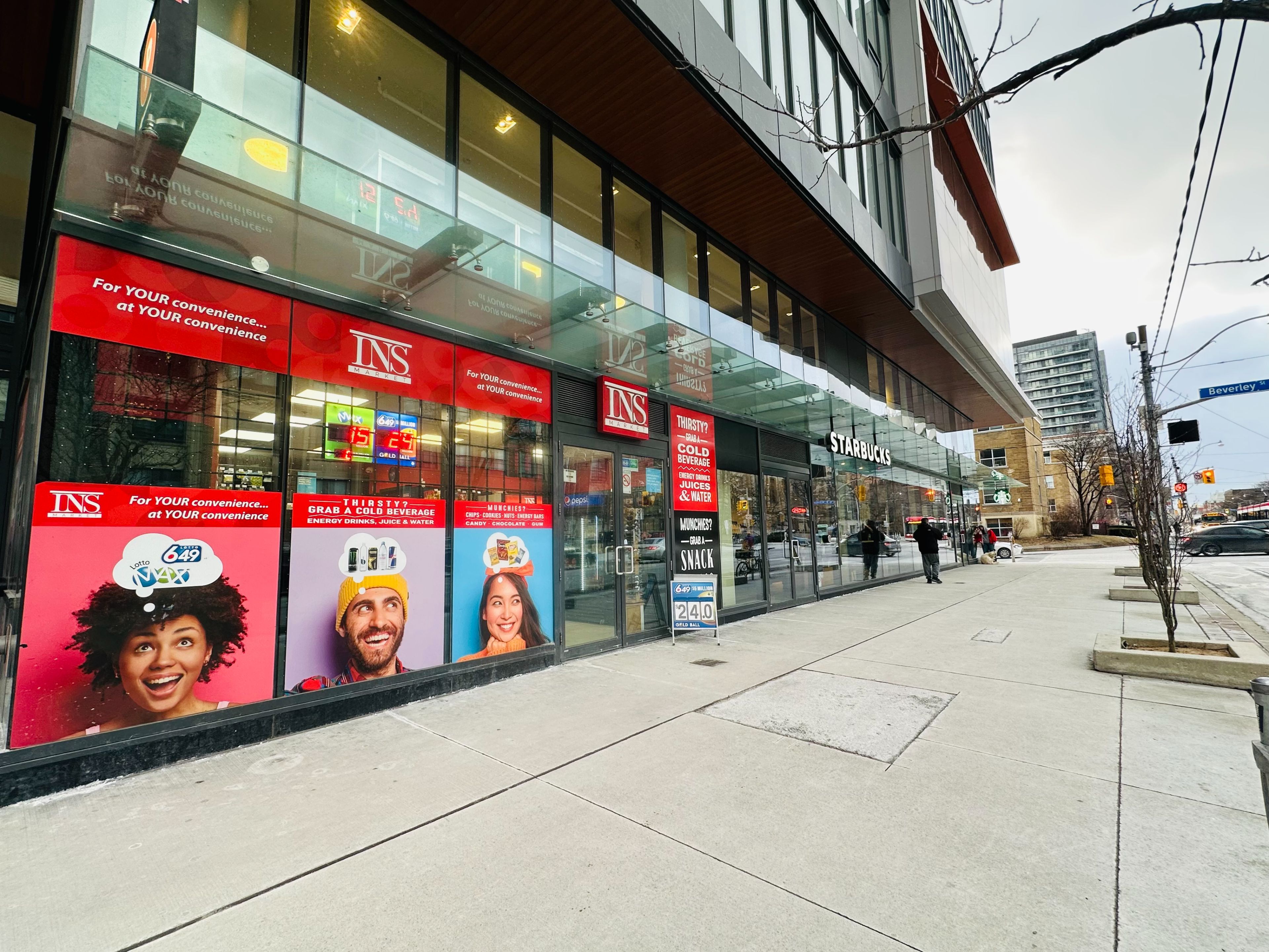 Ins market franchise business unique location with no competitor nearby in very busy and high traffic area at college st & beverley st across from university of toronto with over 60 thousand students next to braemar college and dalla lana school, 400 meters from queens park subway station, weekly sales approximately $12000(as per seller), low 25% cigarettes sales, high 75% sales from high profit items like beverage and snacks with over 65% profit margin, lotto commission approximately $600/month, rent & tmi $5319. 02/m, long lease until jun 2029+5 options, open hours 7am to 10pm monday to friday. Sat 10am-9pm, sun 12-5pm one person job, very high profit margin, low flat fee for royalty and advertising.