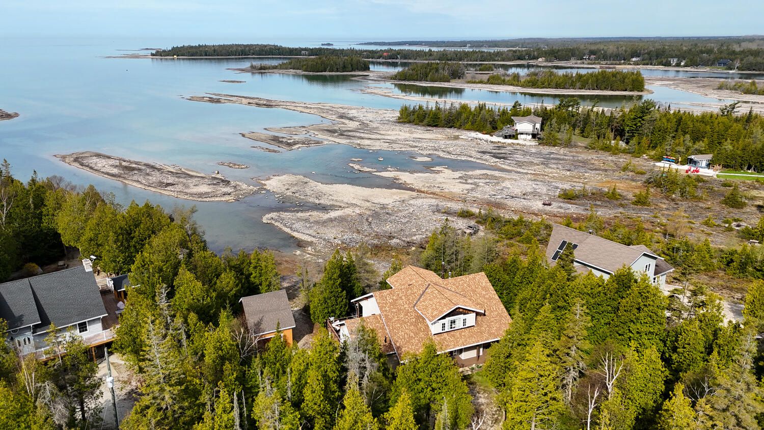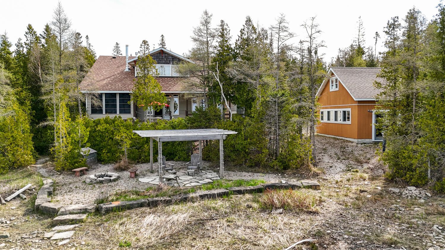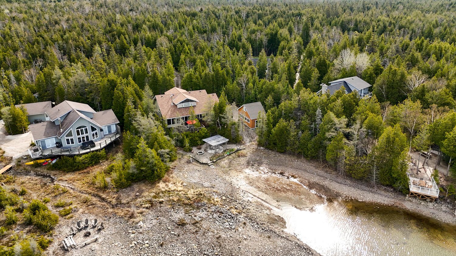 Turn-key lakefront home/cottage with sandy shoreline! Your bruce peninsula retreat near tobermory awaits. Offering a rare sandy beach shoreline in a protected cove, this property is perfect for family getaways, weekend retreats or retirement living. Sited a short drive to tobermory and directly across from the bruce peninsula national park, this property delivers the ultimate four-season recreational lifestyle. Arrive via a winding, tree-lined driveway and step into a serene setting with panoramic lake views and spectacular sunsets. Enjoy outdoor living with expansive decks, a stone waterfront patio, and covered porches - ideal for relaxing, entertaining, or soaking in the natural surroundings. The clean, sandy-bottom waterfront offers easy entry for all ages-perfect for swimming, kayaking, paddleboarding, and endless summer fun. Evenings are made for campfires by the shore, with the gentle sound of waves completing the experience. Inside, this thoughtfully designed 3 bedroom, 2-bathroom home/cottage features a bright kitchen, dining, and living area with vaulted ceilings. A double-sided fireplace adds warmth and ambiance to both the living room and primary bedroom retreat. The main floor includes a spacious secondary bedroom, a full bath, plus a private primary suite with ensuite and walkout to a screened three-season sunroom. A perfect getaway for morning coffee or quiet evenings by the woodstove. The loft-style bedroom is a dream for kids, with space for bunk beds and play, or consider use as a home office, taking in the elevated lake views. Additional features include a detached garage with loft space for storage. Offered fully furnished (turnkey), this is a ready-to-enjoy waterfront property in one of ontario's premier cottage country destinations. Close to hiking the bruce trail, the grotto, georgian bay, and lake huron - this is your gateway to adventure and relaxation.