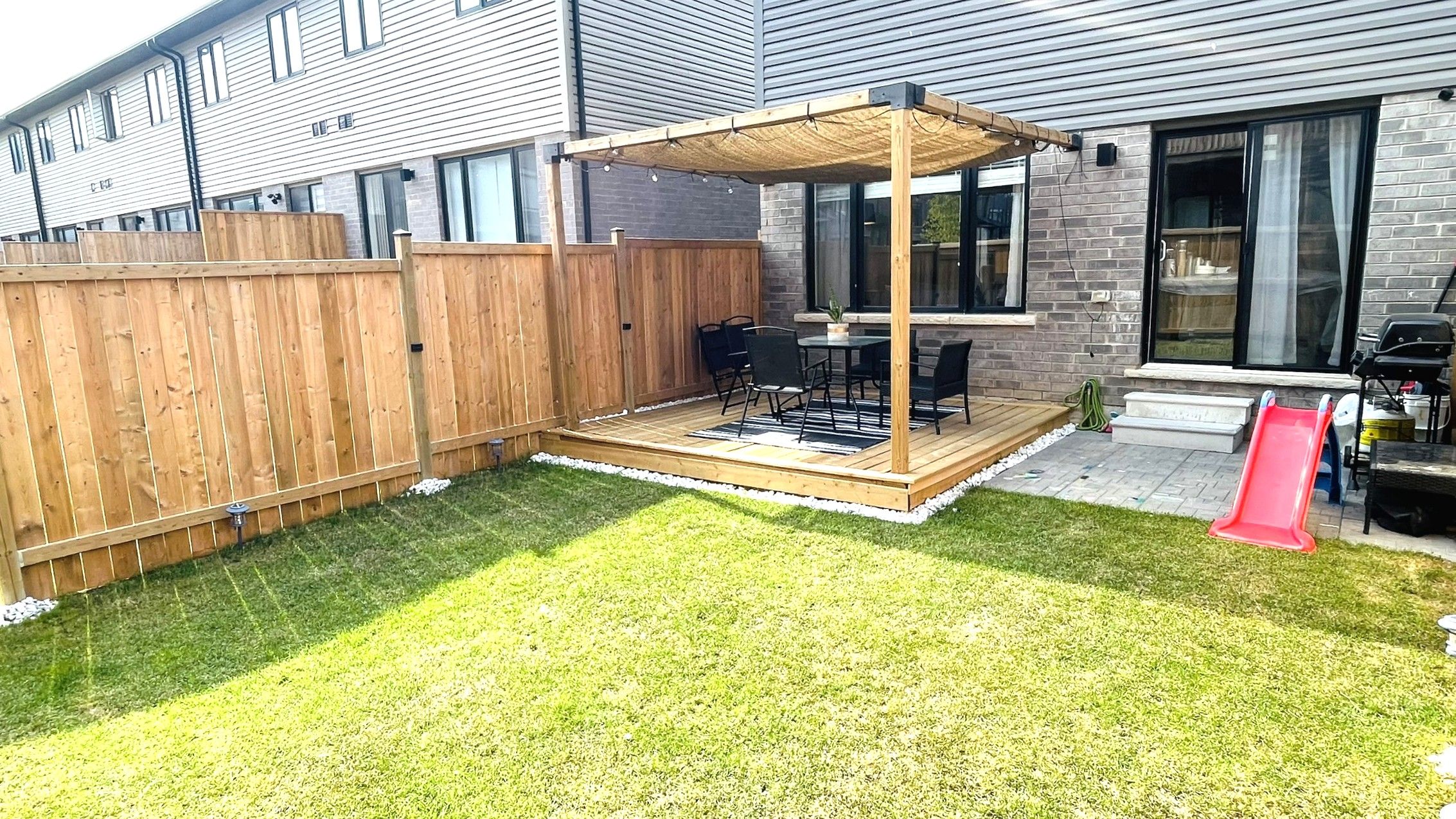 • Fully fenced backyard with a stylish floating deck for outdoor enjoyment.