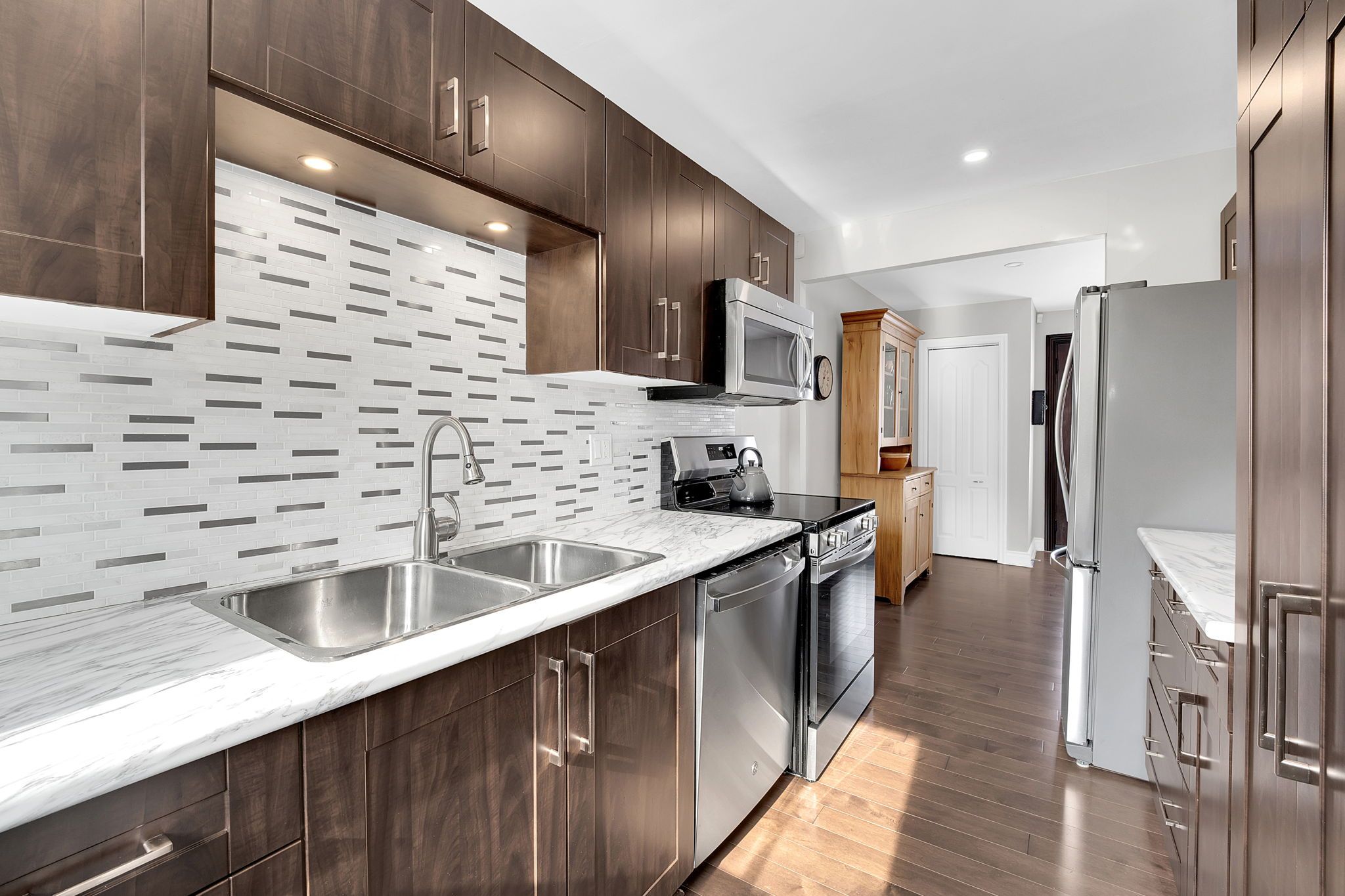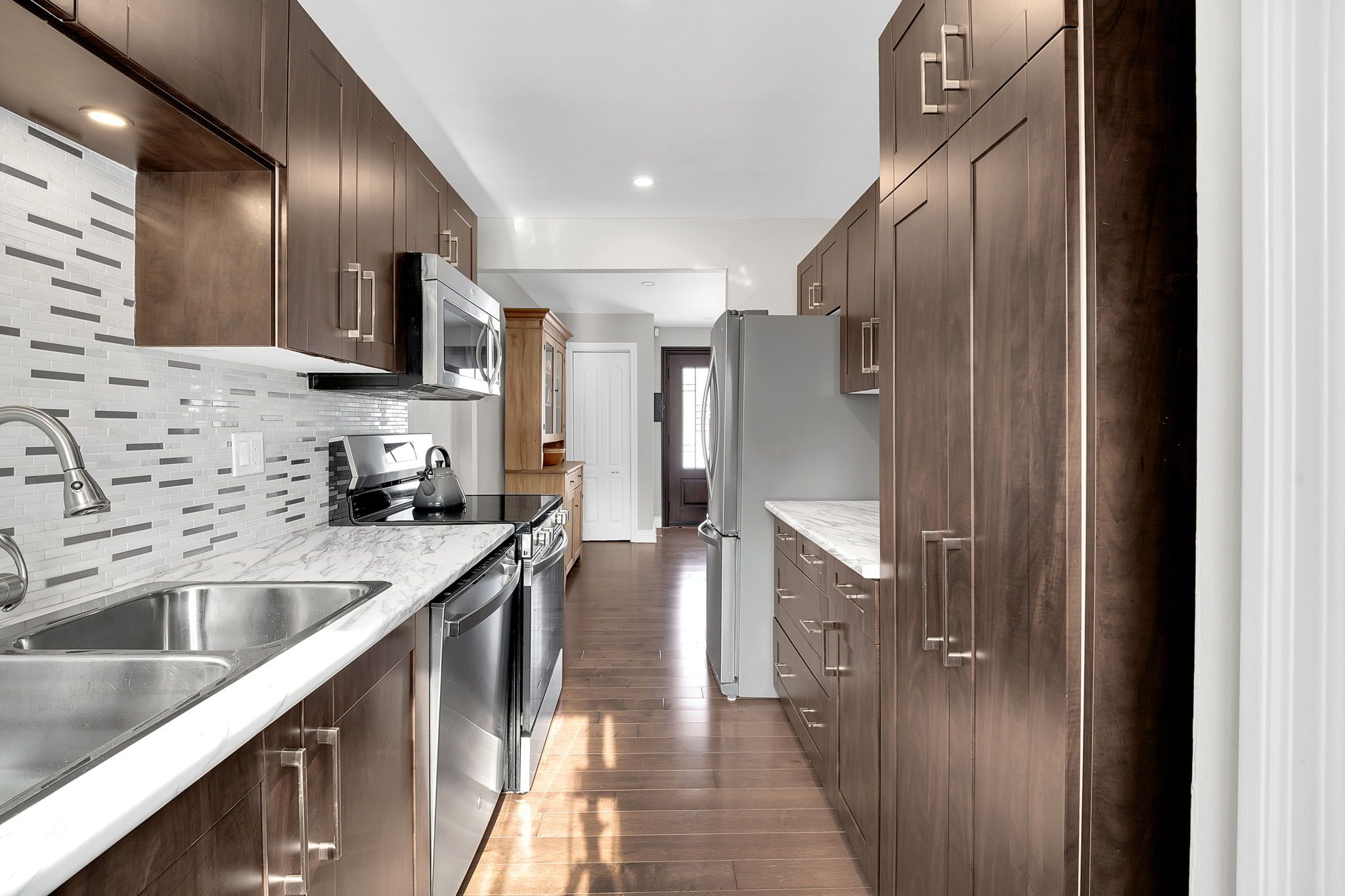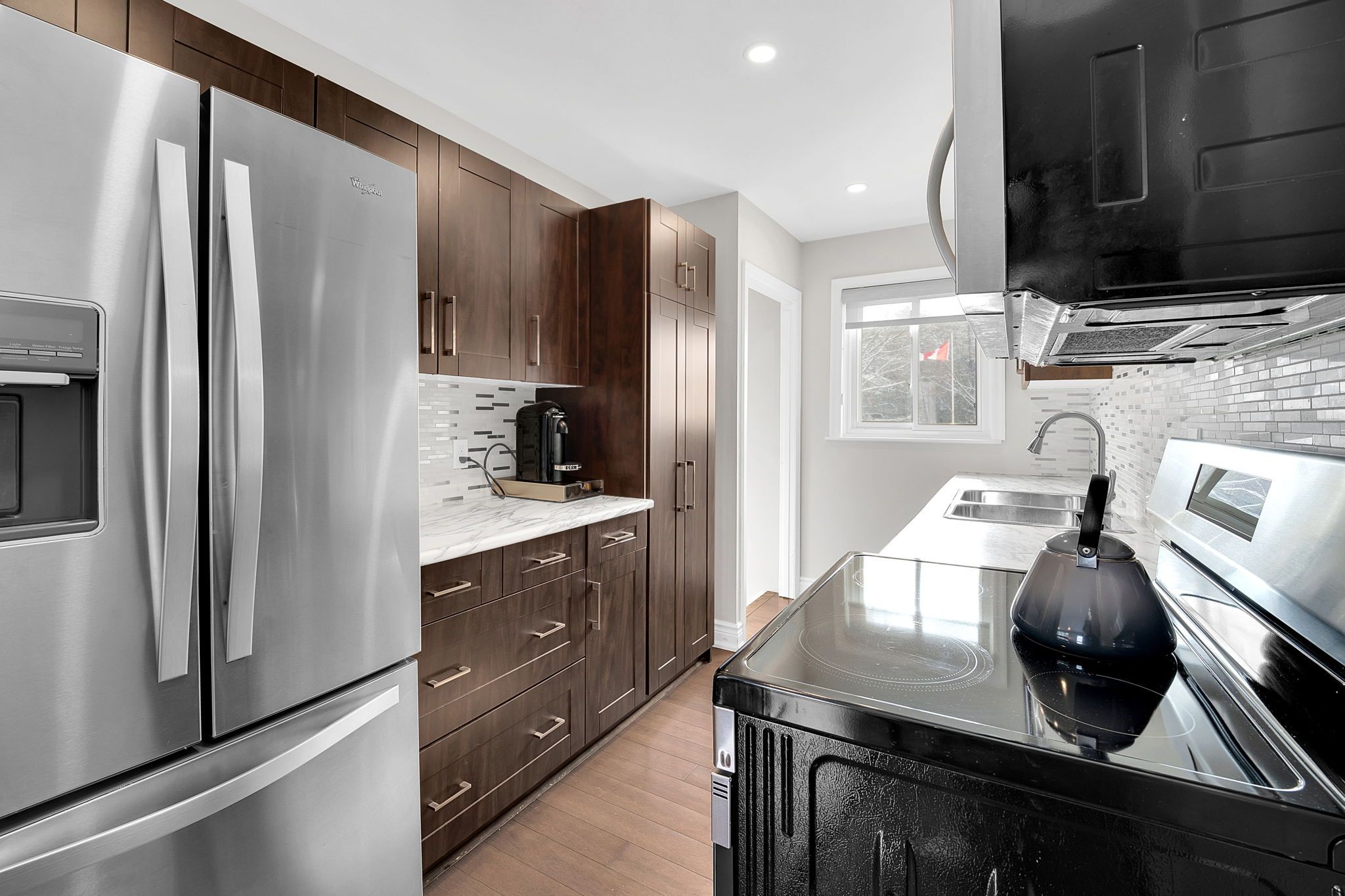 • Updated galley kitchen with stainless steel appliances and backyard view.