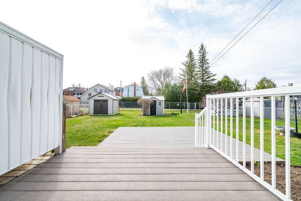 • Maintenance-free Trex deck overlooking a large backyard with two storage sheds.