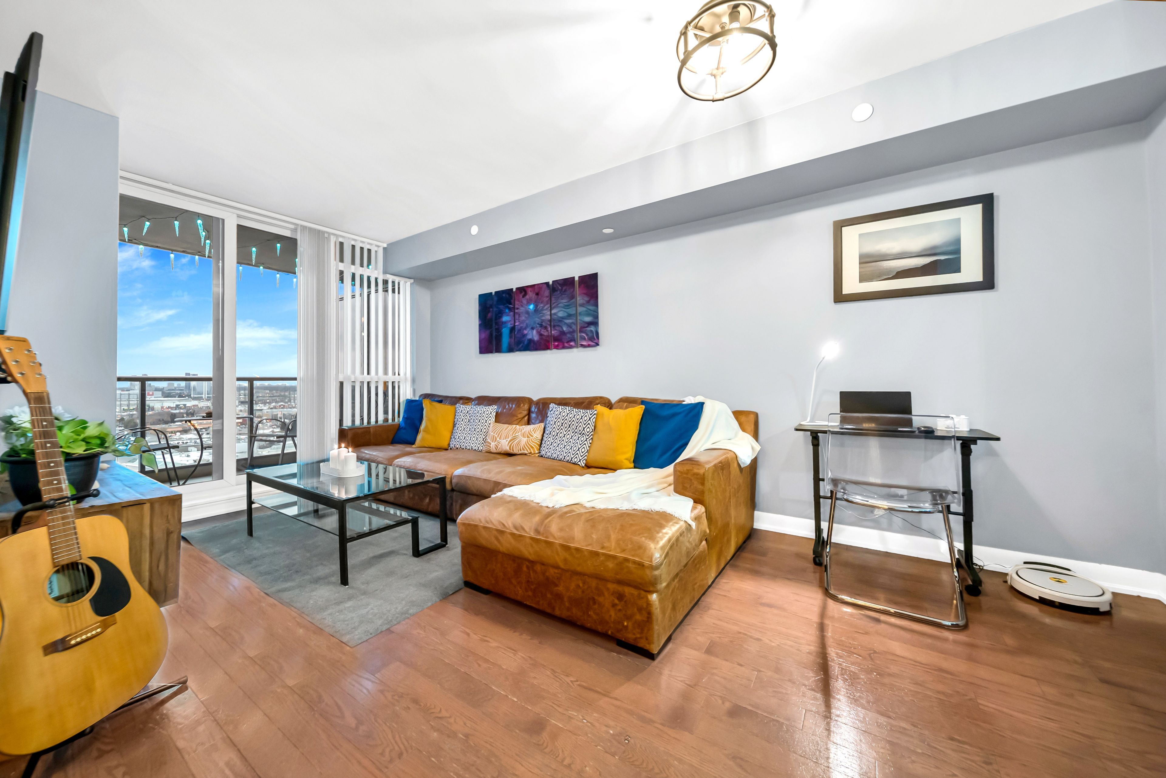 • Bright interior with floor-to-ceiling windows and rich hardwood floors.