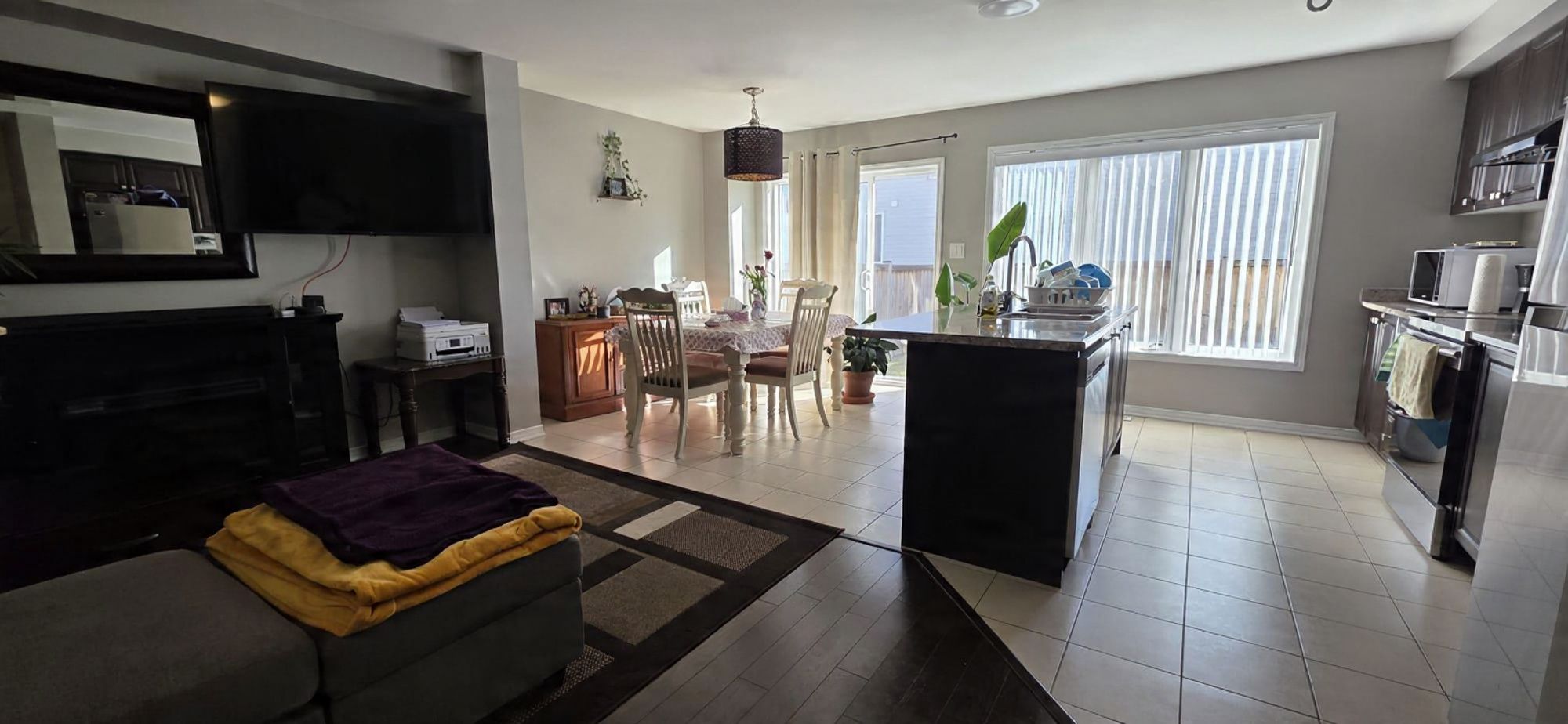 • Bright open-concept main floor with large windows and modern kitchen.