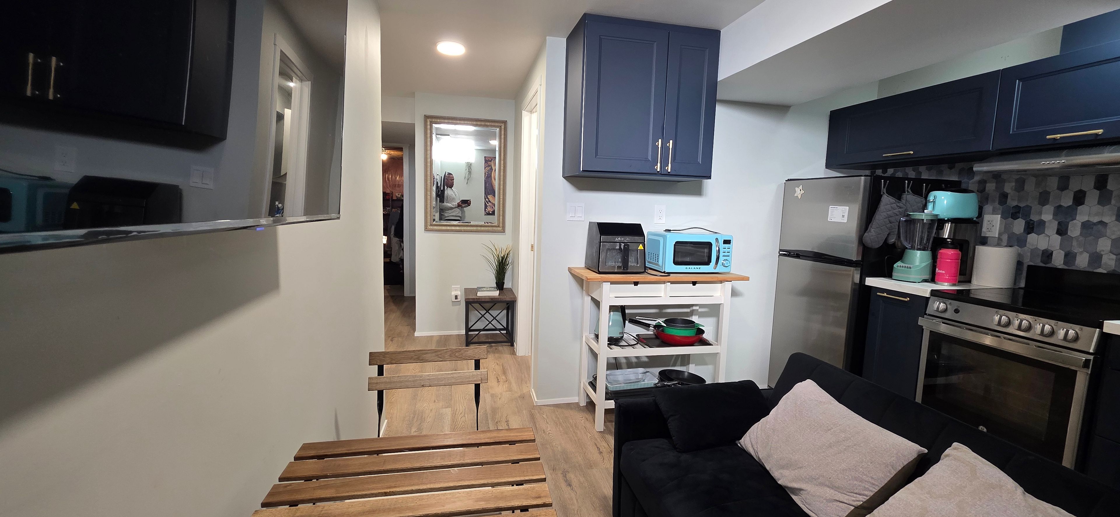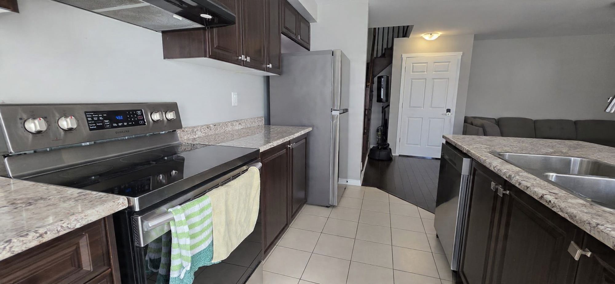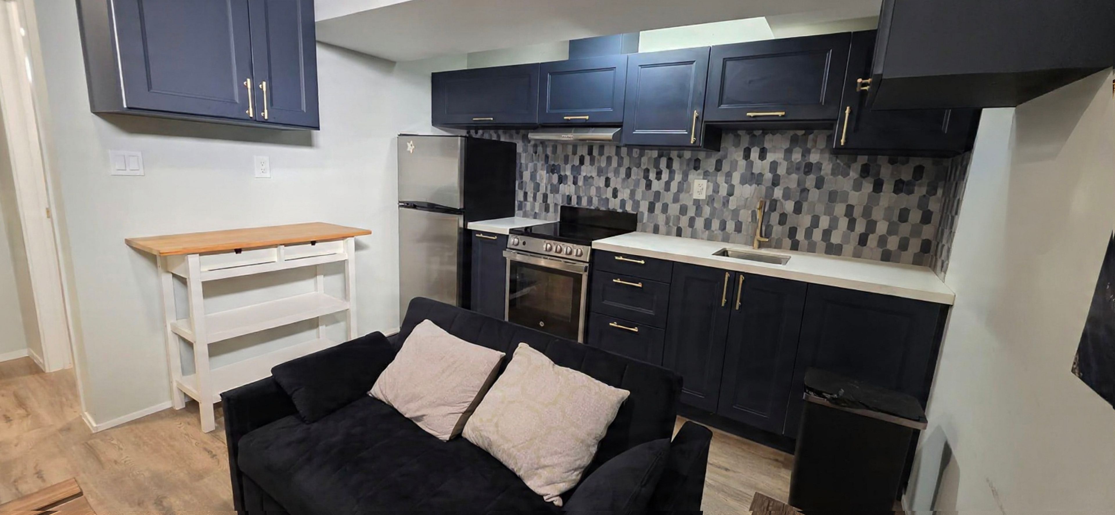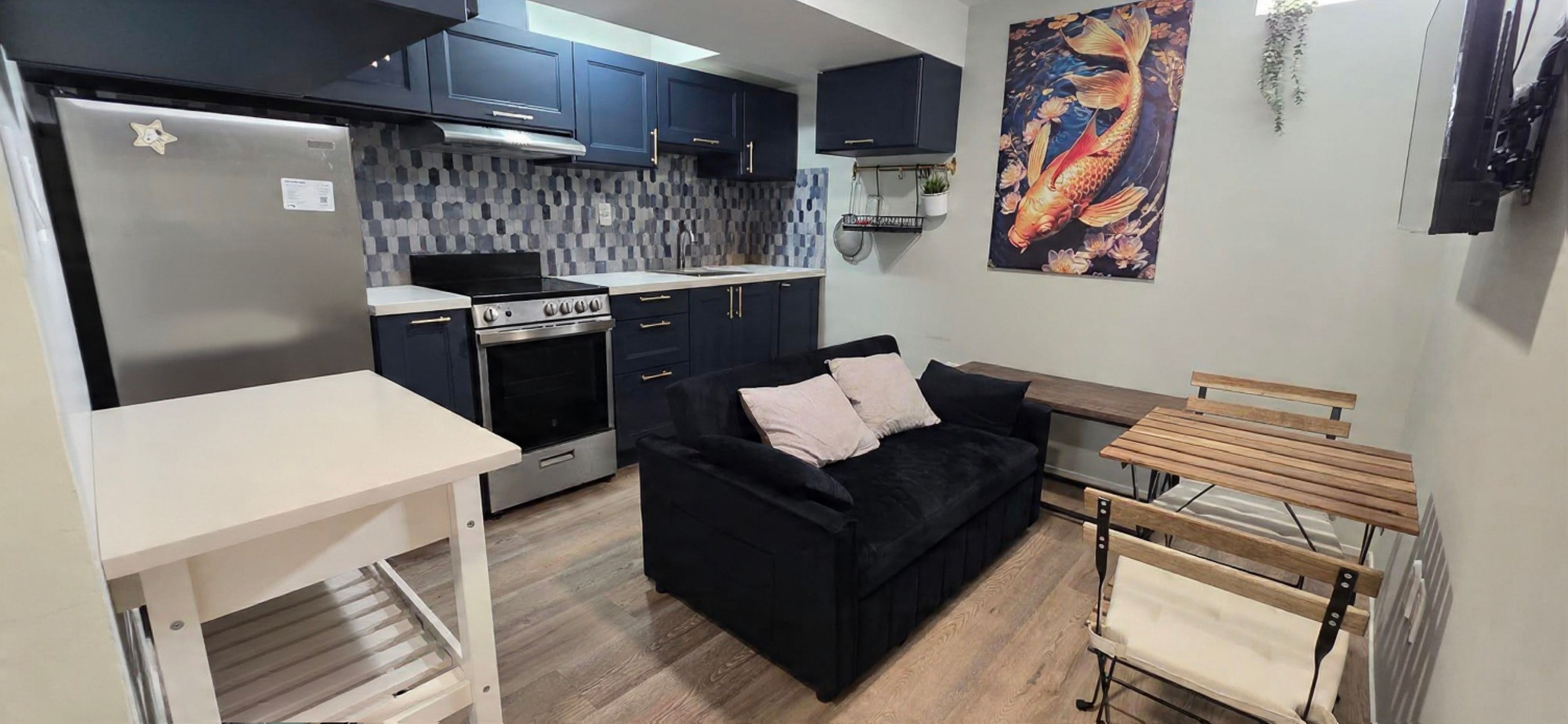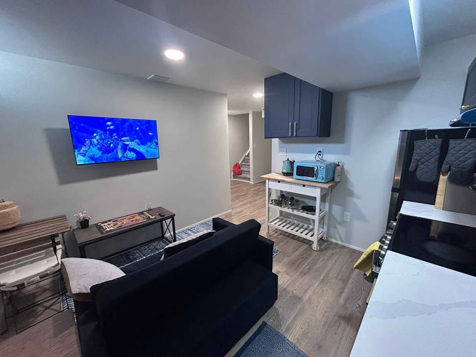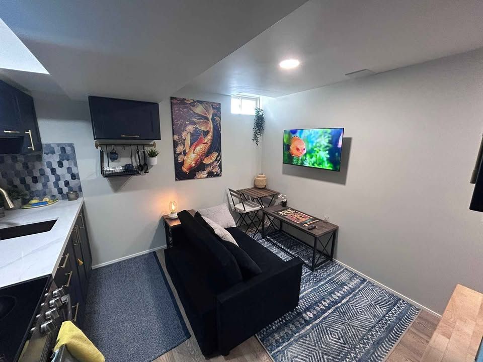 • Finished basement with separate entrance, bedroom, living space, and kitchen.