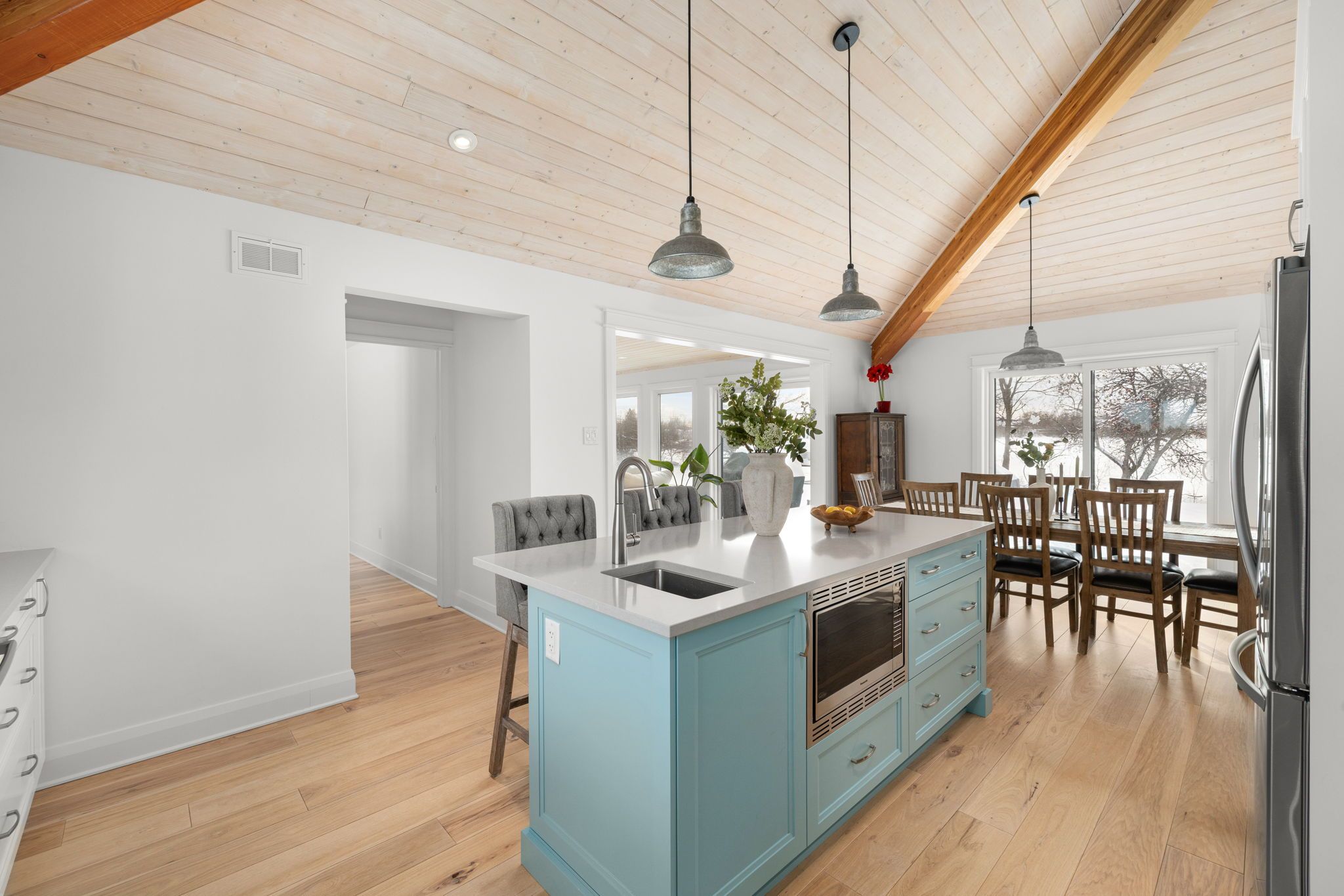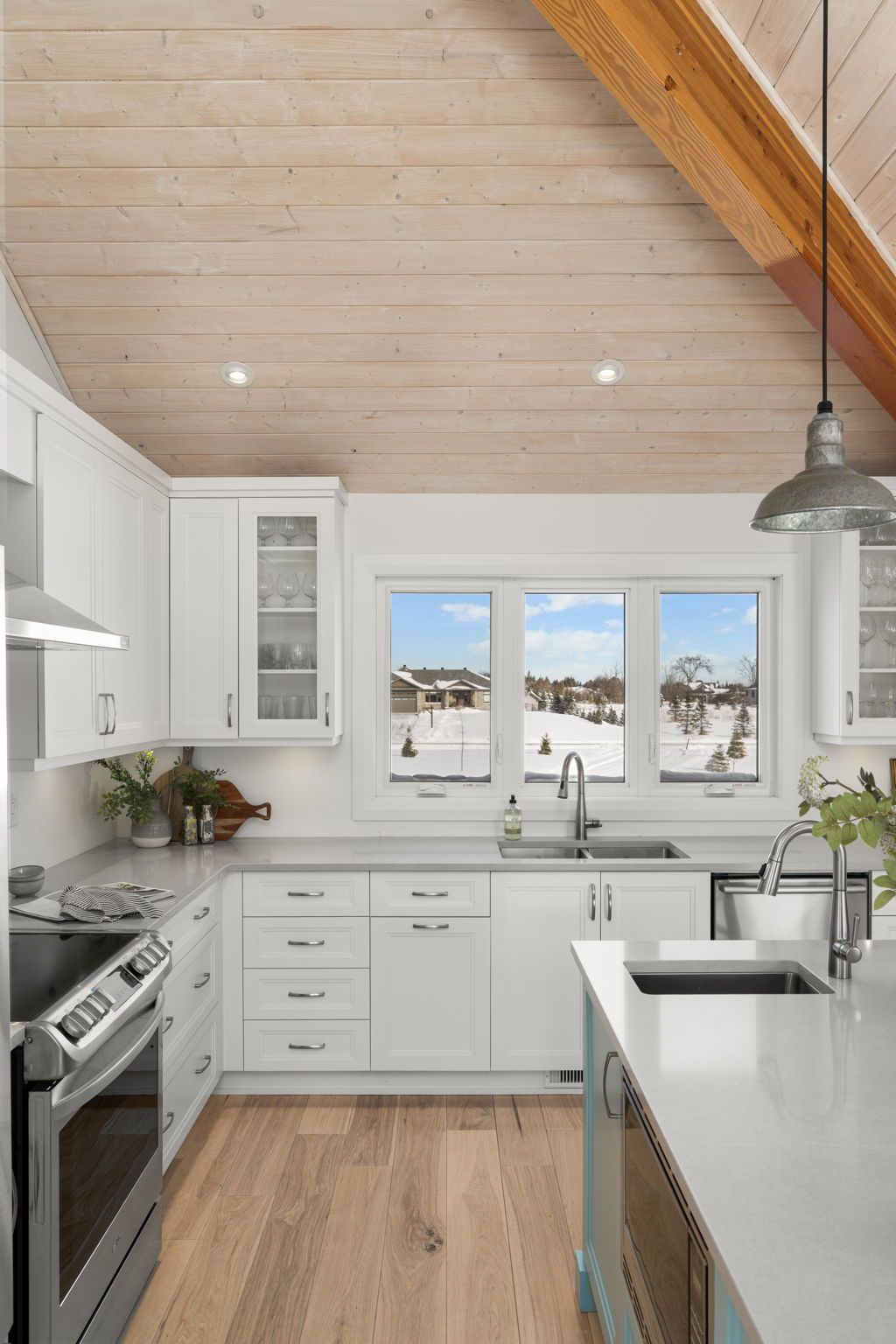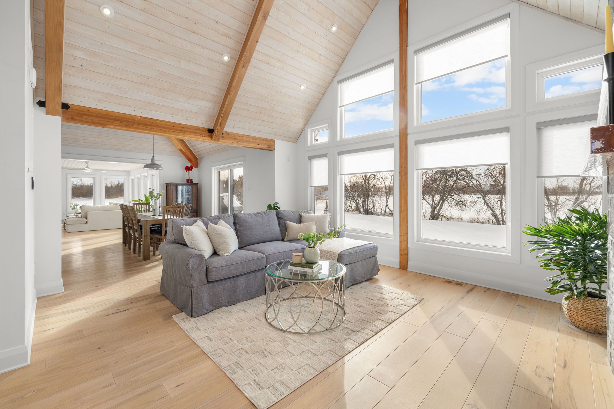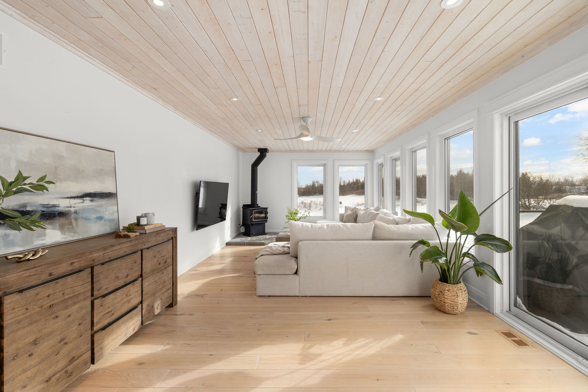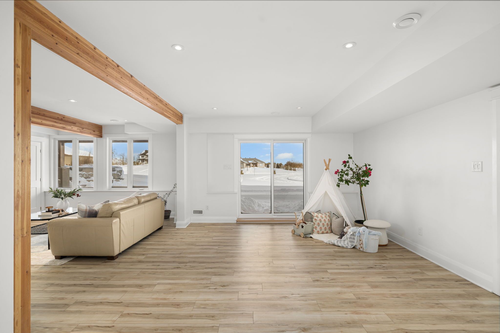 Sitting on just under two acres of beautifully landscaped grounds, this extraordinary custom-built reverse walkout bungalow offers a rare blend of architectural elegance, refined craftsmanship, and serene natural beauty. Built by linwood, this residence is a masterclass in luxury living, where every element has been thoughtfully curated for both style and function. The stunning entrance way greets you with dramatic 16-foot vaulted pine ceilings, exposed douglas fir beams, and rich hickory hardwood flooring-creating a striking yet inviting ambiance. The expansive, light-filled great room seamlessly connects to a designer chef's kitchen, appointed with premium appliances, quartz surfaces, and an oversized island that serves as both a culinary workspace and a sophisticated gathering point. Designed for elevated everyday living and effortless entertaining, the home offers a seamless indoor-outdoor connection through expansive windows and three patio doors which all lead to a deck that spans the rear of the home. The fully finished walkout lower level continues the home's refined aesthetic, featuring 9-foot ceilings, two generously sized bedrooms, and a spa-calibre bathroom designed for ultimate relaxation. A versatile living area provides endless possibilities-whether as a private fitness studio, media lounge, or games retreat. Outdoors, the property transforms into a tranquil estate setting, complete with curated landscaping, newly planted trees, and elegant brownstone rock walls. Ideally located just minutes from stittsville and carleton place, with quick access to major routes, this exceptional property delivers the perfect balance of exclusivity and convenience. A distinguished offering for the buyer who appreciates luxury, craftsmanship, and setting come together in perfect harmony.