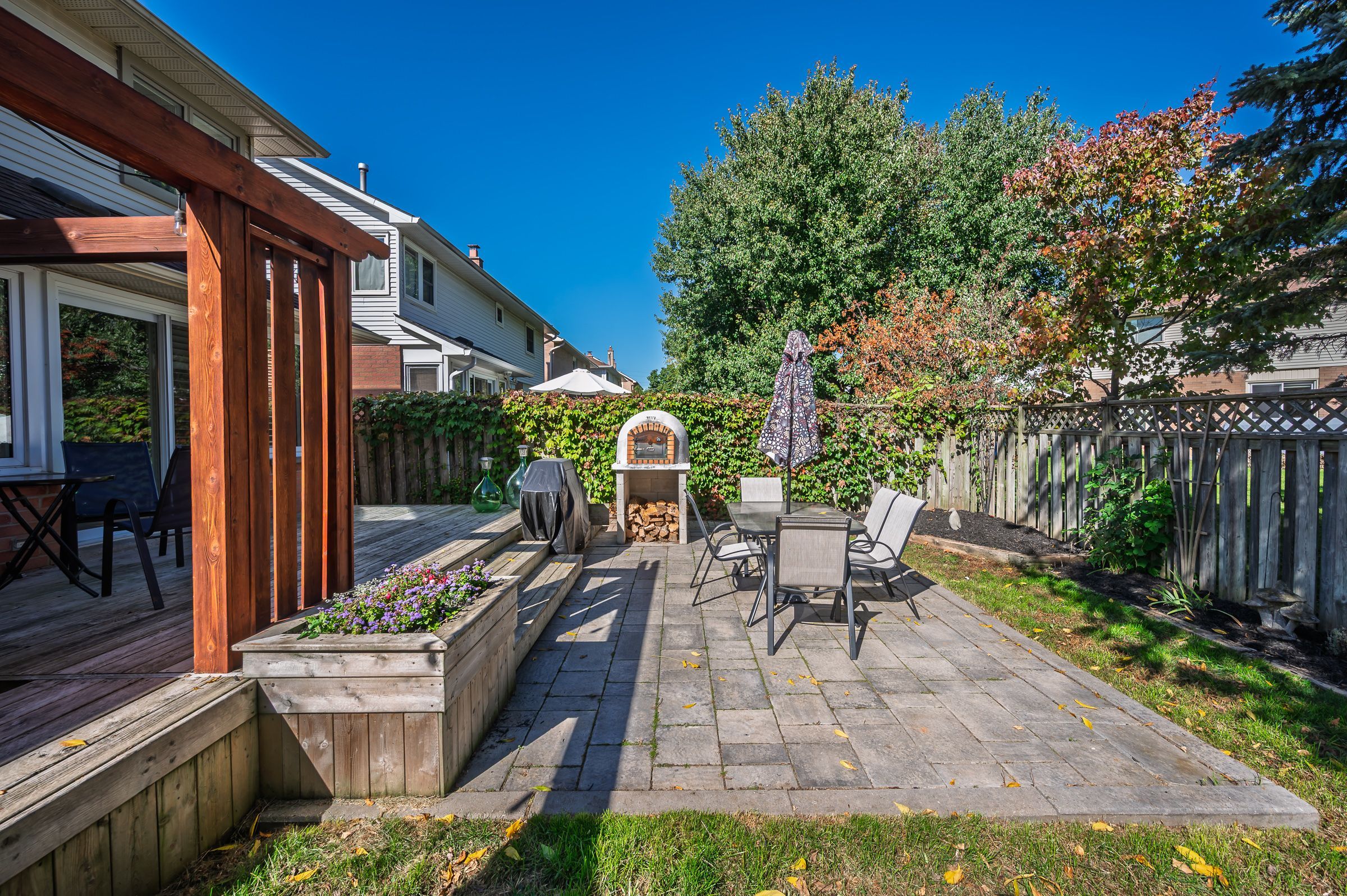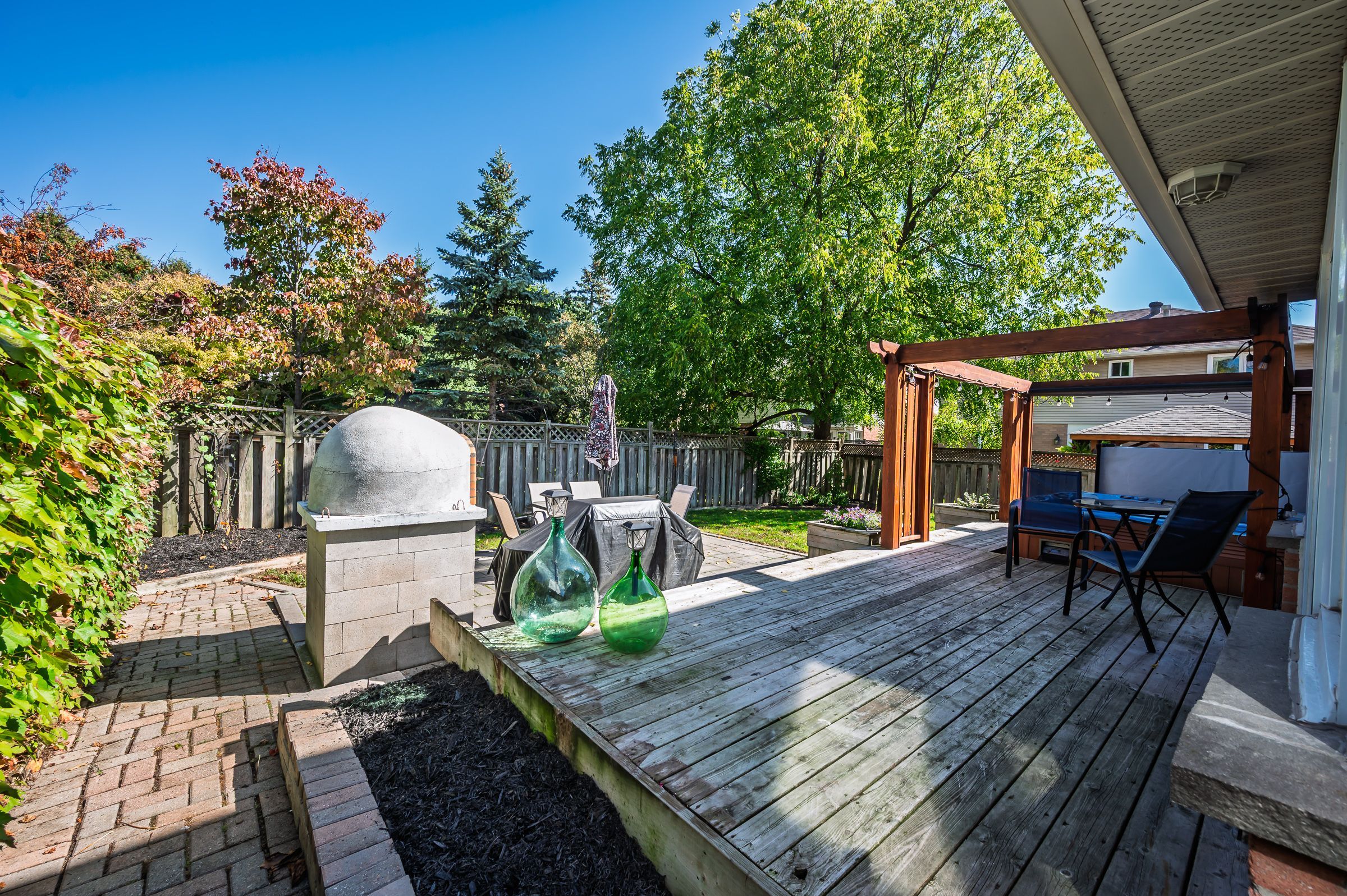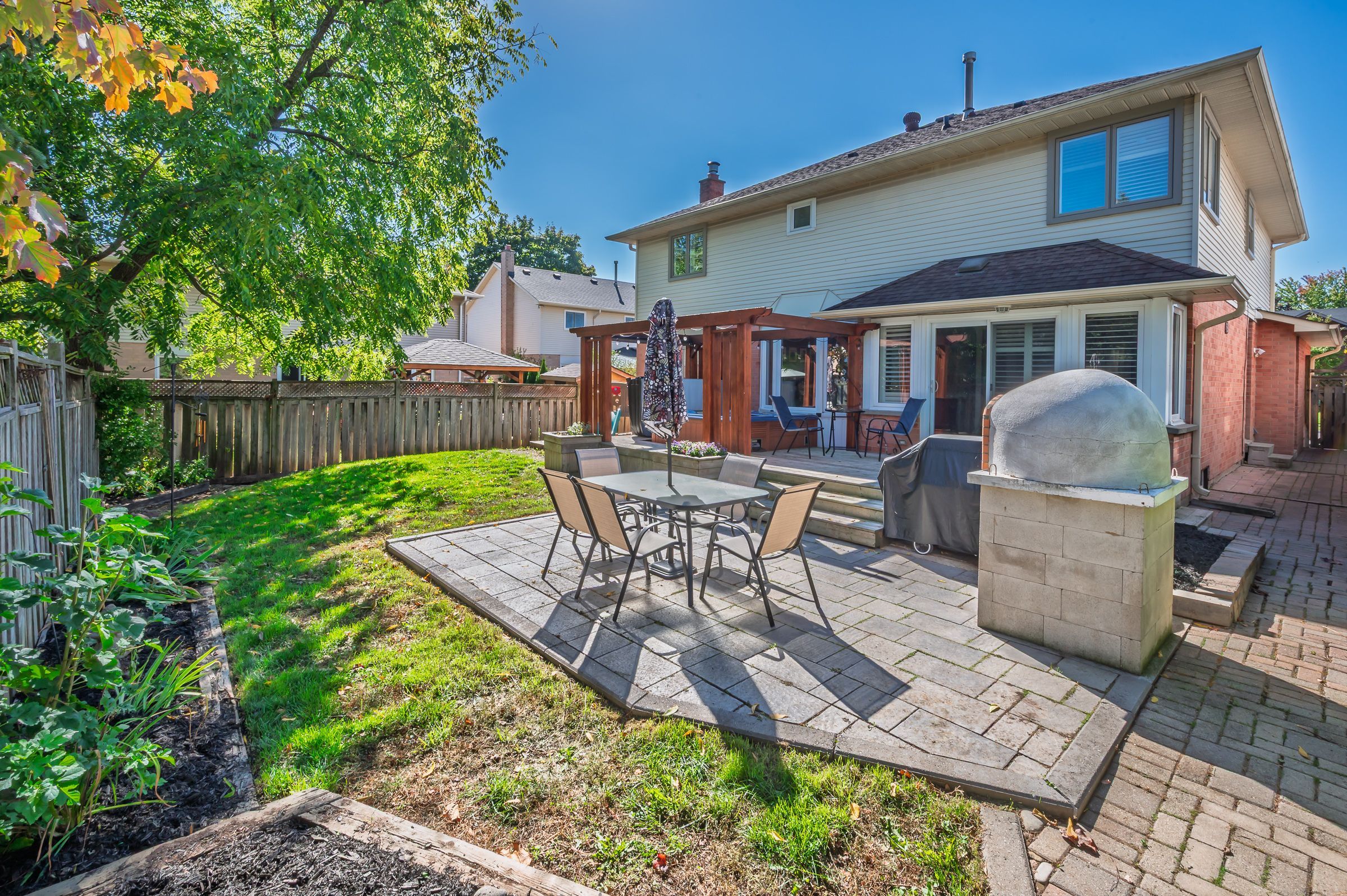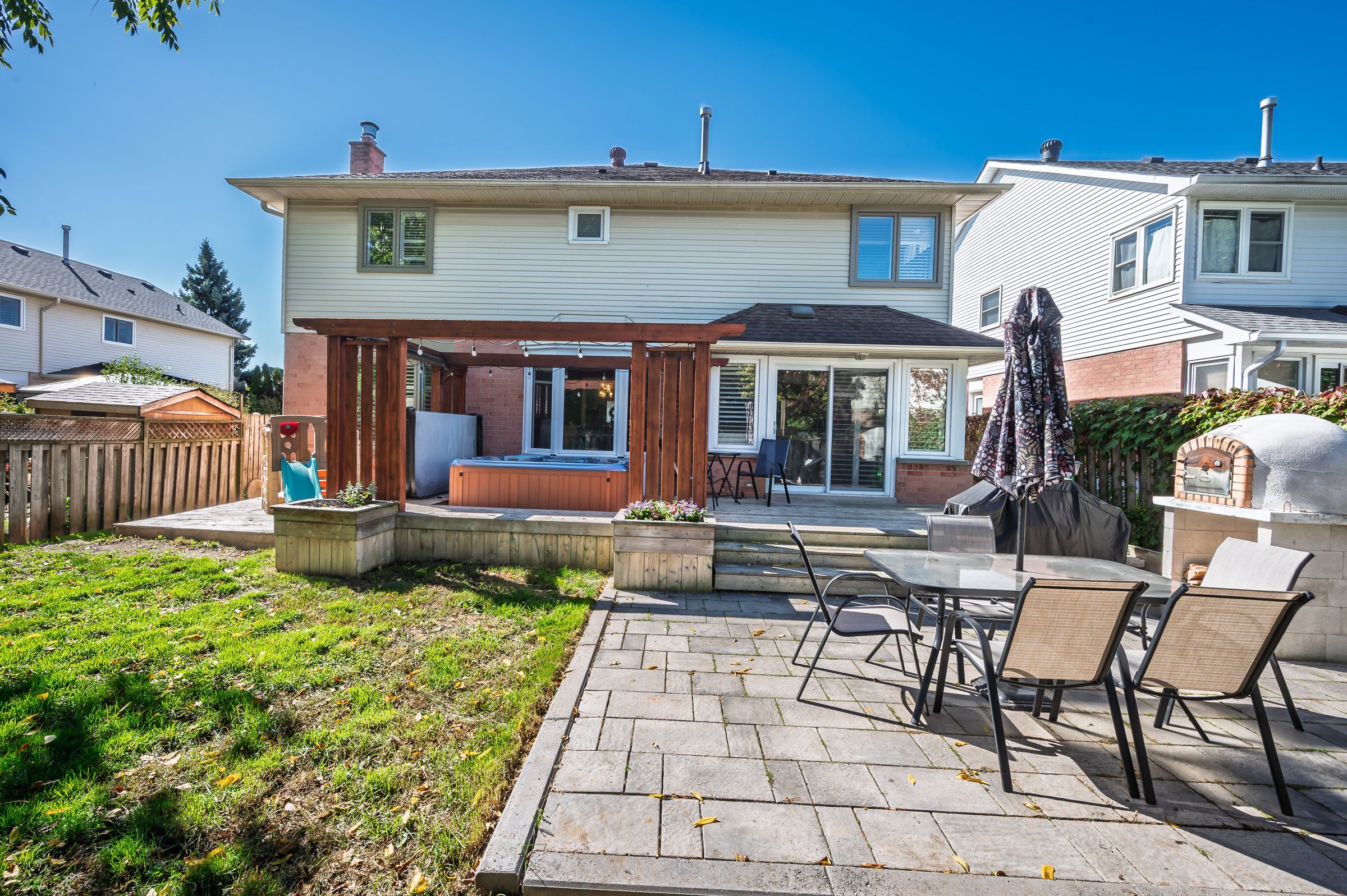 • Backyard features a hot tub and outdoor oven for relaxation and entertaining.