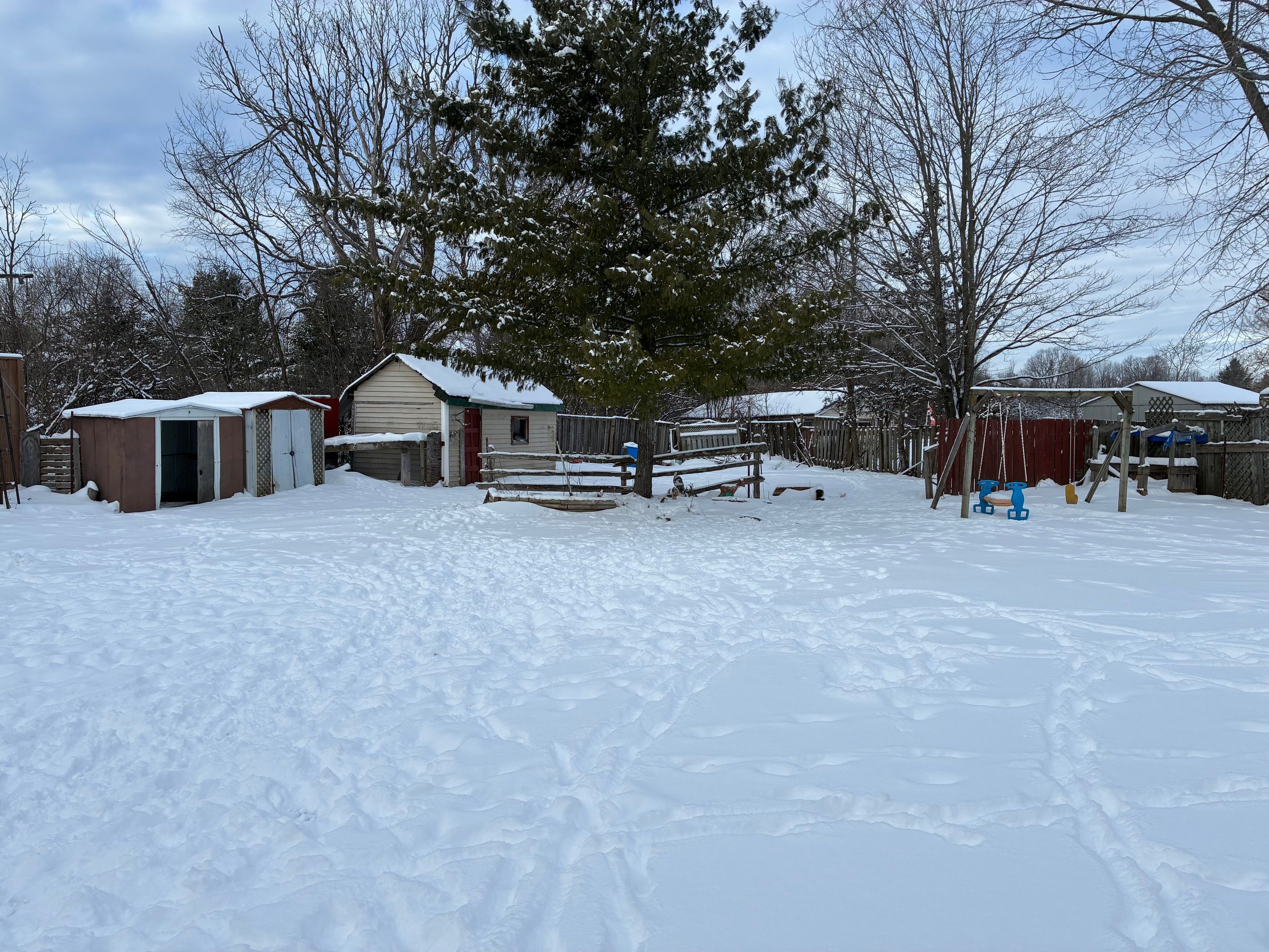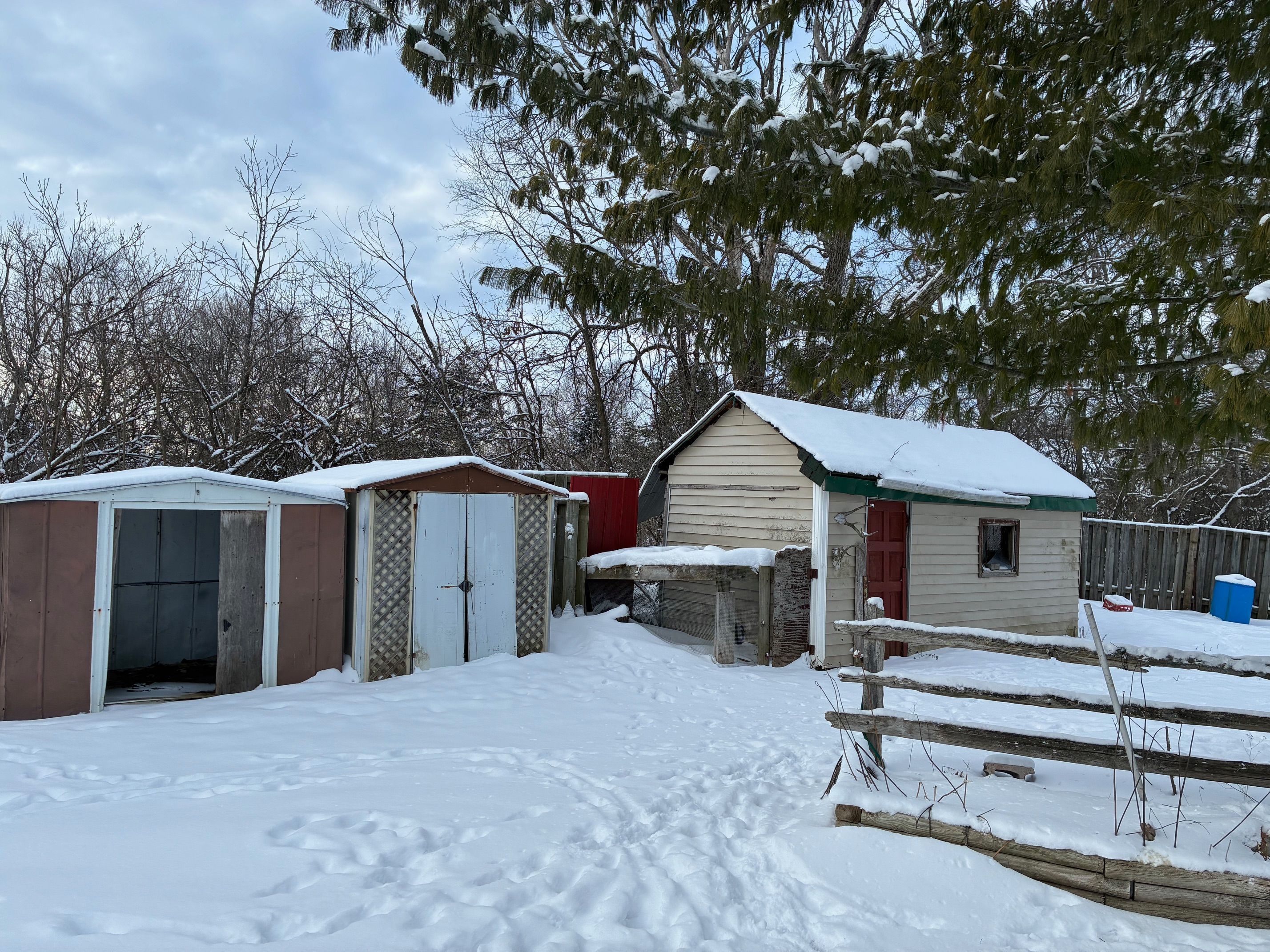 • Located on a 1/2 acre fenced lot with multiple sheds and a pet coop.