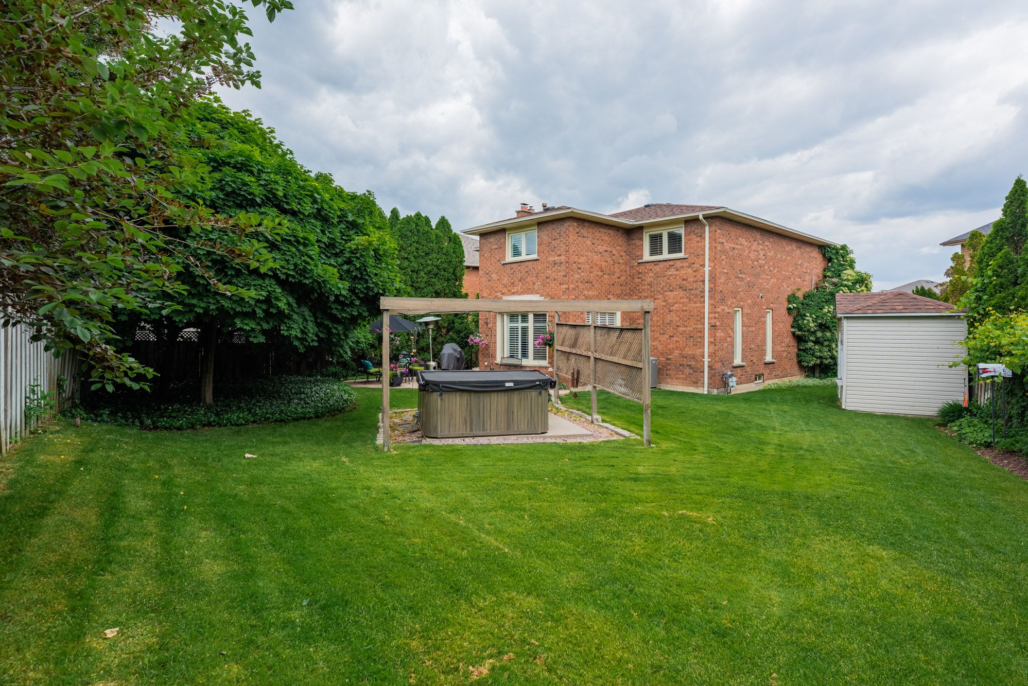 Exceptional pie-shaped lot - over 90 feet wide! Steps to credit valley hospital. Nestled on a tranquil cul-de-sac, this charming greenpark homes - mark 3 model offers an expansive pie-shaped lot, stretching over 90 feet across the backyard, providing unparalleled space and seclusion. The meticulously landscaped front yard, adorned with mature trees and climbing greenery, guides you to a stamped concrete driveway and a welcoming covered porch illuminated by classic lantern-style lights. Upon entering, a bright foyer featuring slate-tiled flooring and wainscoting leads to formal living and dining areas, setting the tone for the home's refined aesthetic. The open-concept layout boasts hardwood floors, a bay window, and french doors, creating an inviting space ideal for entertaining. The chef-inspired kitchen is equipped with granite countertops, shaker-style cabinetry, premium appliances, and a wine fridge, complemented by a sunny breakfast nook with bay and picture windows. The cozy living room, centred around a gas fireplace, offers a sliding door walk-out to the private, fully fenced backyard. The expansive backyard serves as a private retreat, featuring a stamped concrete patio, natural stone walkway, and a hot tub under a cabana-style frame. A professionally installed sprinkler system ensures the front and back yards remain lush and well-watered, enhancing the home's curb appeal and reducing maintenance efforts. Upstairs, four generously sized bedrooms with ample closet space and plush carpeting await. The primary suite is a serene haven, complete with a well-appointed 5-piece ensuite. The unfinished basement presents endless potential, offering space for a workshop, recreational area, and wine racks. Additional features include a two-car garage with interior access. This delightful home offers a rare combination of charm, livability, and space in a peaceful, well-established neighbourhood.