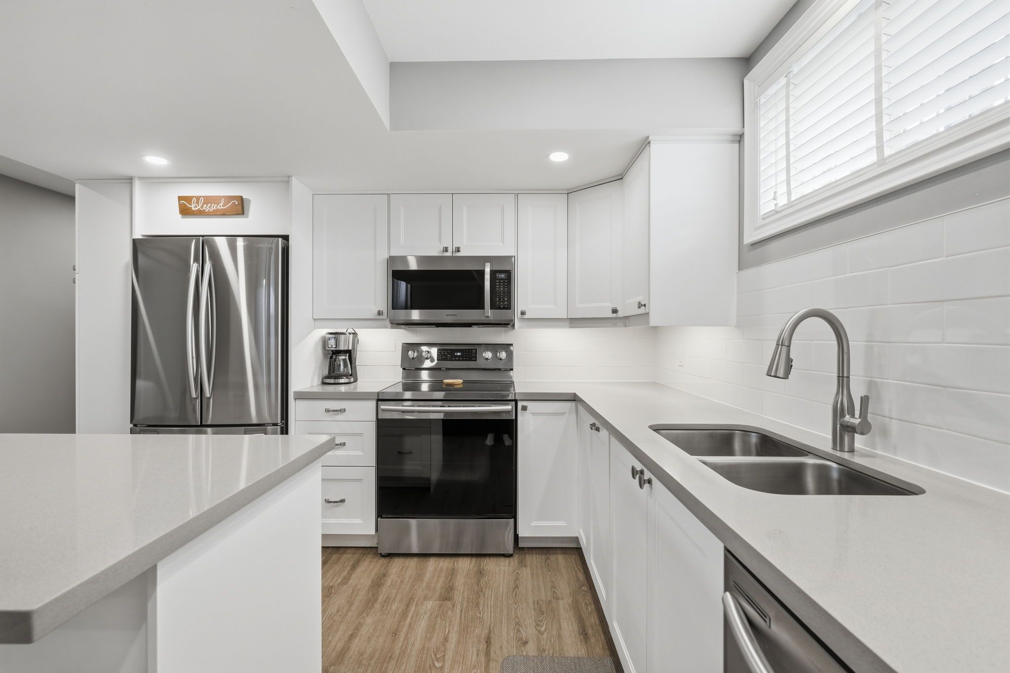 • Chef's kitchen with quartz countertops and stainless steel appliances.