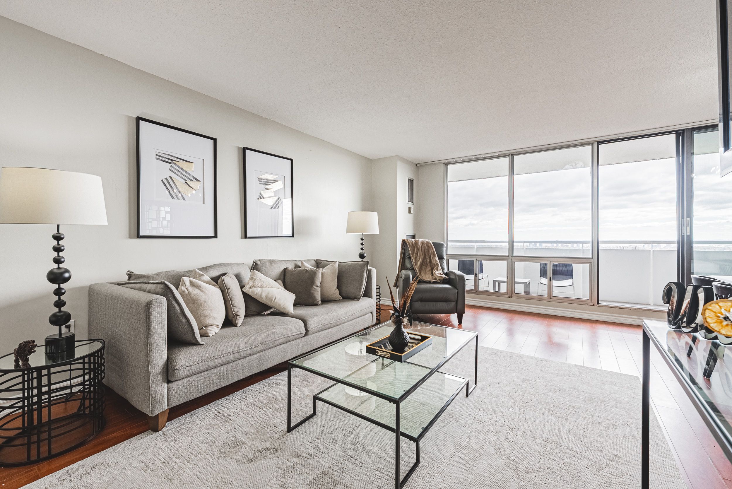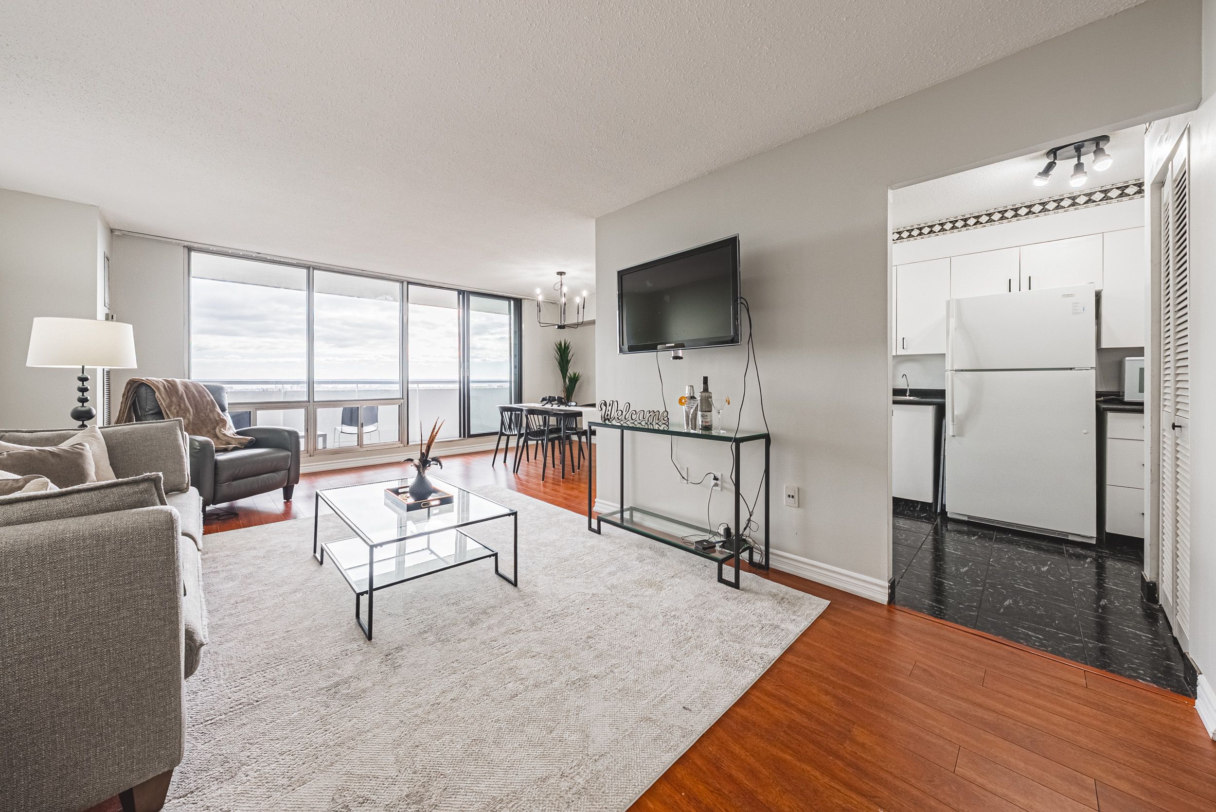 Take in that view. This spacious, south-facing two-bedroom suite features a generous living room-ideal for entertaining, catching the game with friends and family, or hosting an intimate dinner. With the lake as your stunning backdrop, the setting is truly captivating. For added convenience, the unit includes in-suite laundry, ample storage, and an additional ground-floor locker. One exclusive parking space is included, with a second available for a modest monthly fee. Ideally located just a short walk from shopping, public transit, parks, and places of worship-and offering quick access to major highways-this condo delivers exceptional connectivity and everyday ease. Residents also enjoy a warm, vibrant community within the building. The condo fee is all-inclusive, covering heat, hydro, water, central air conditioning, bell fibe tv, a portion of internet, as well as exterior maintenance, building insurance, common elements, parking, and guest parking. Experience comfort, convenience, and community in one exceptional package-welcome home