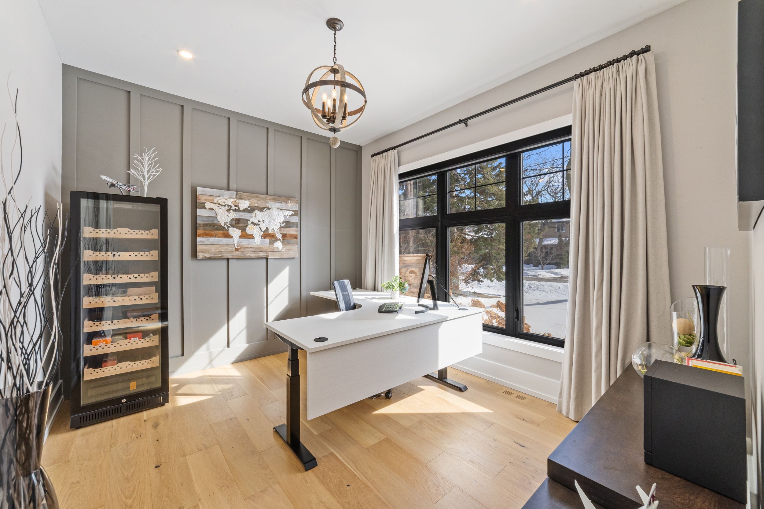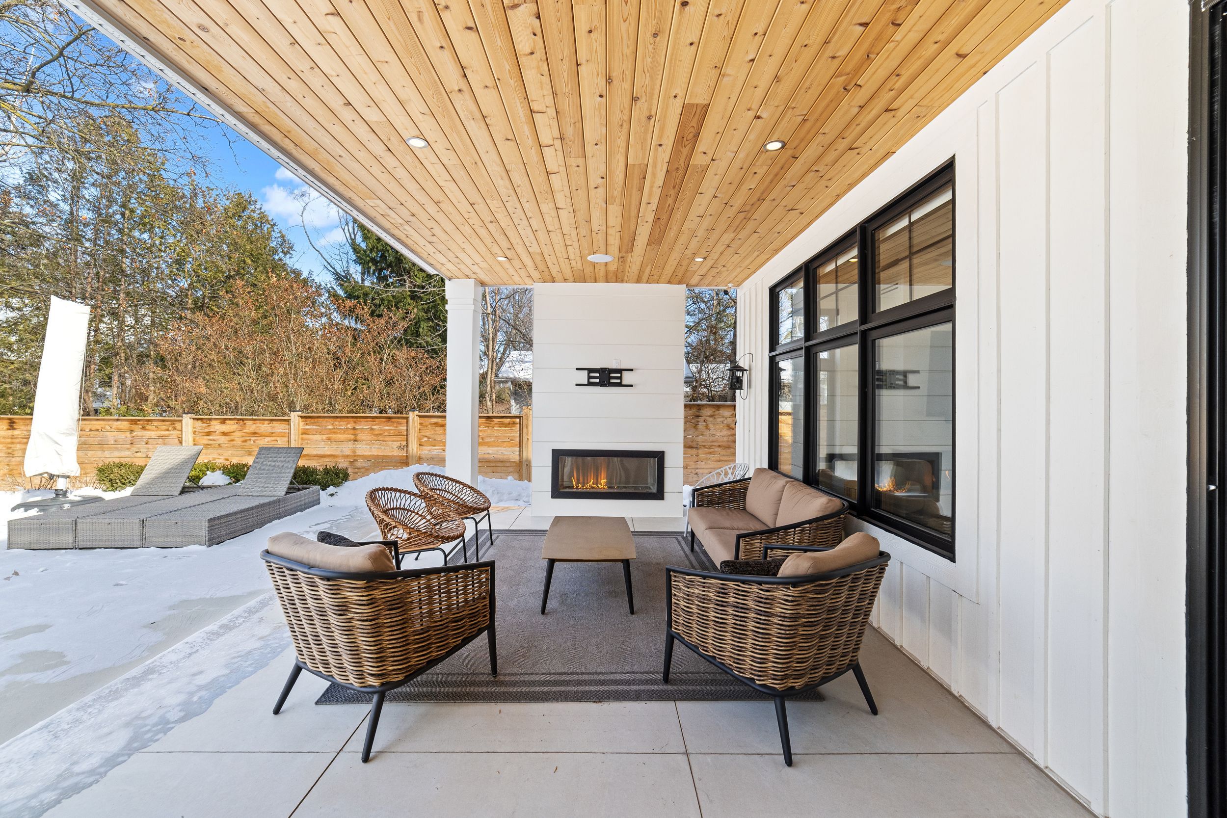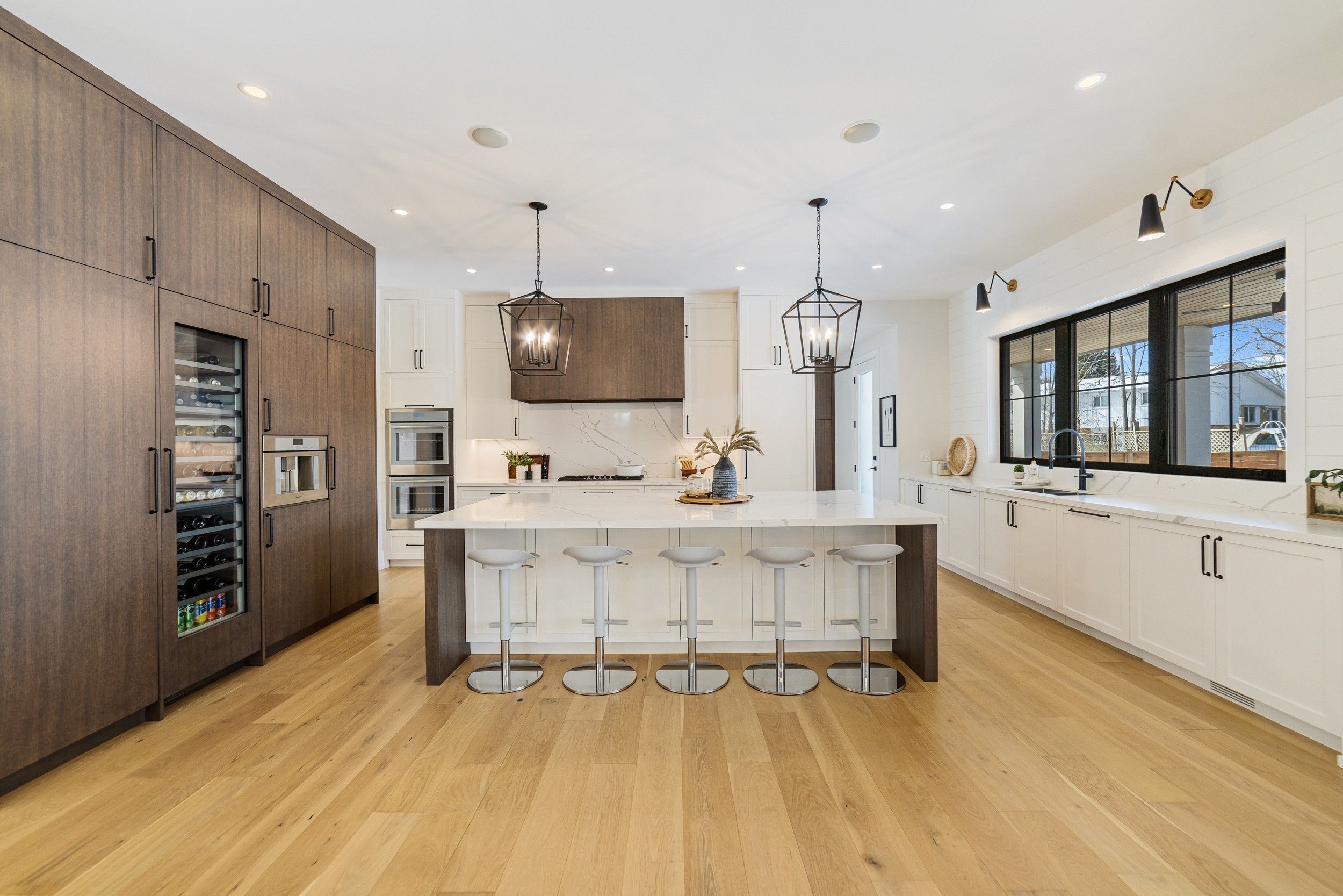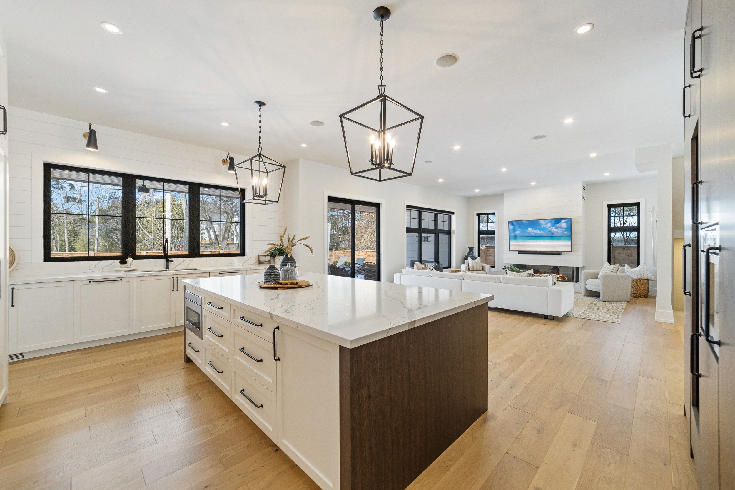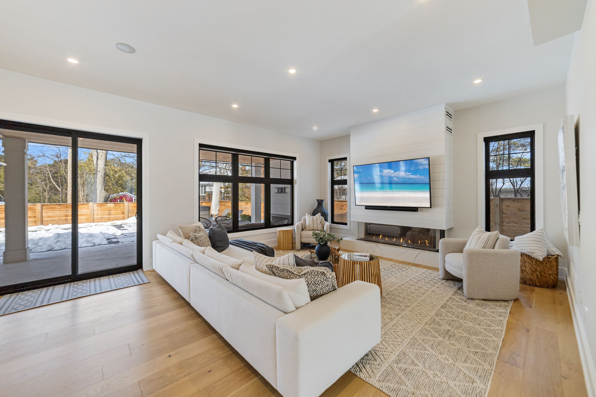 Stunning custom modern farmhouse (2022/2023) set on an expansive 85 x 133 ft lot on a quiet, family-friendly street just steps to the lake, bronte harbour, and coronation park. This exceptional residence blends sophisticated design with premium finishes and state-of-the-art functionality throughout. The open-concept main floor showcases soaring 10 ft ceilings, integrated ceiling speakers, designer farmhouse lighting, and automatic shutters. Sun-filled dining room with accent wall flows seamlessly into a showpiece chef's kitchen featuring thermador appliances, dual wall ovens, 36" cooktop, integrated fridge, built-in coffee maker, dishwasher, and a gaganeau wine fridge with 150-bottle capacity. The oversized island with custom storage and microwave drawer is complemented by a fully outfitted walk-in pantry with bespoke cabinetry and full-size stand-alone freezer. The family room is anchored by a dramatic three-sided 60" napoleon glass fireplace with custom millwork. A private office, two elegant powder rooms, & a custom mudroom with backyard access complete the level. Upstairs offers 9 ft ceilings, skylit hallways, and four spacious bedrooms with walk-in closets and automatic shutters. The luxurious primary suite features custom barn doors, an expansive 12' x 11' dressing room, and a spa-inspired 5-pc ensuite. Two additional bathrooms, including a jack & jill, and a well-appointed laundry room provide exceptional convenience. The finished lower level adds approx. 1,500 sq ft of finished space with a gym, 5th bedroom, full bath, and recreation space with built-ins. Advanced hvac, smart home integration, and ample storage complete the space. The private backyard oasis features a full-width covered living area with gas fireplace and outdoor kitchen with gas bbq, heated saltwater pool with built-in bench, hot tub, cabana, professional landscaping, lighting, and irrigation. A heated, professionally finished double garage with tesla charger completes this remarkable home.