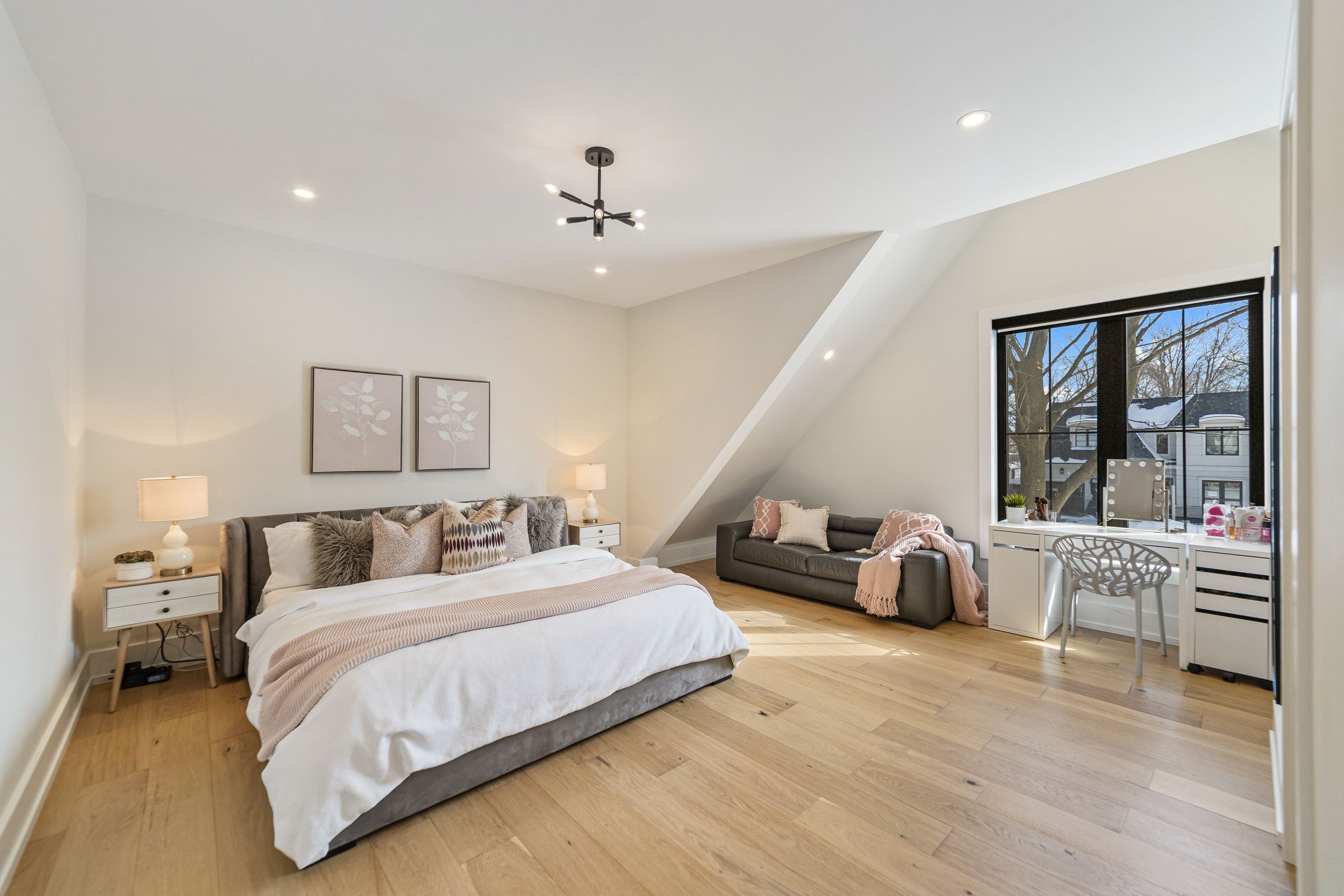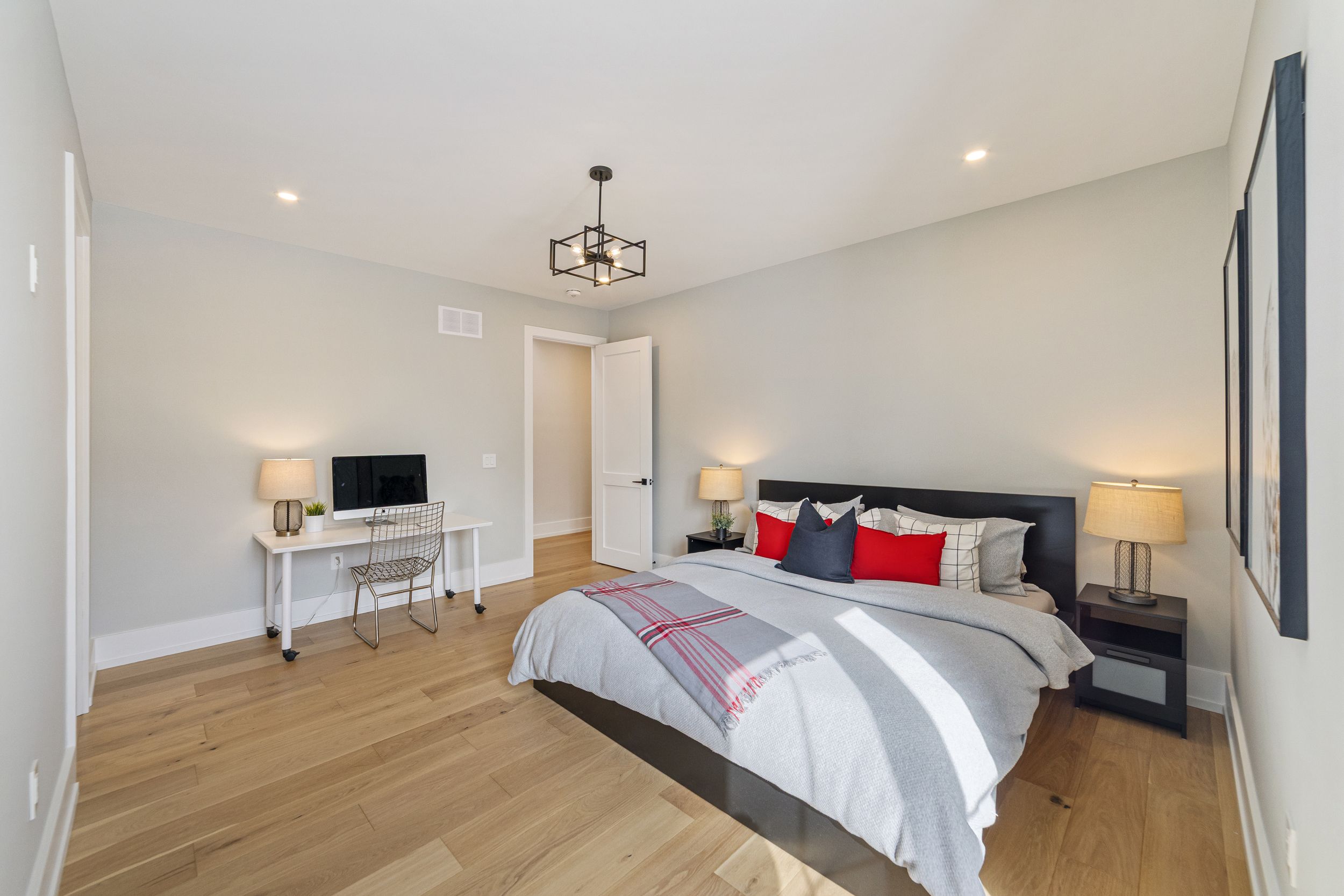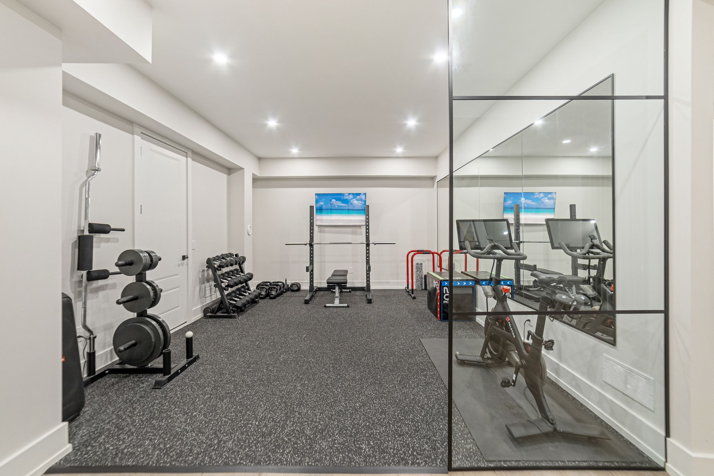 • Finished lower level includes a gym, extra bedroom, and recreational space.