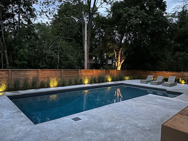 • Private backyard oasis with a heated saltwater pool, outdoor kitchen, and cabana.