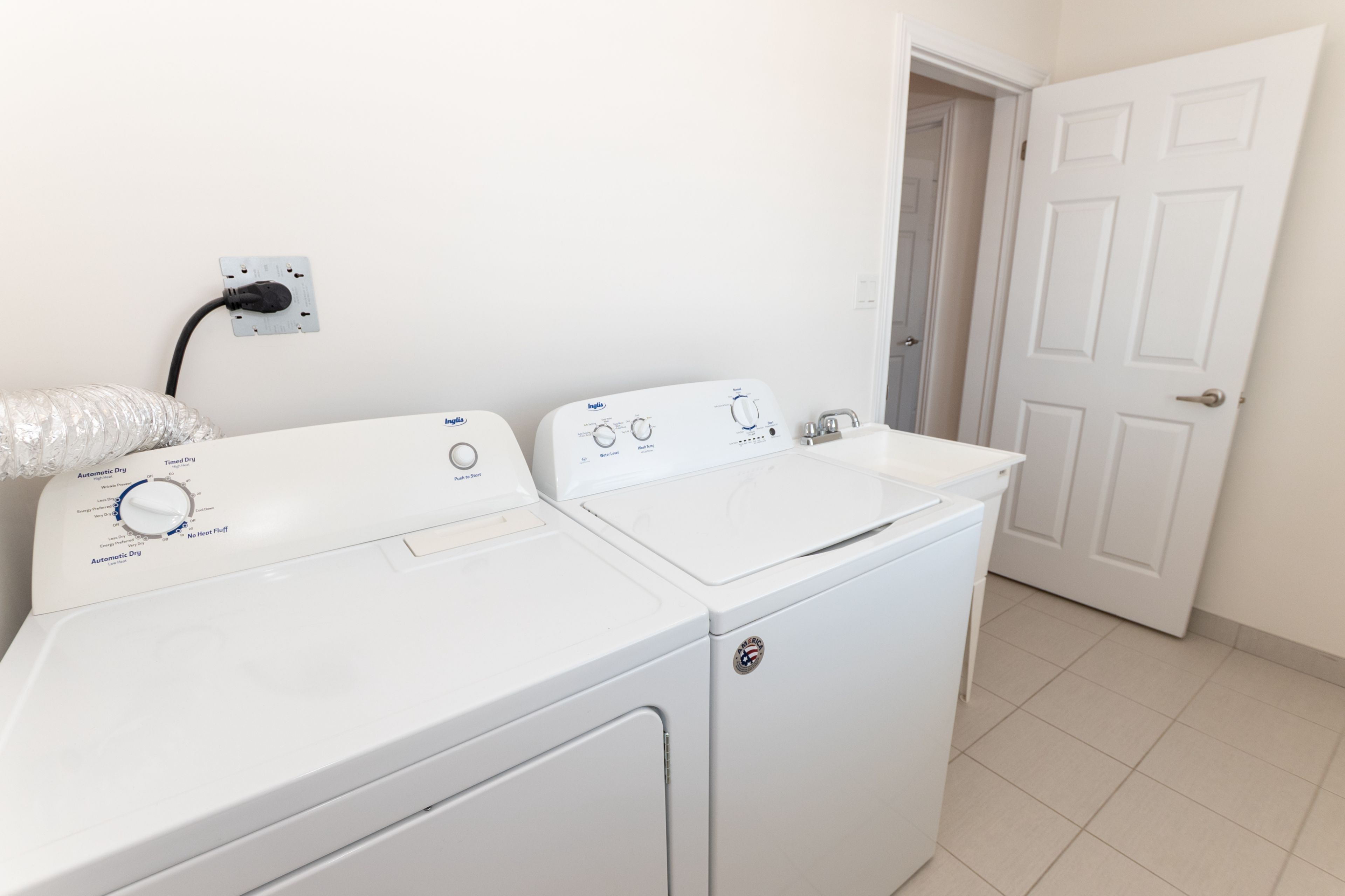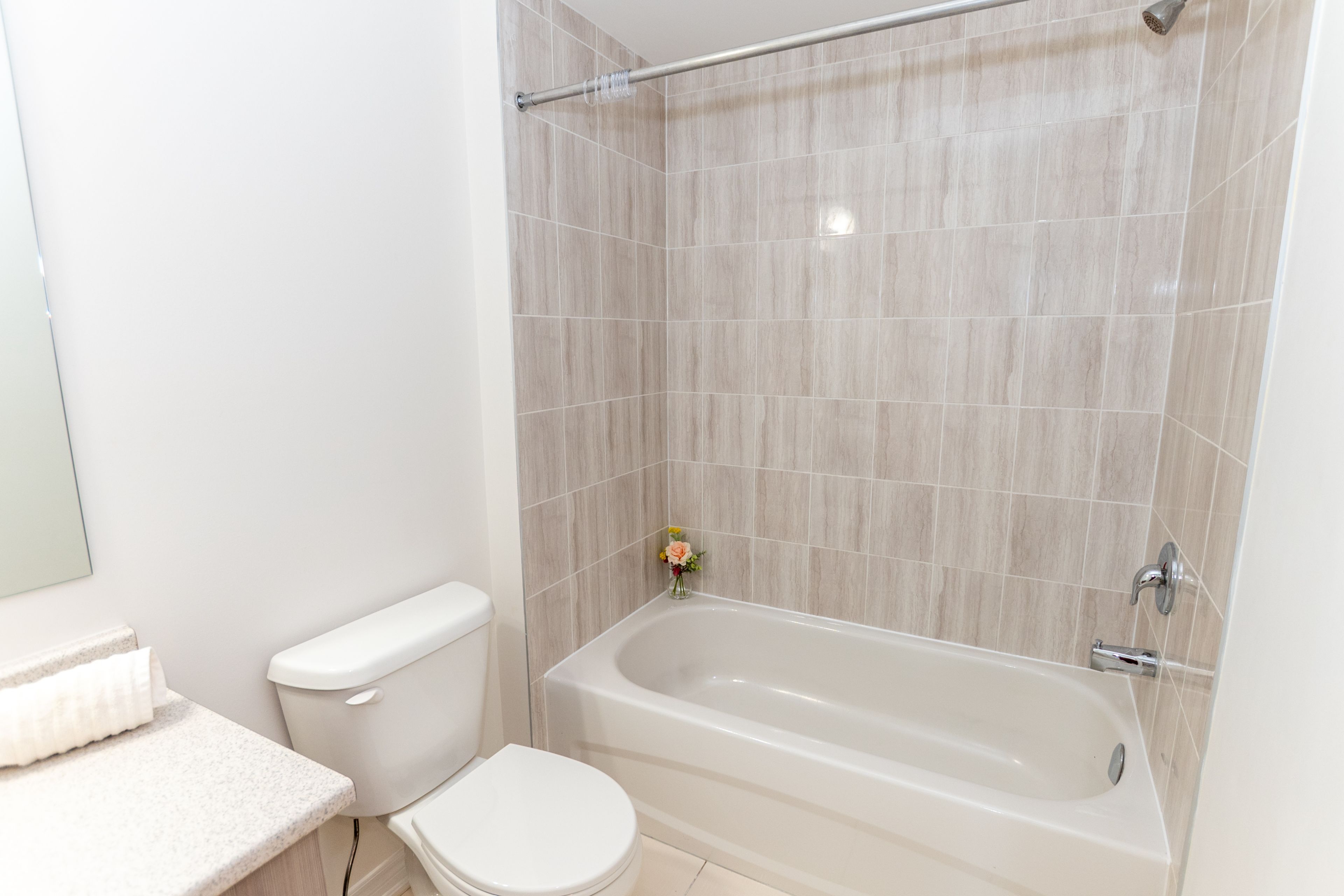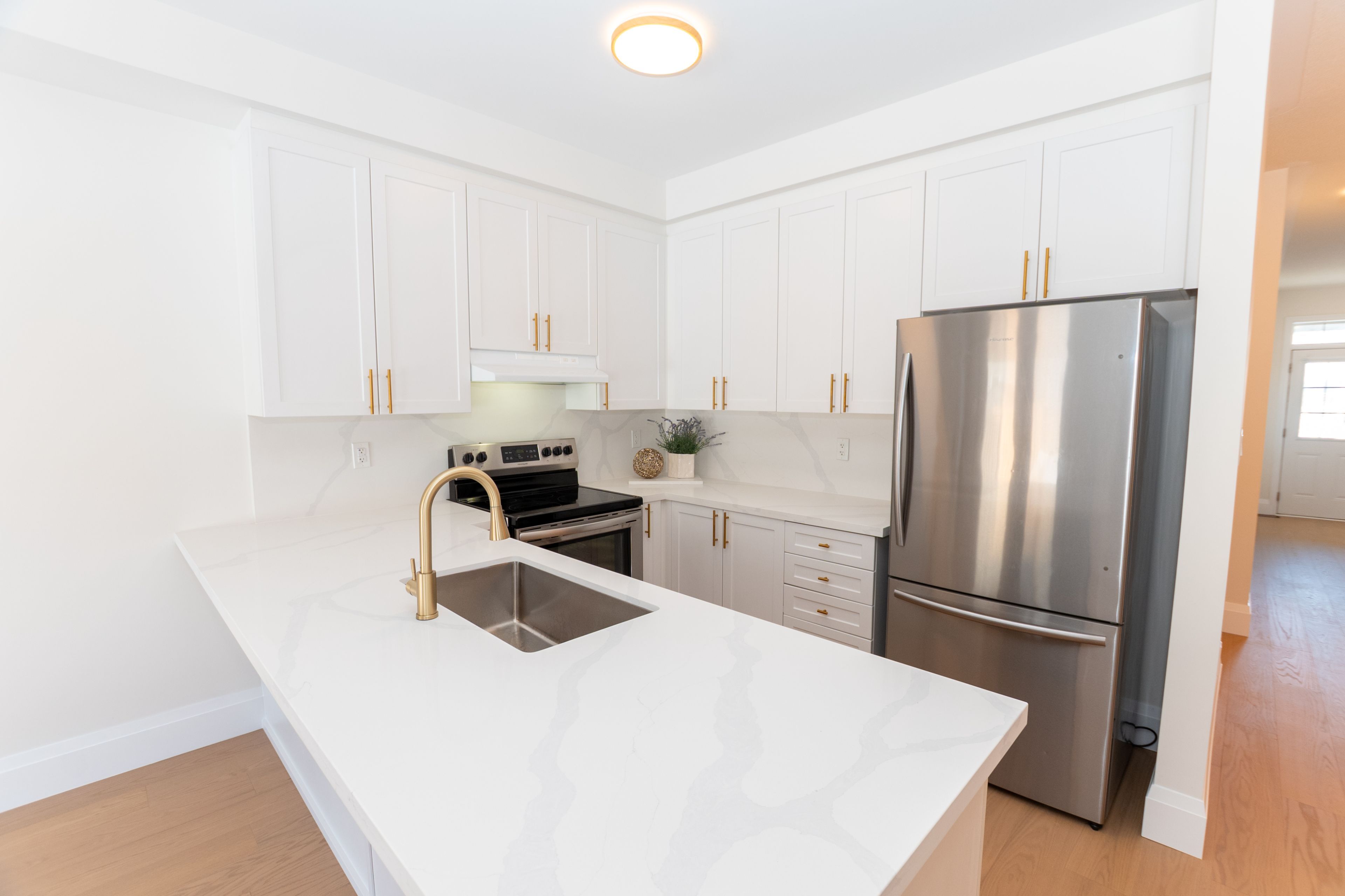 • Stylish white kitchen with quartz countertops and stainless steel appliances.